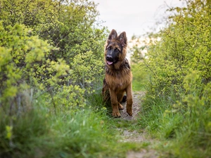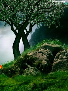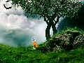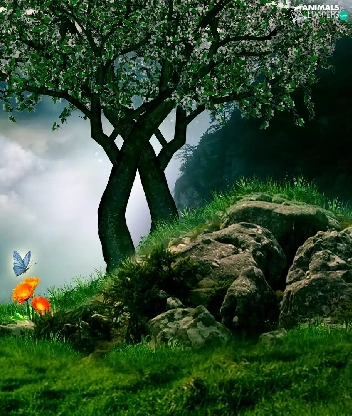 Bird, butterfly, Meadow, clouds, trees, Flower