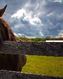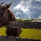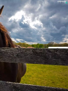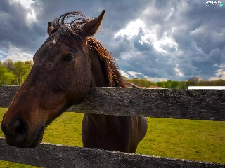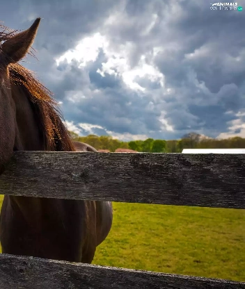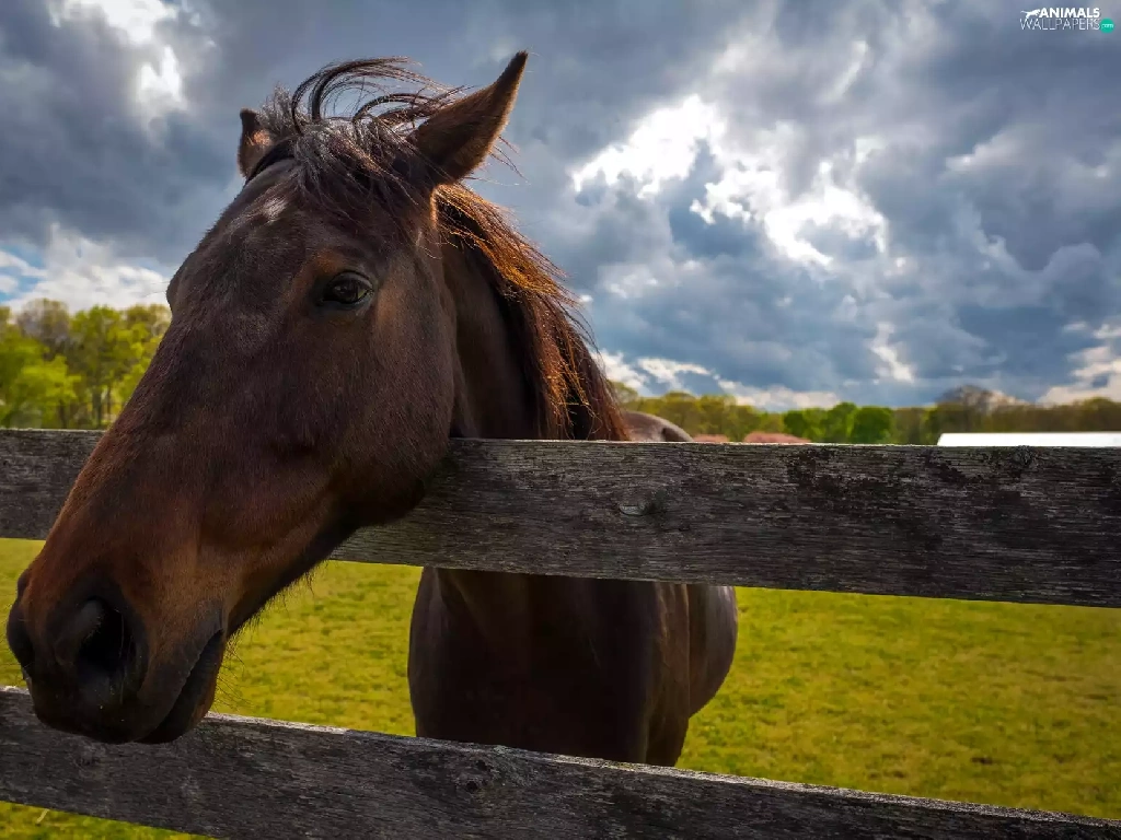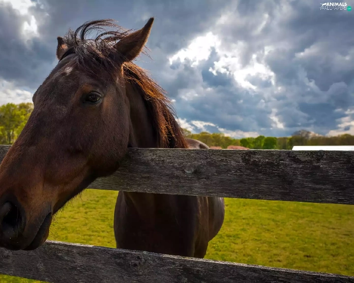 Meadow, clouds, head, fence, Horse
