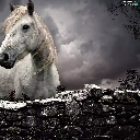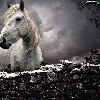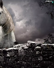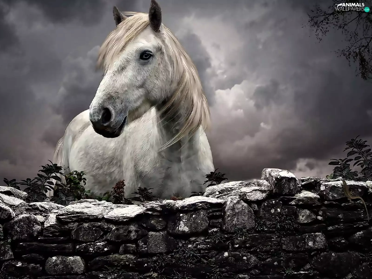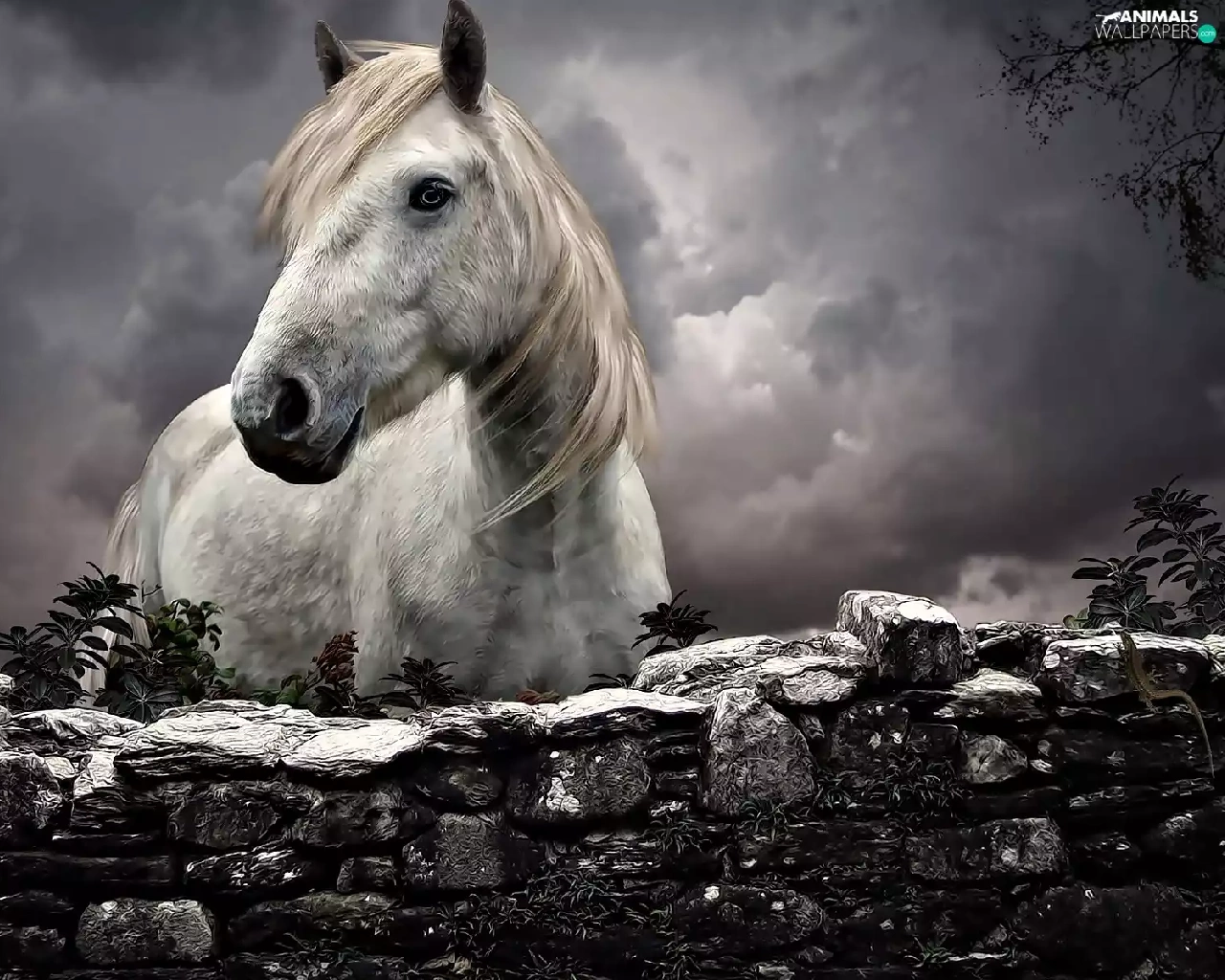 fence, clouds, Horse, stone, White
