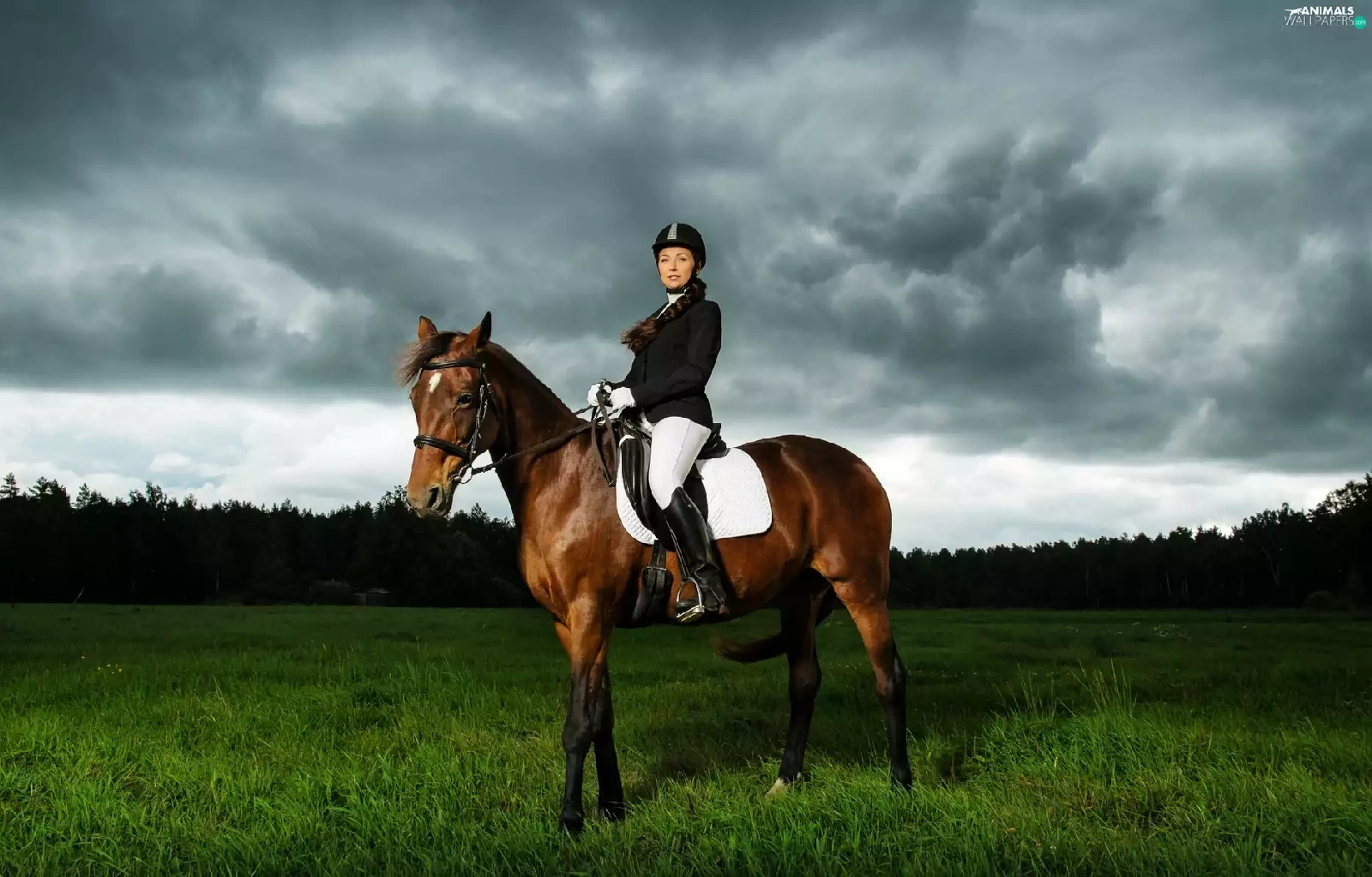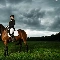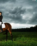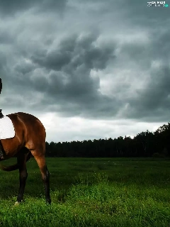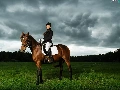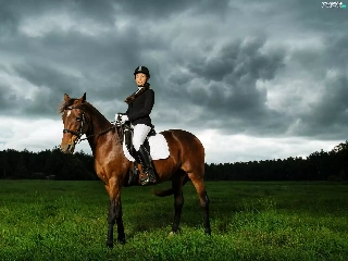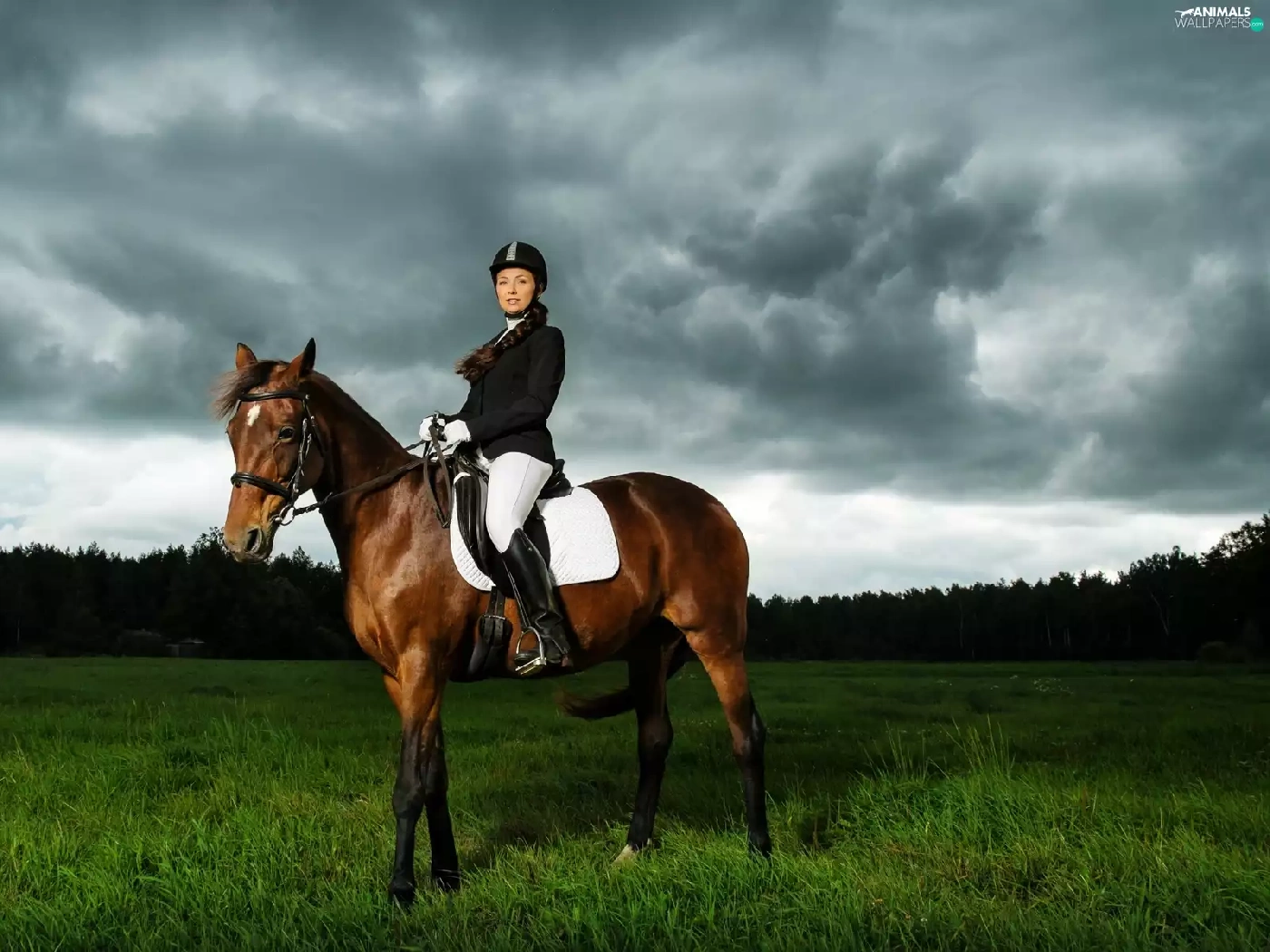 Horse, Women, forest, clouds, Meadow, Jockey