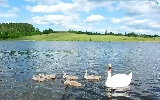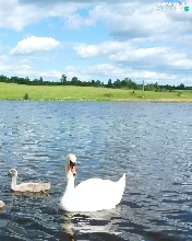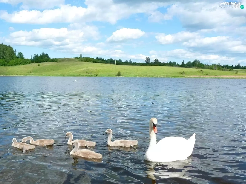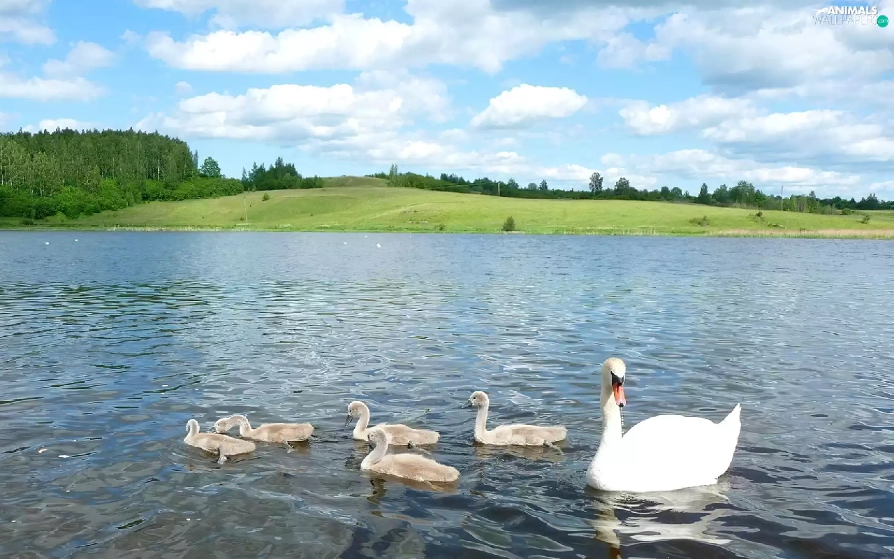 viewes, clouds, lake, trees, Swan