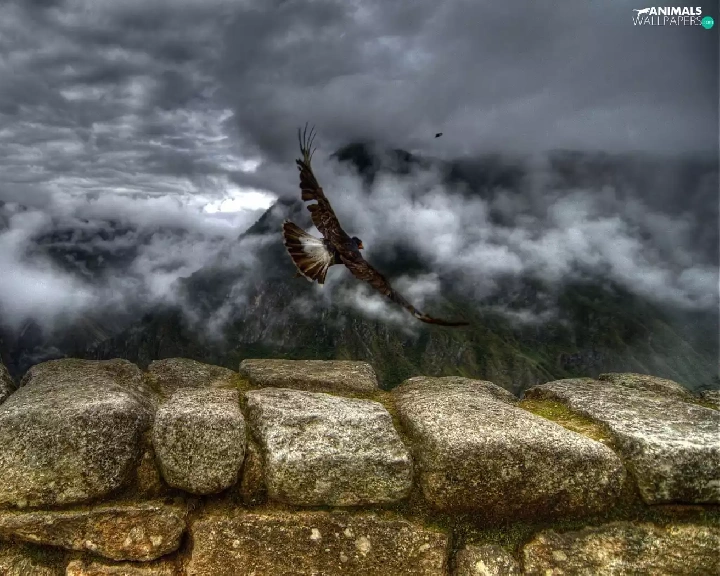 clouds, eagle, Stones