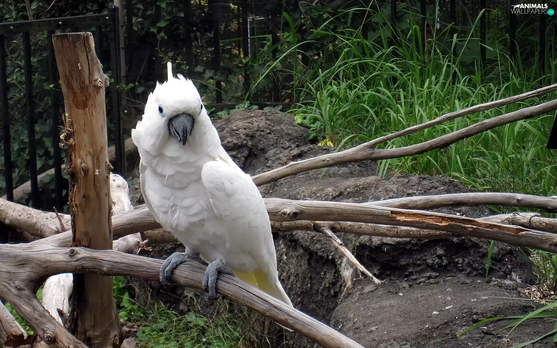 parrot, branches, rocks, cockatoo