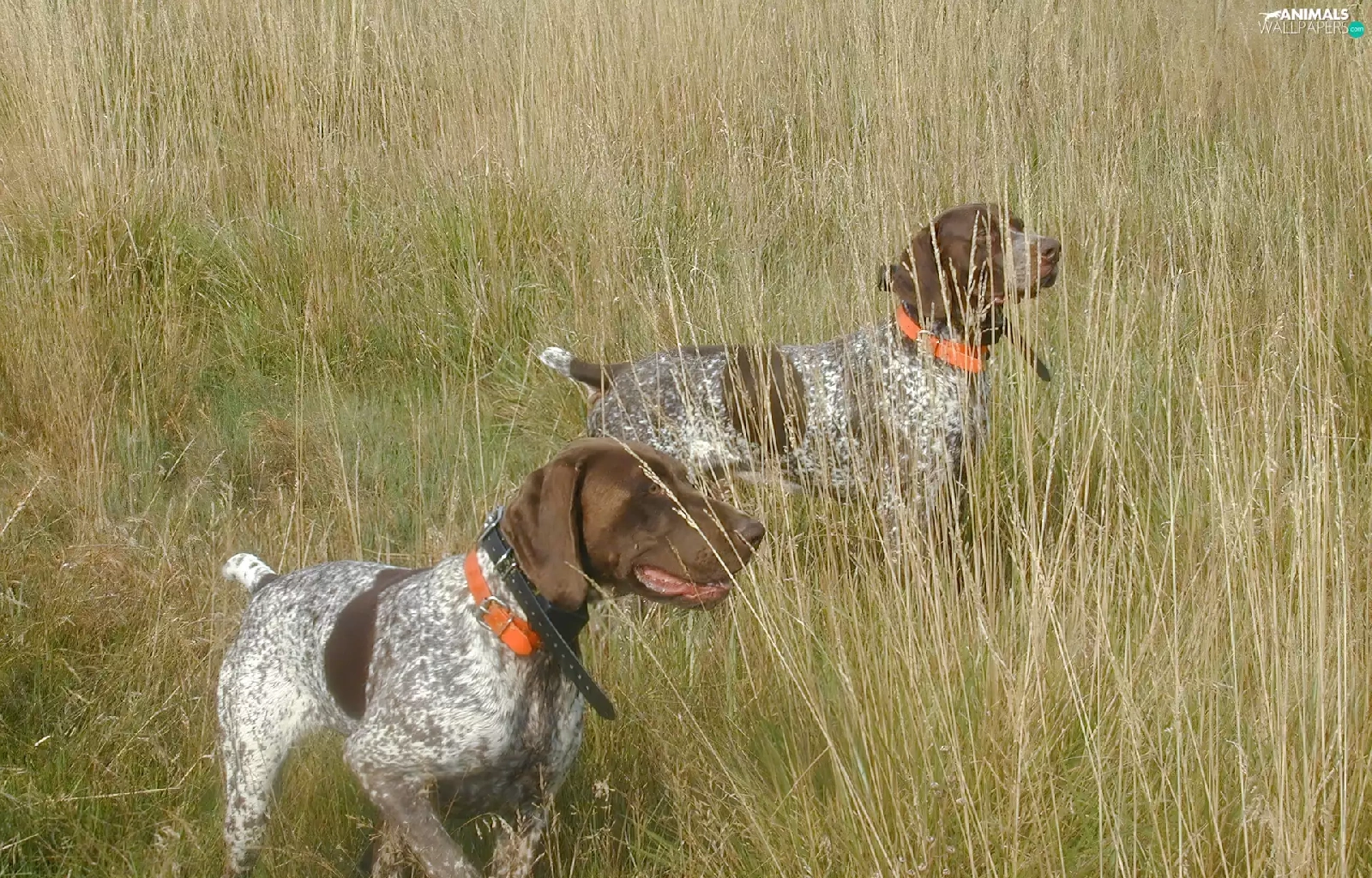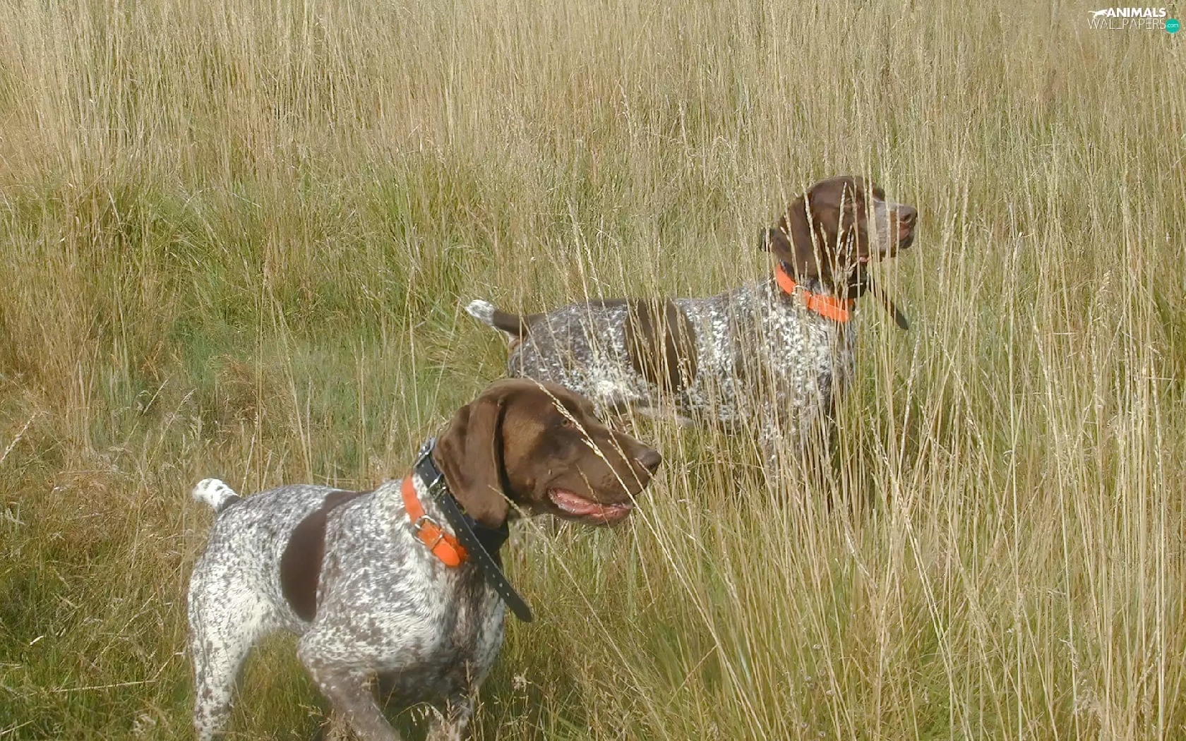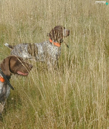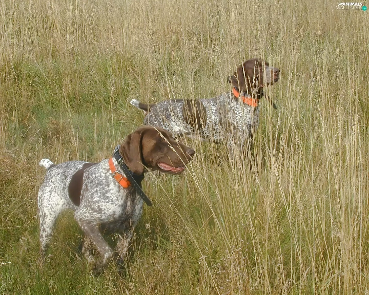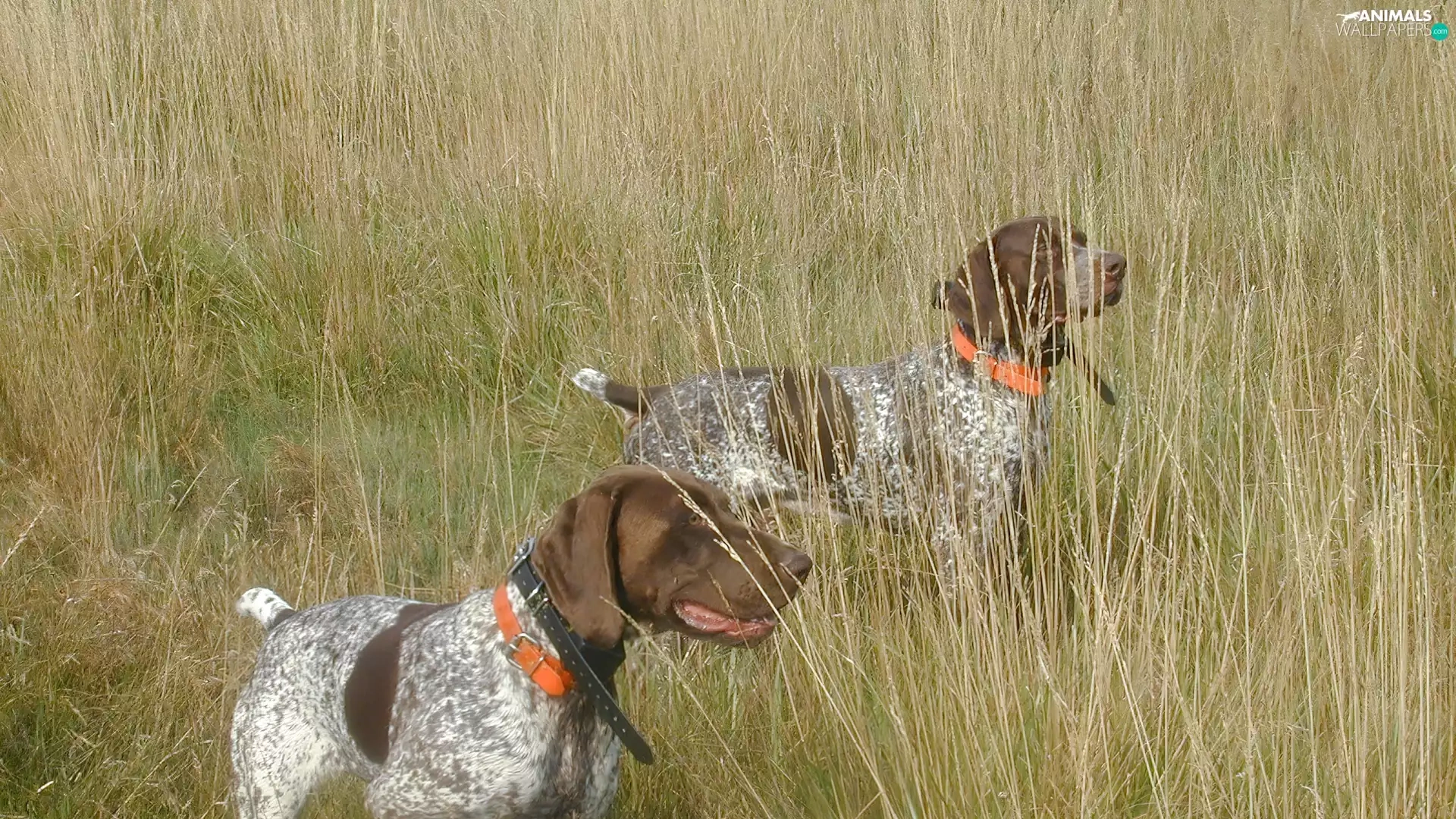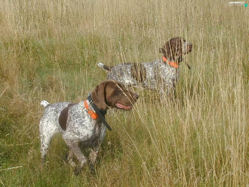 Two cars, Orange, collars, German Shorthair Pointers
