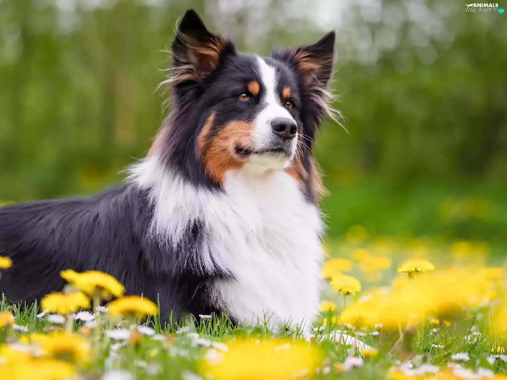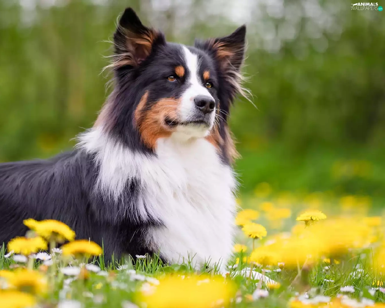 Meadow, Flowers, Border Collie, The look, dog