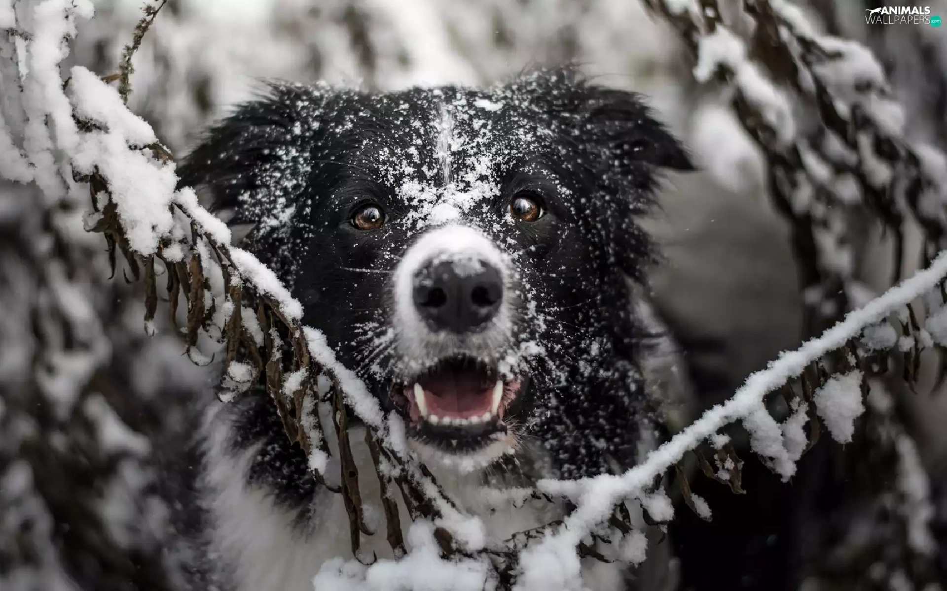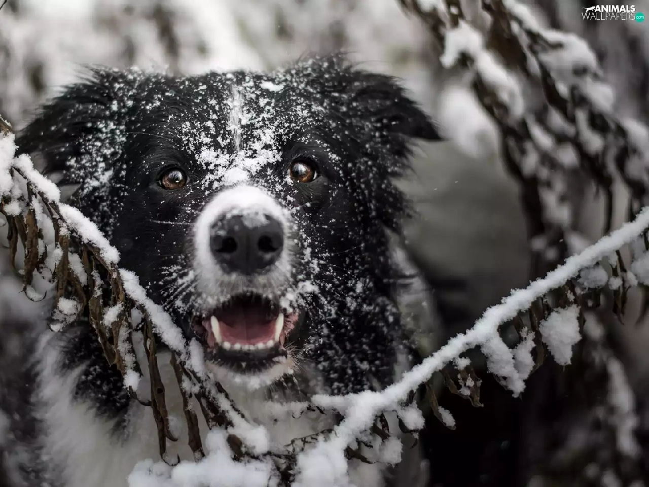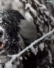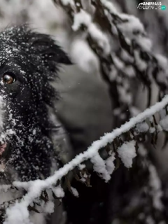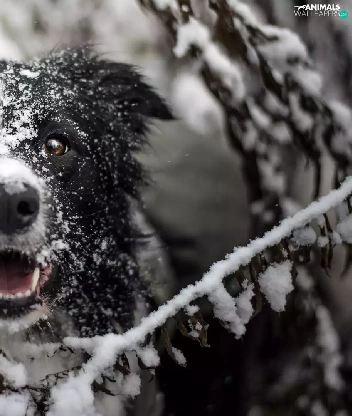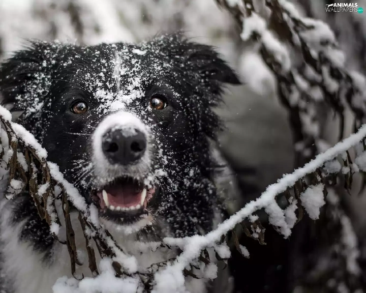 Twigs, snow, Border Collie, muzzle, dog