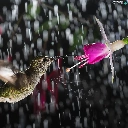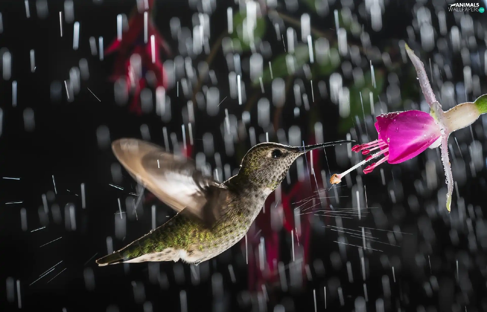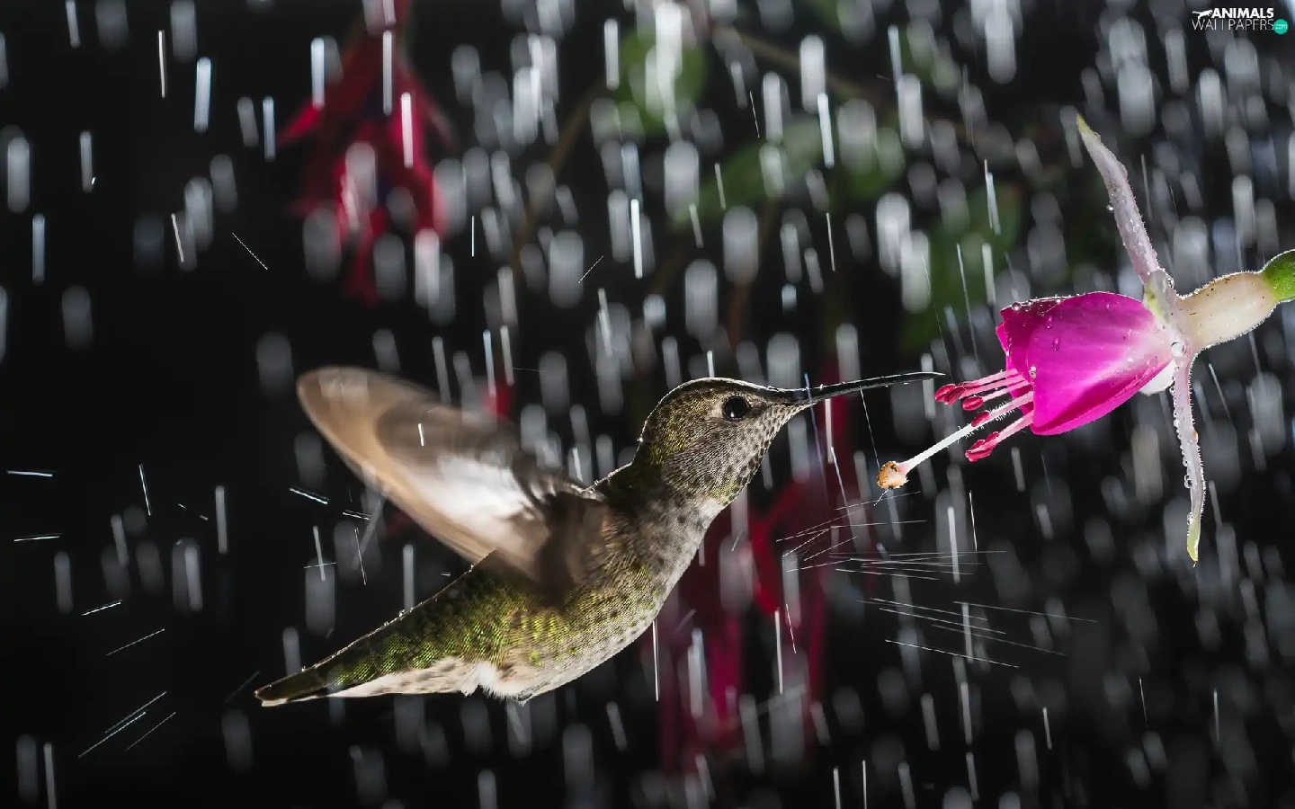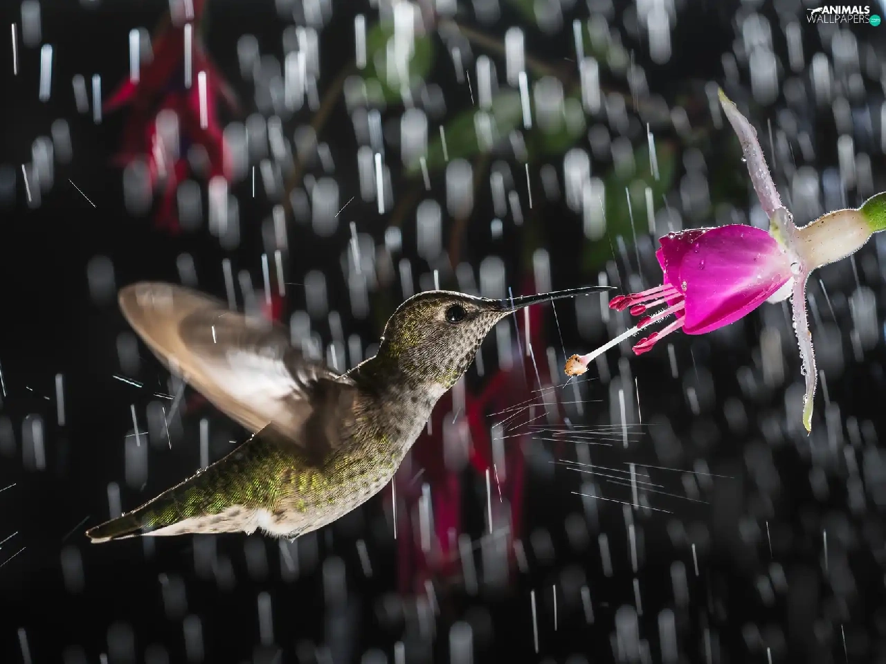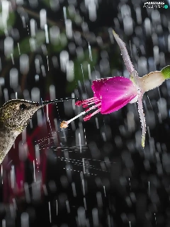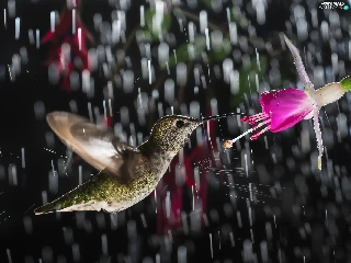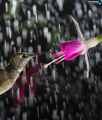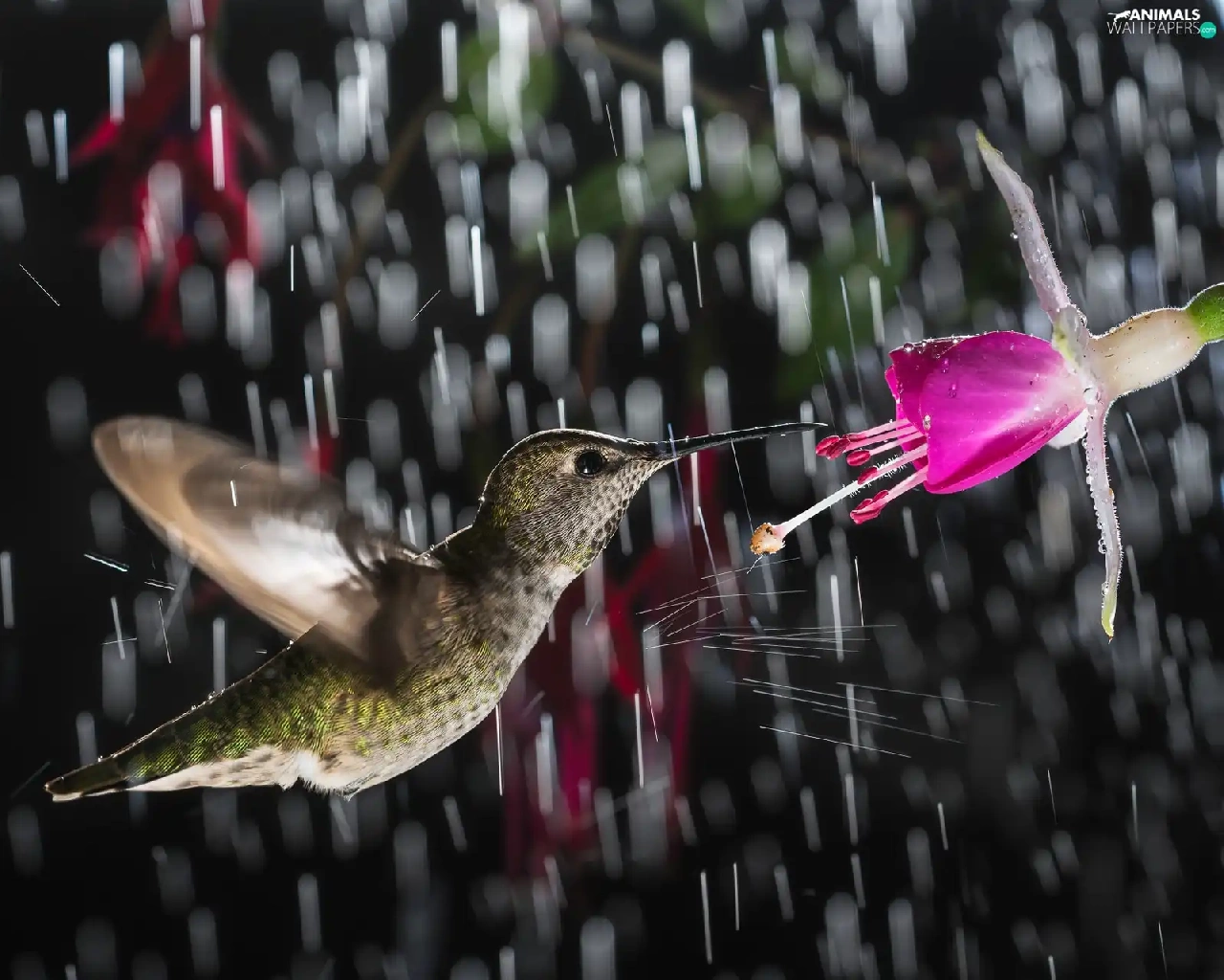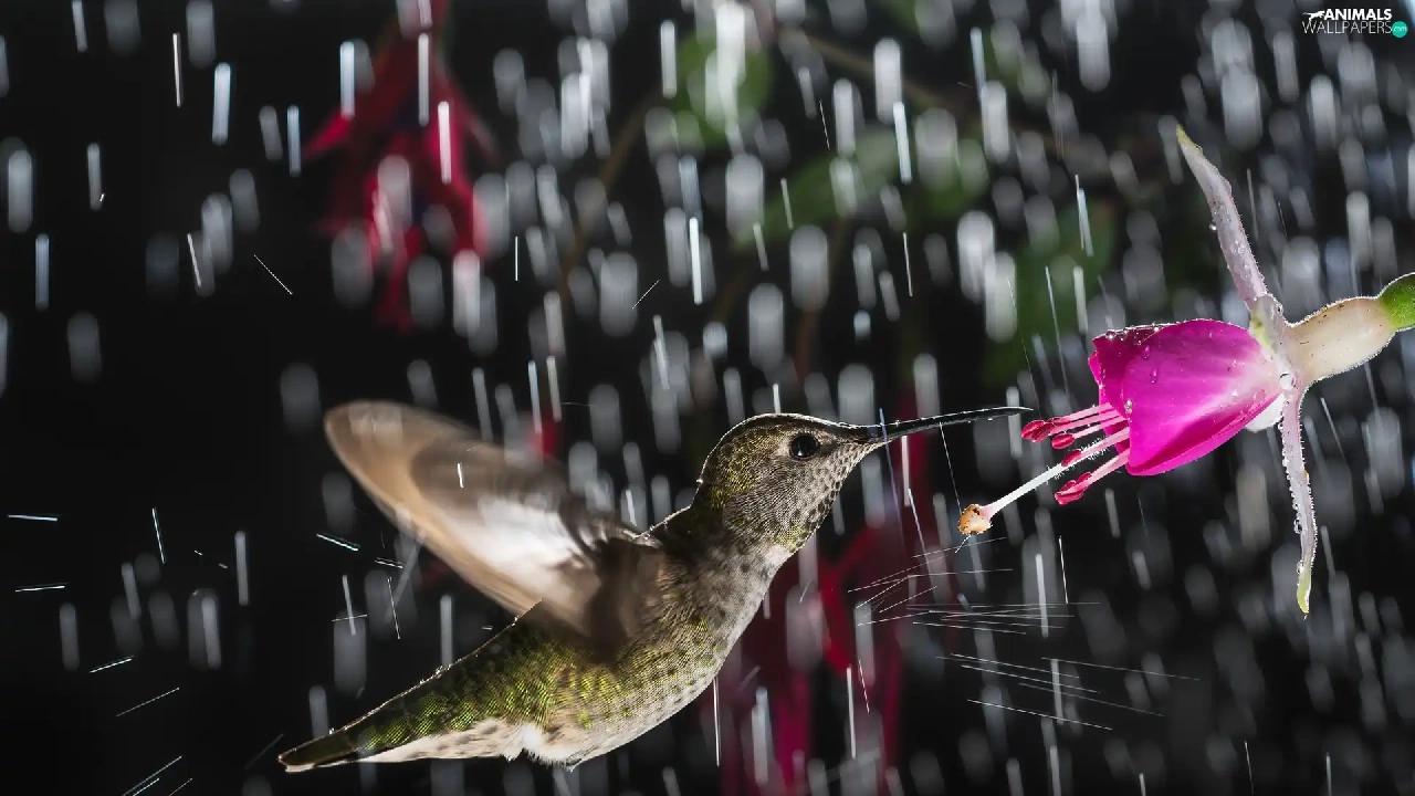 Rain, humming-bird, Colourfull Flowers