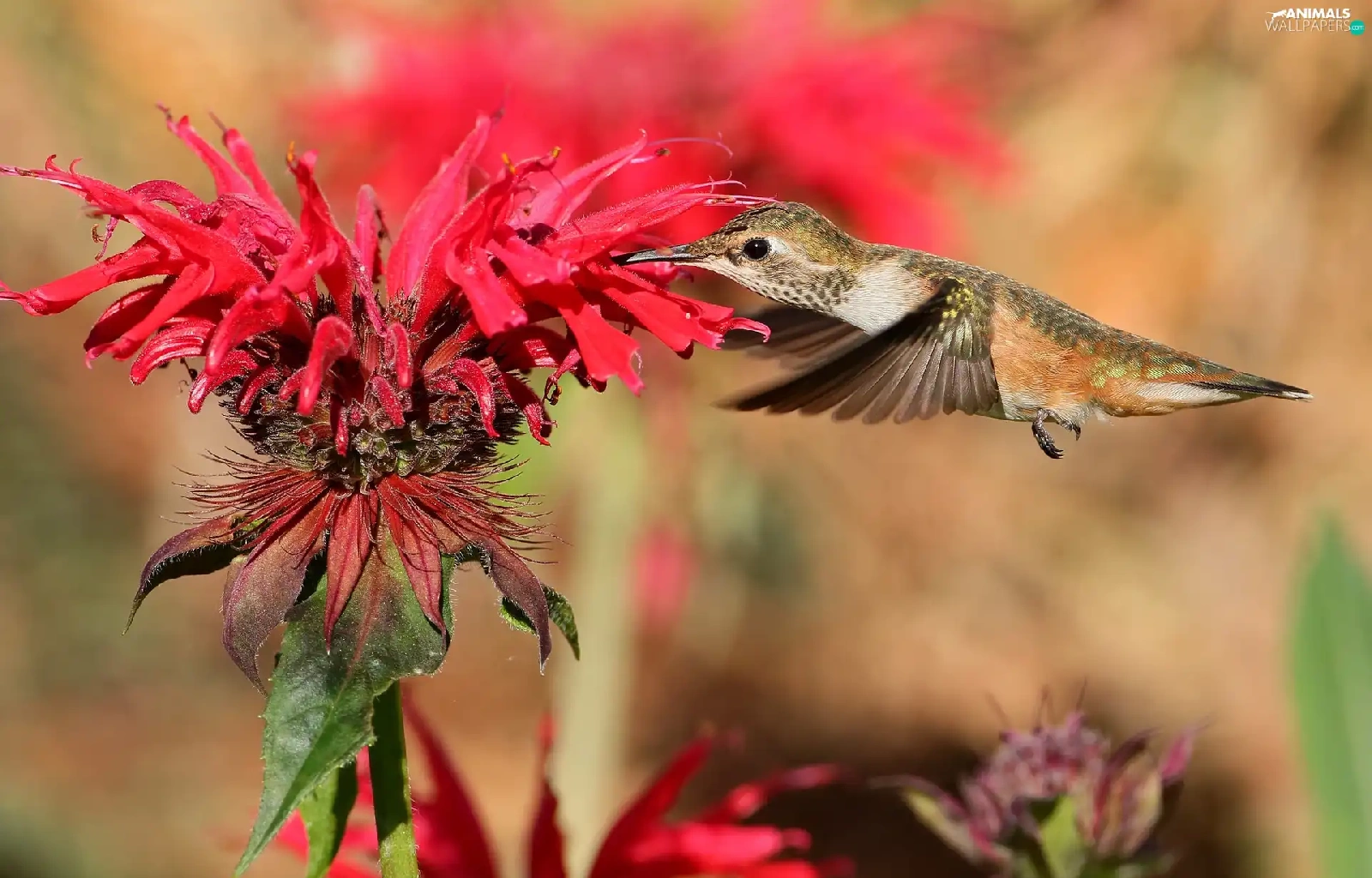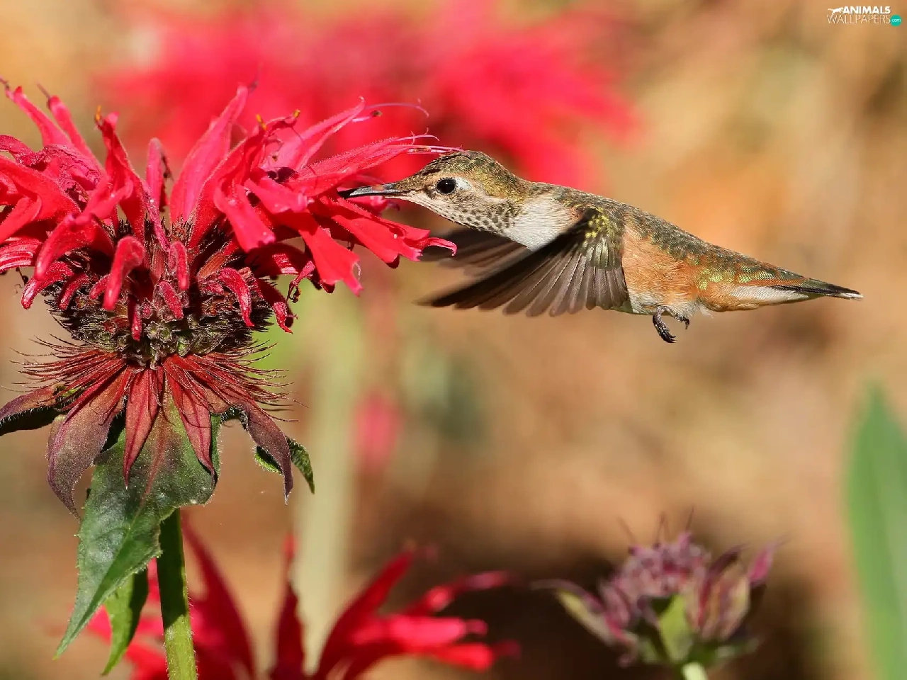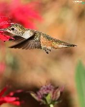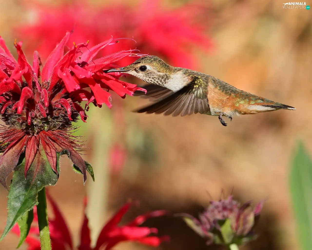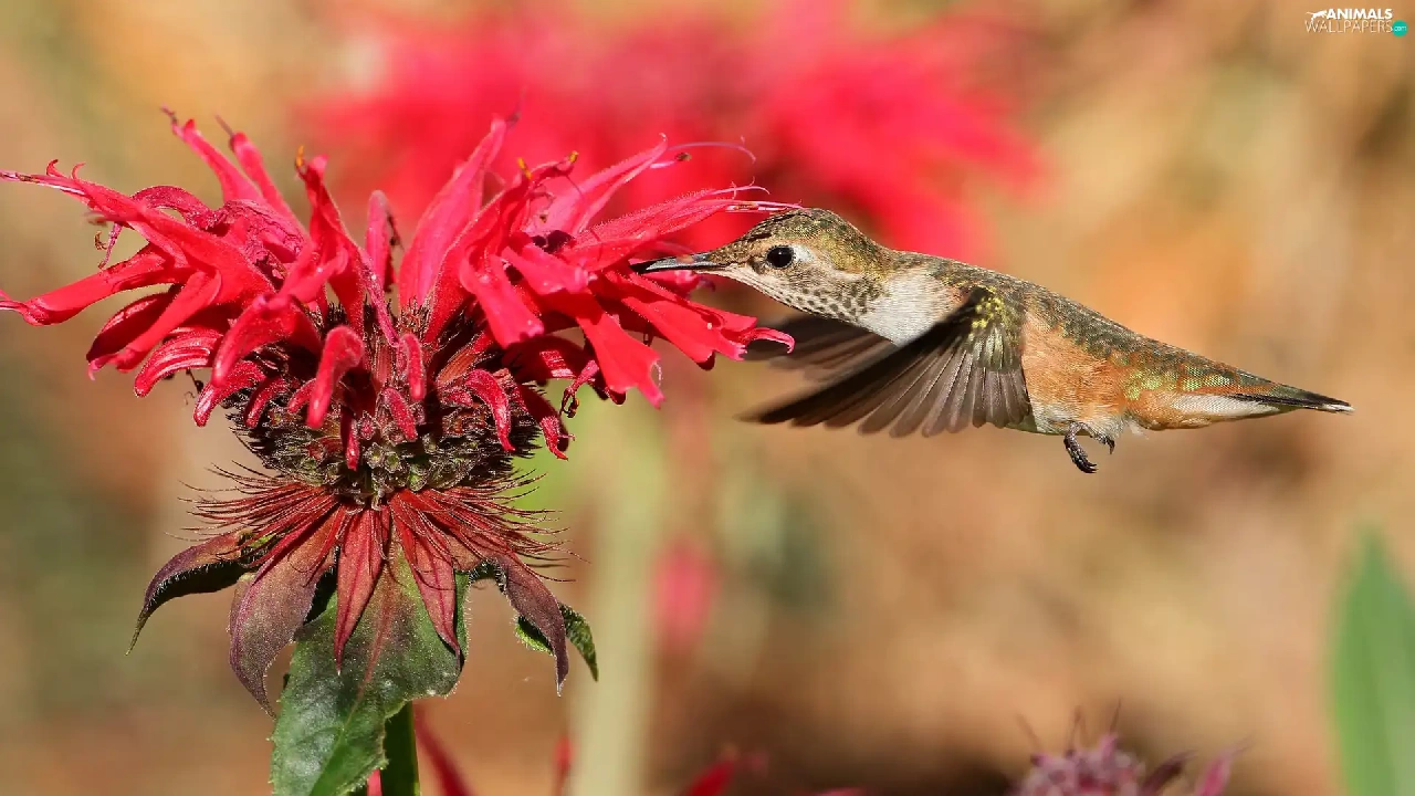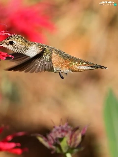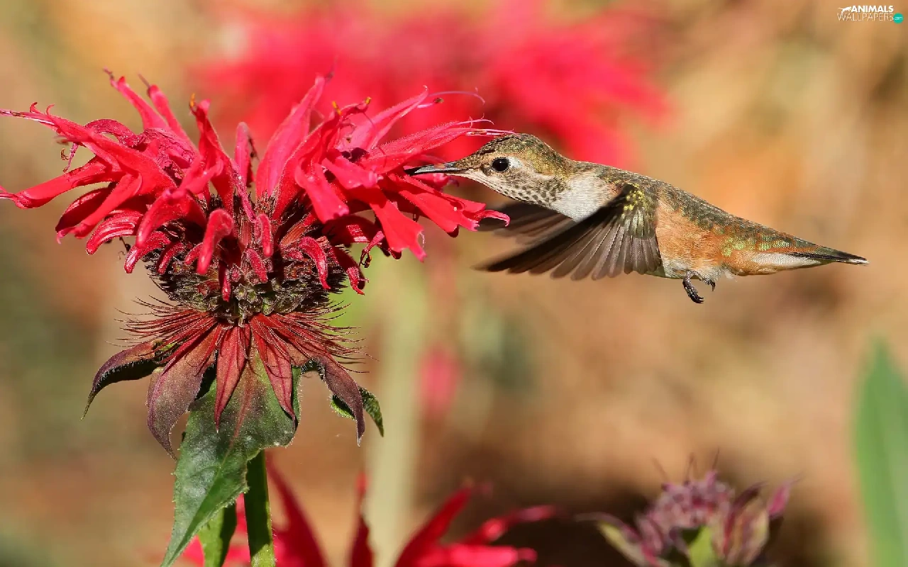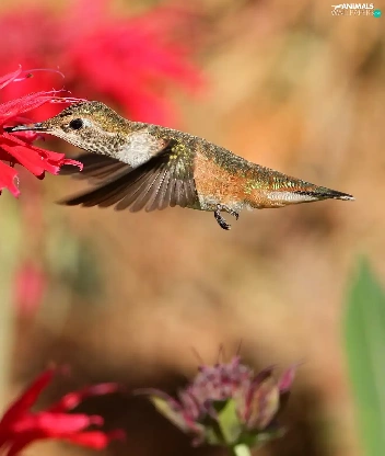 Bird, Red, Colourfull Flowers, humming-bird