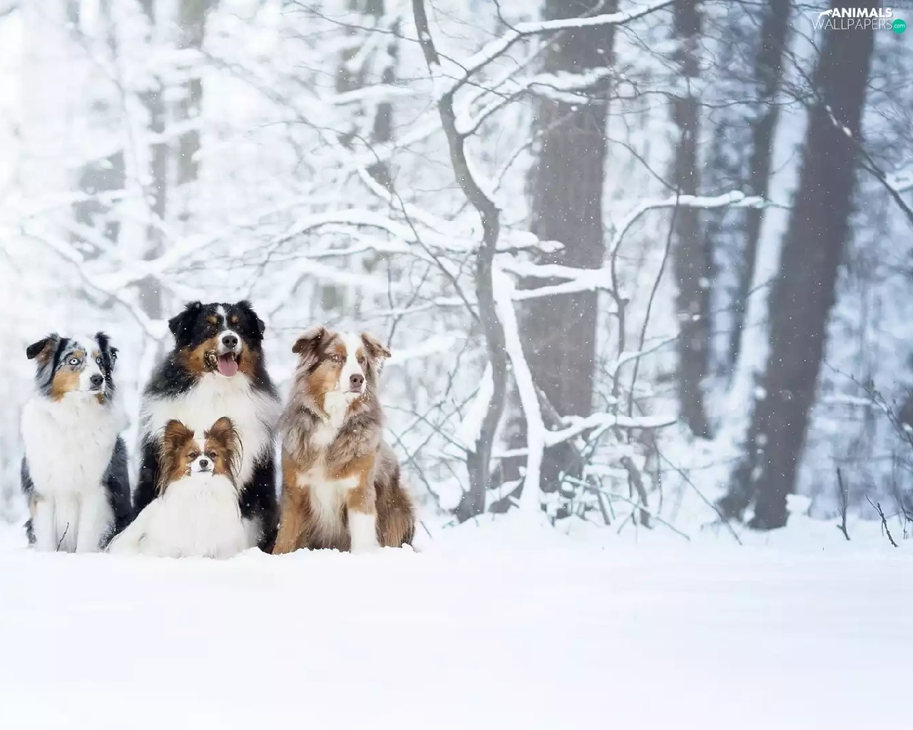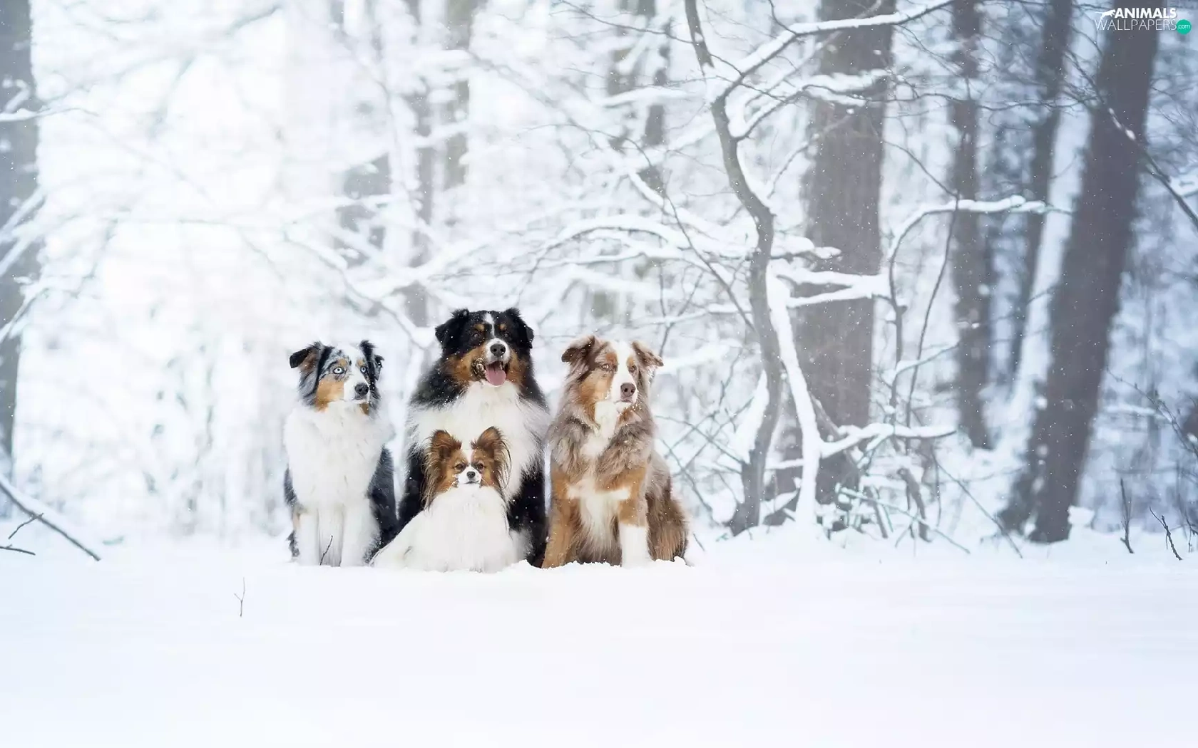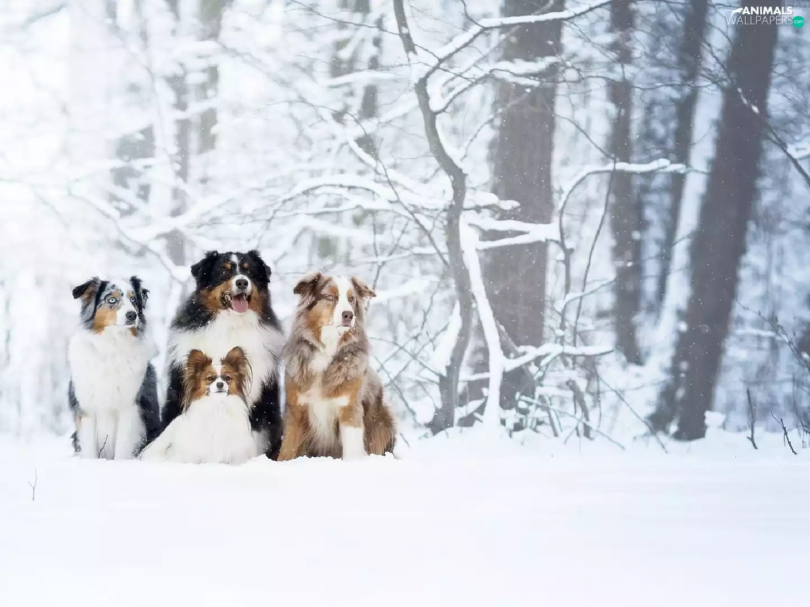 Australian Shepherd, Bernese Mountain Dog, viewes, Miniature Continental Toy Spaniel Papillon, trees, Dogs, four, winter