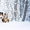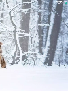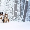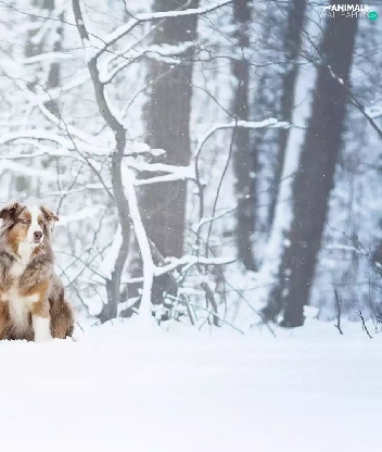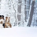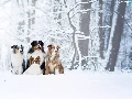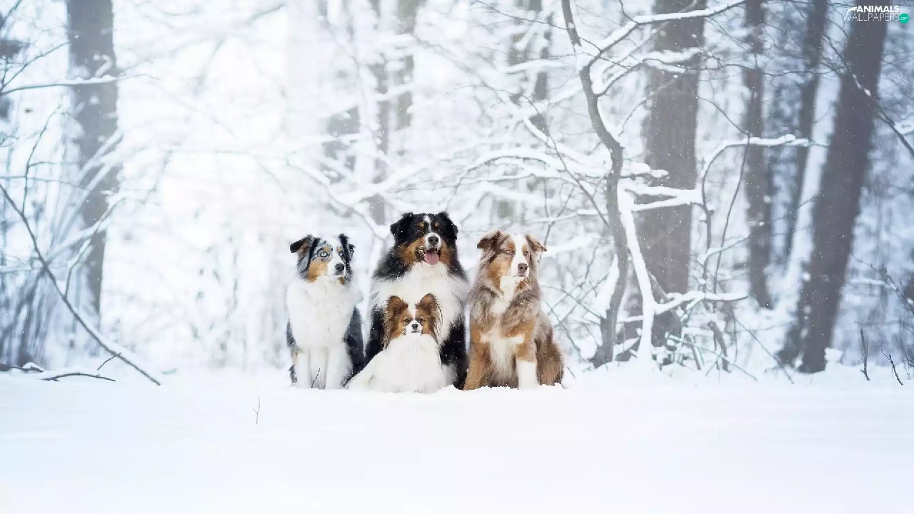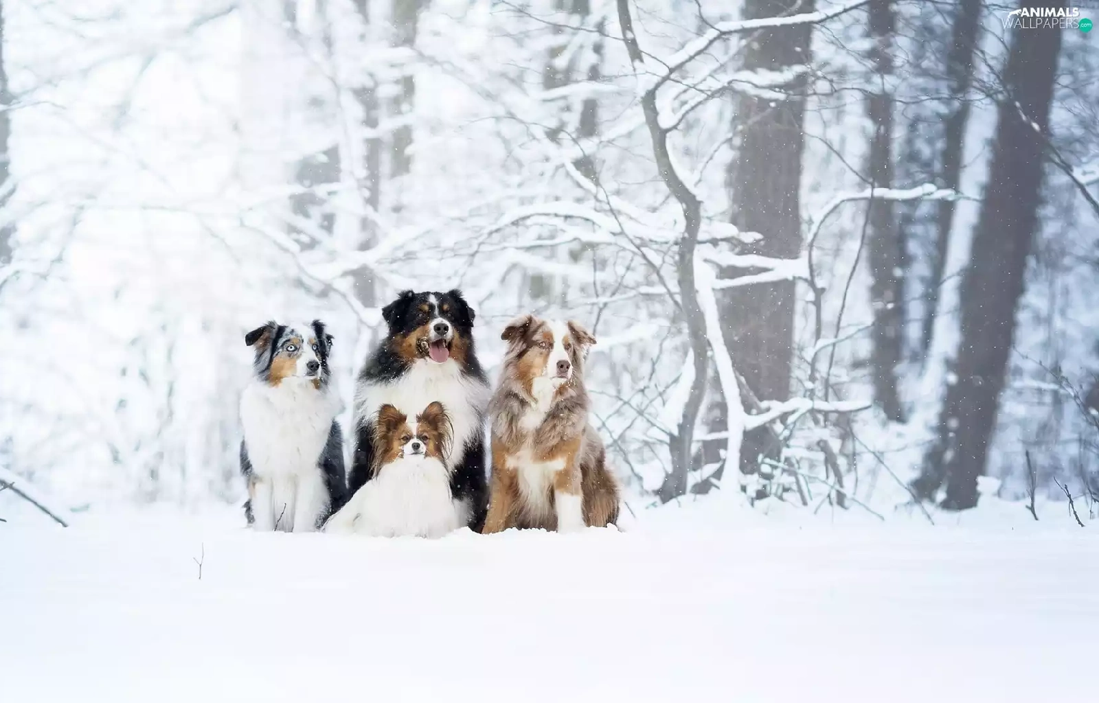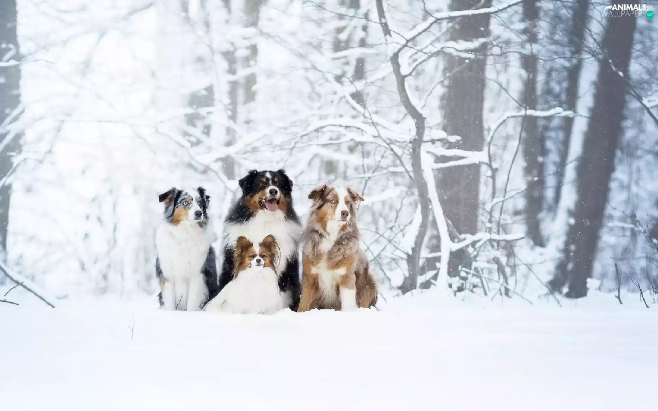 Australian Shepherd, Bernese Mountain Dog, viewes, Miniature Continental Toy Spaniel Papillon, trees, Dogs, four, winter