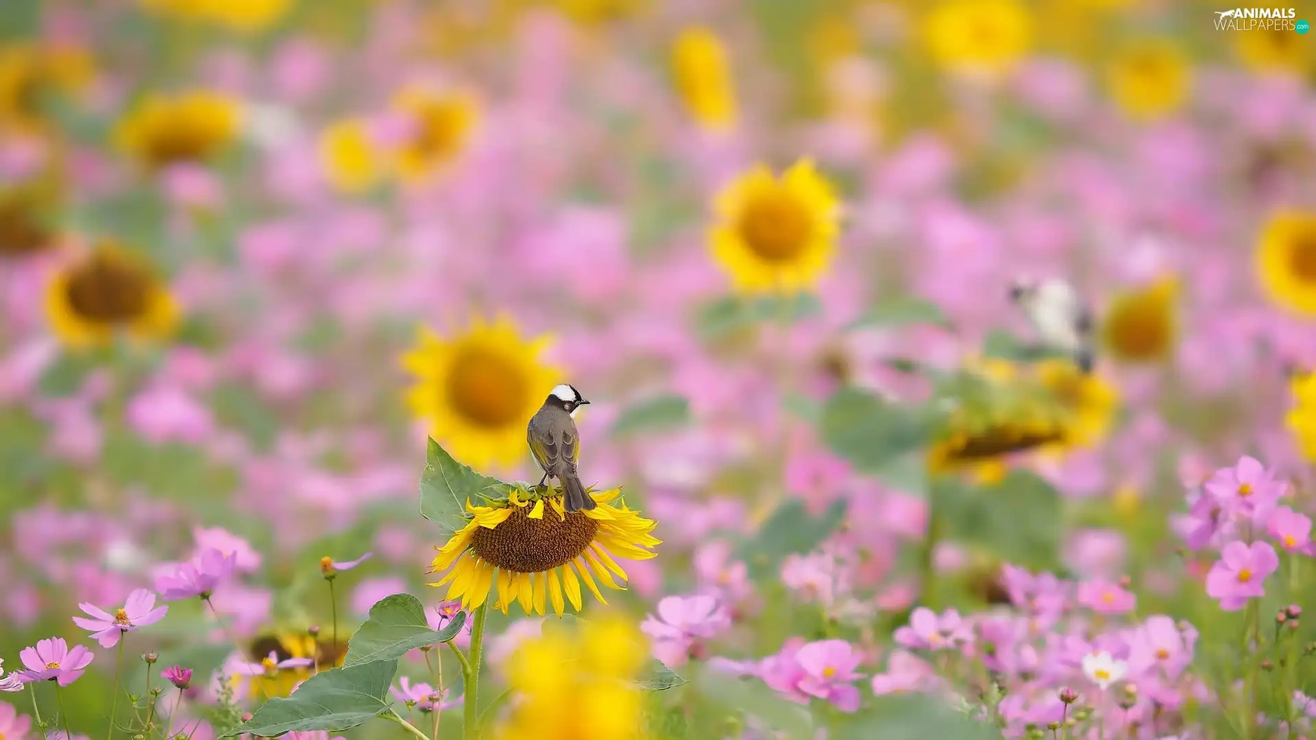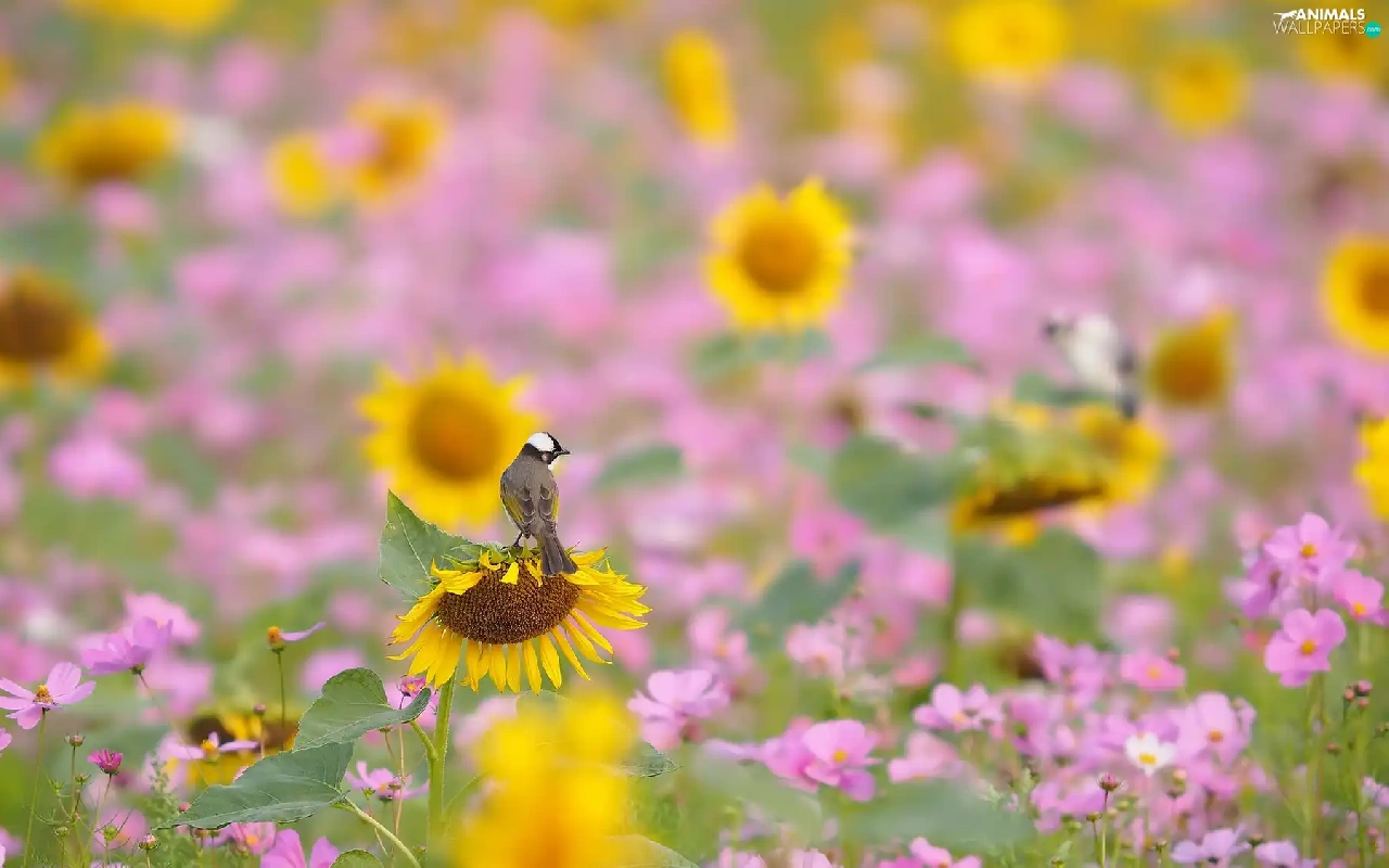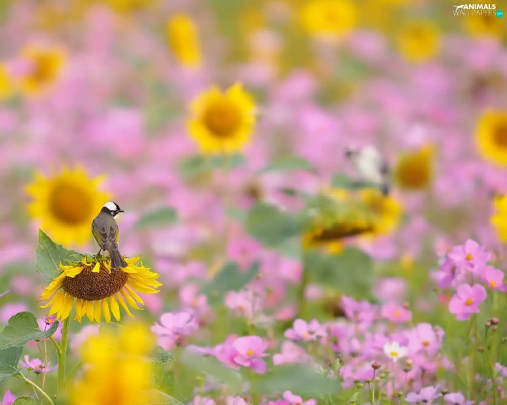 Flowers, Cosmos, Bird, Nice sunflowers