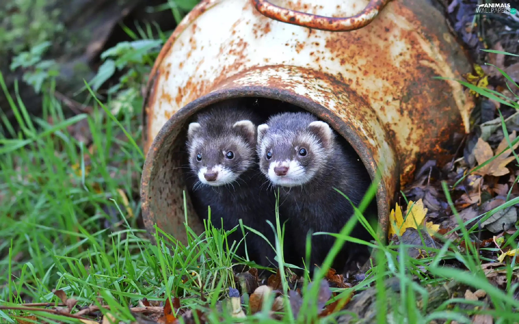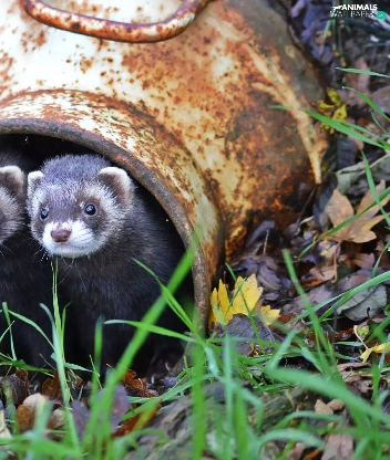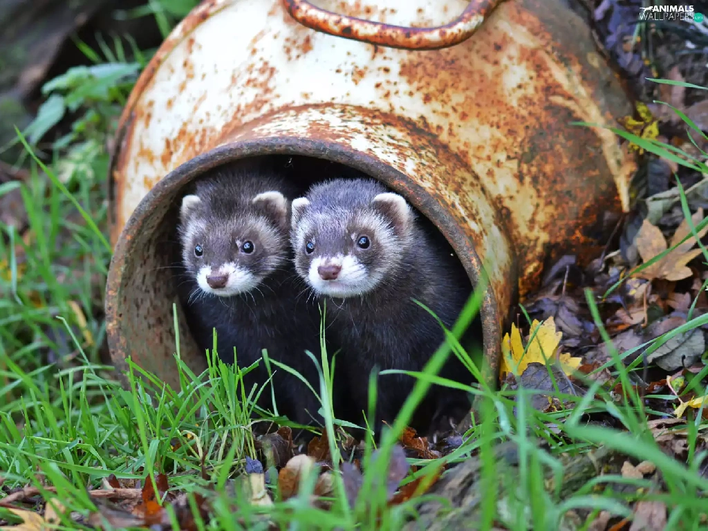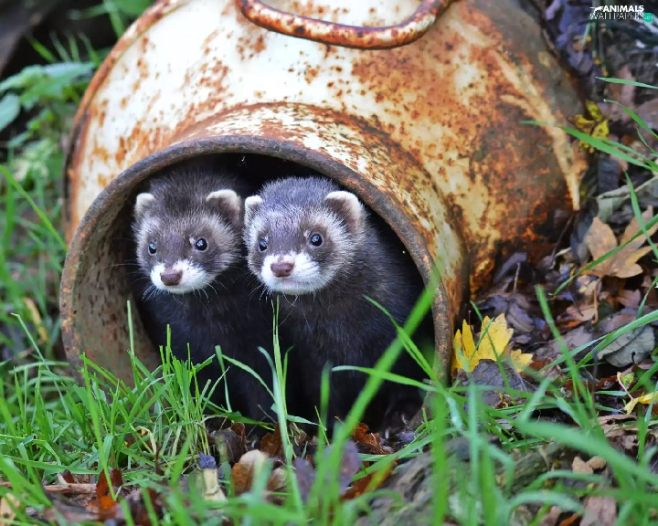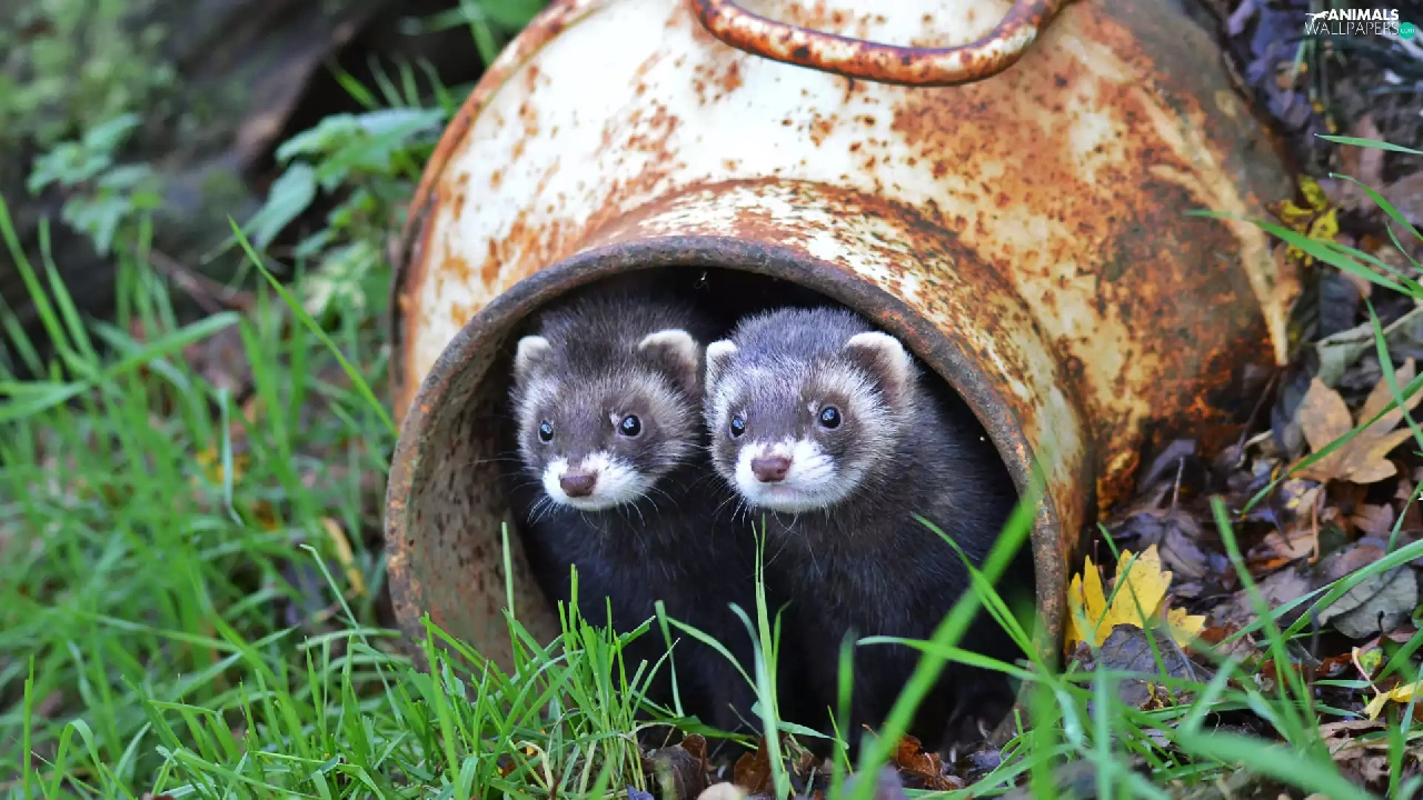 ferrets, container, grass, couple