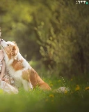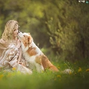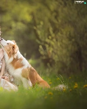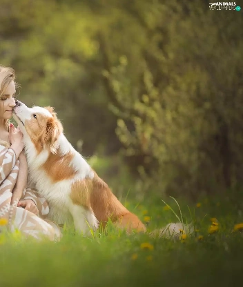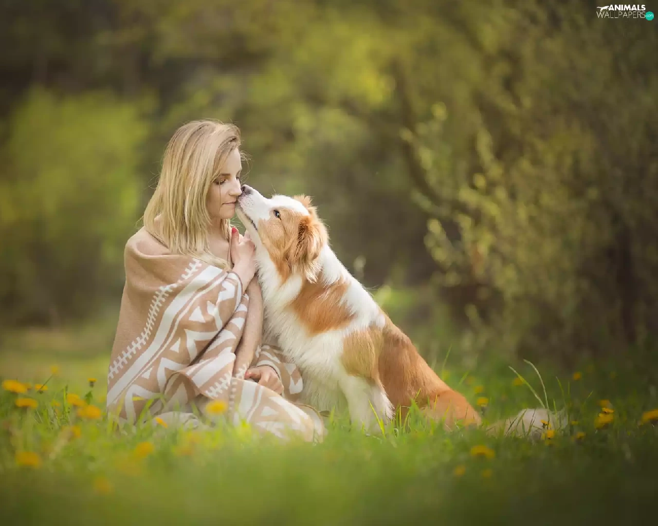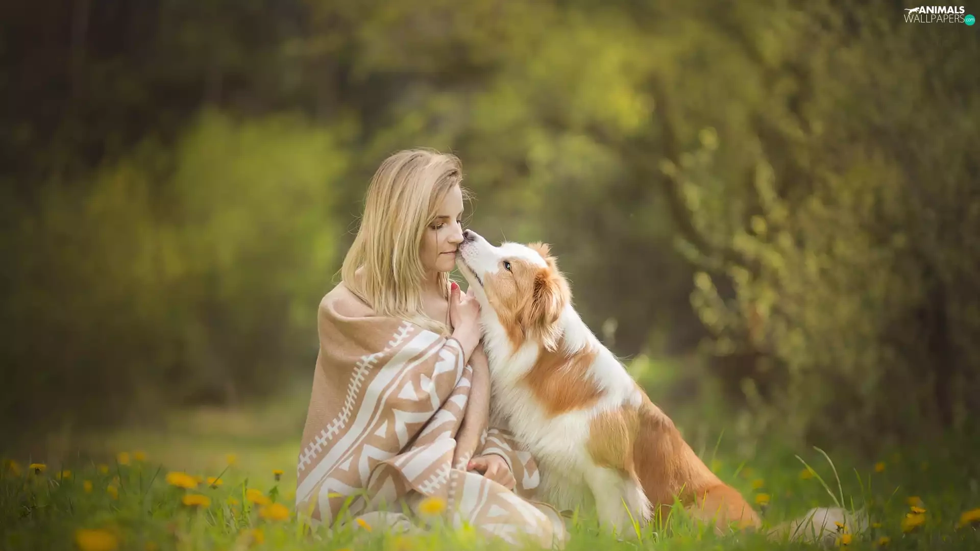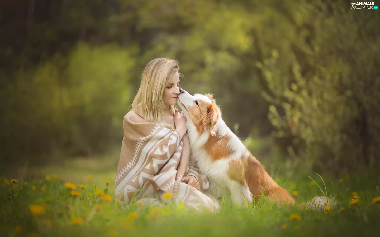 dog, Women, Meadow, blurry background, Border Collie, coverlet