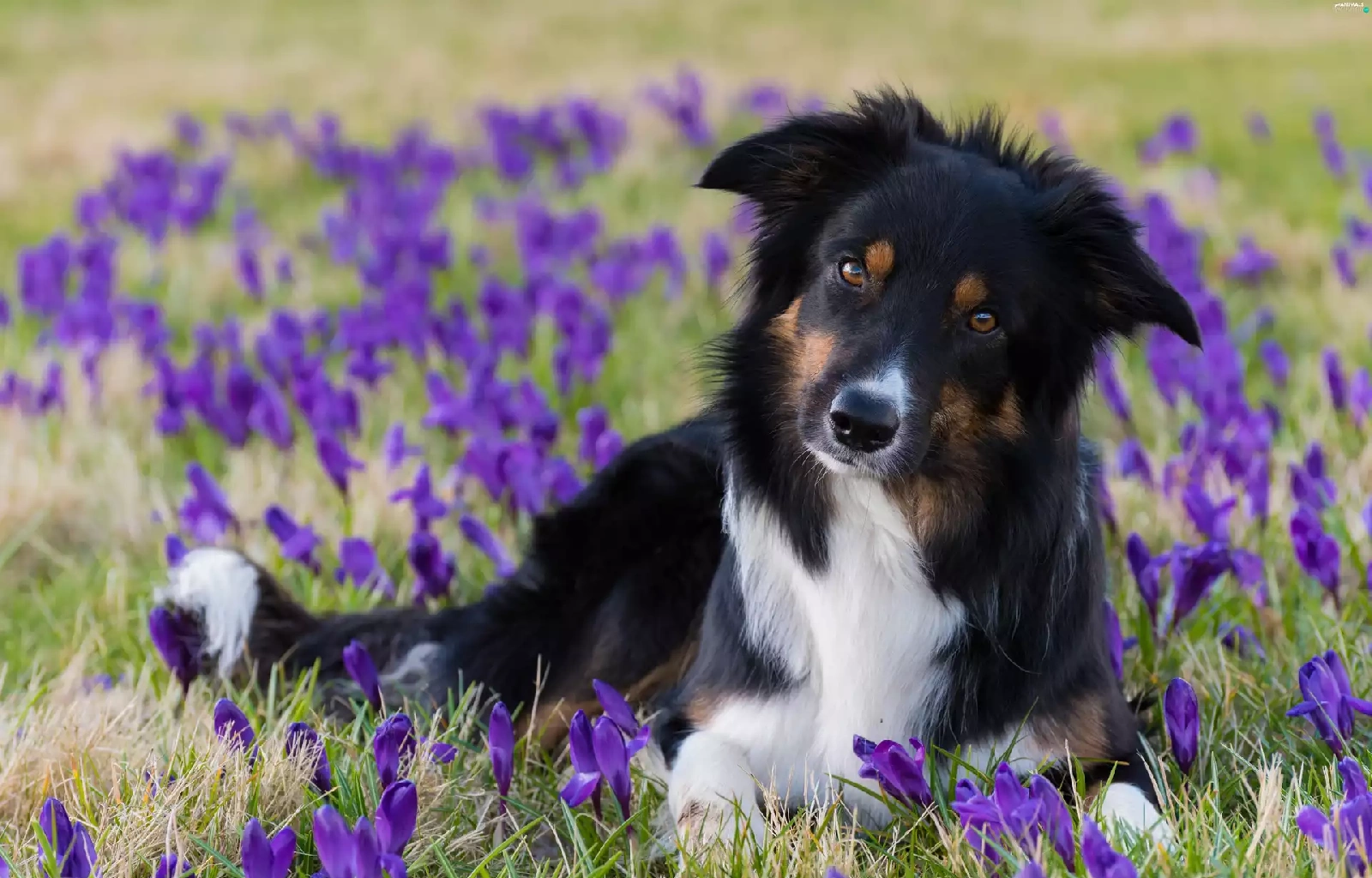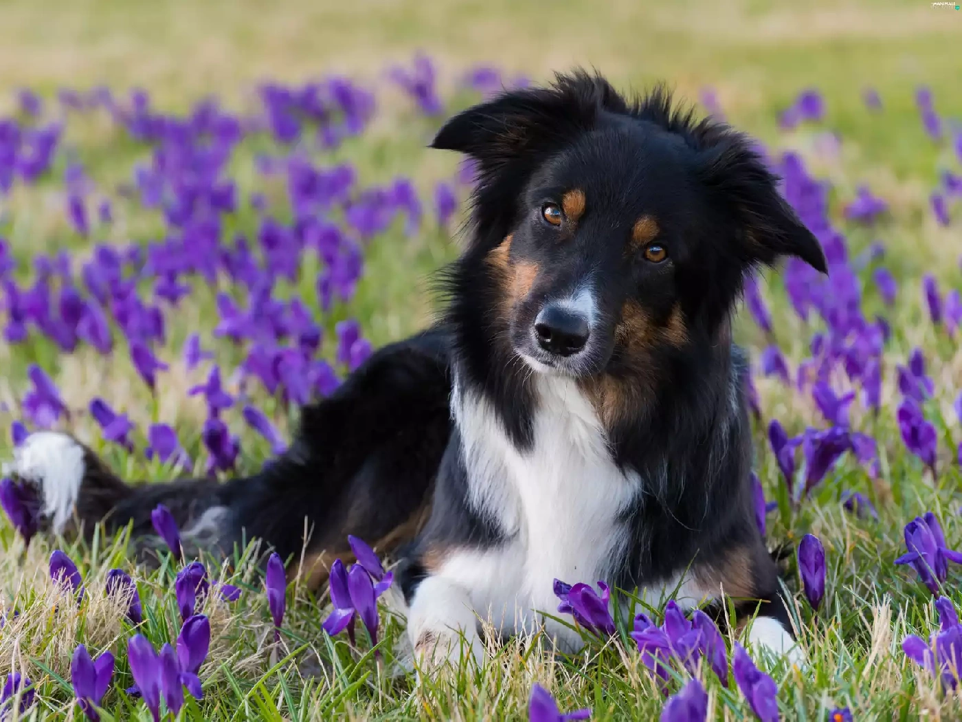 crocuses, dog, Meadow