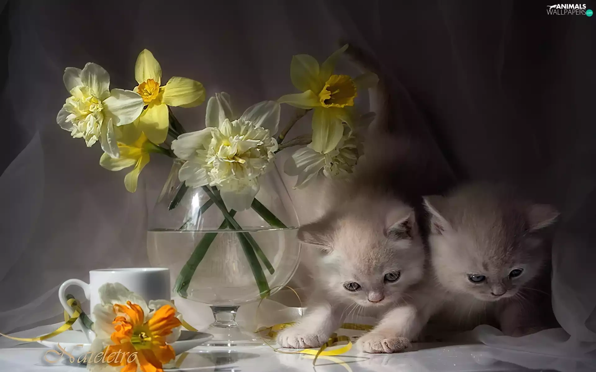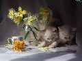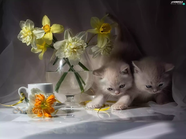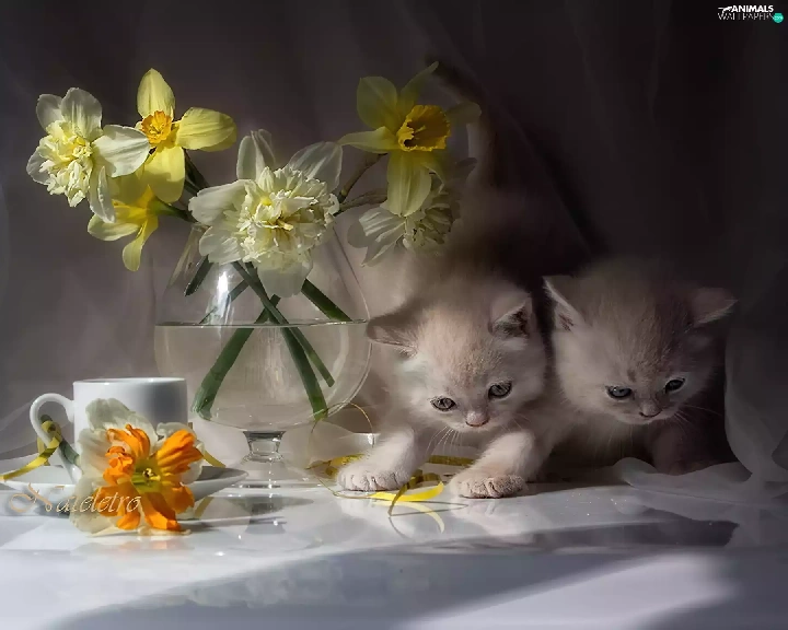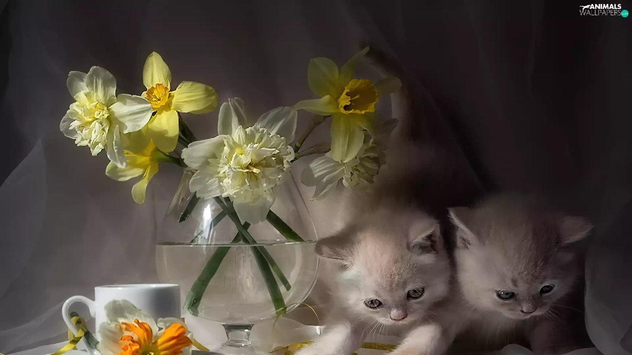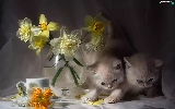Vase, cup, puss, Daffodils, Two cars
