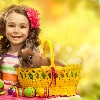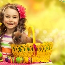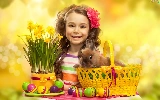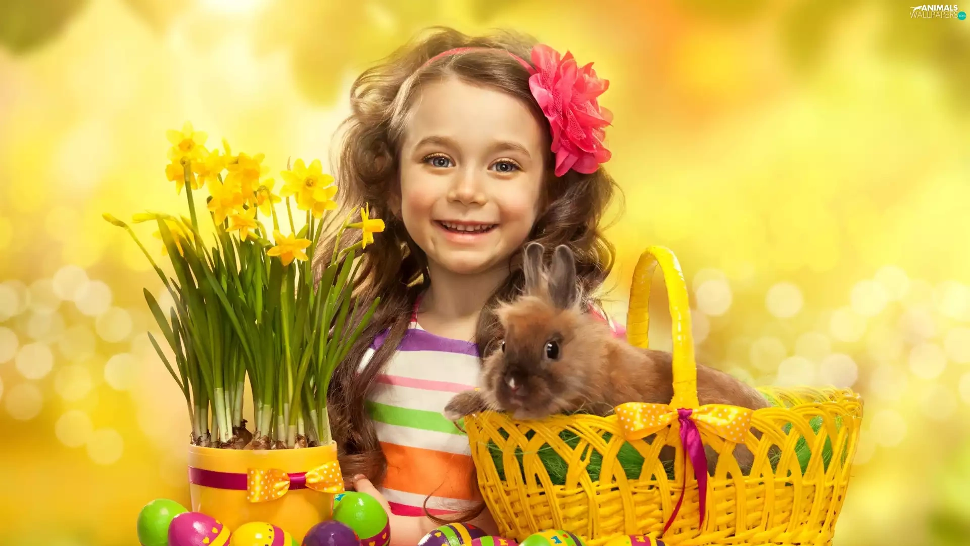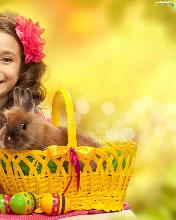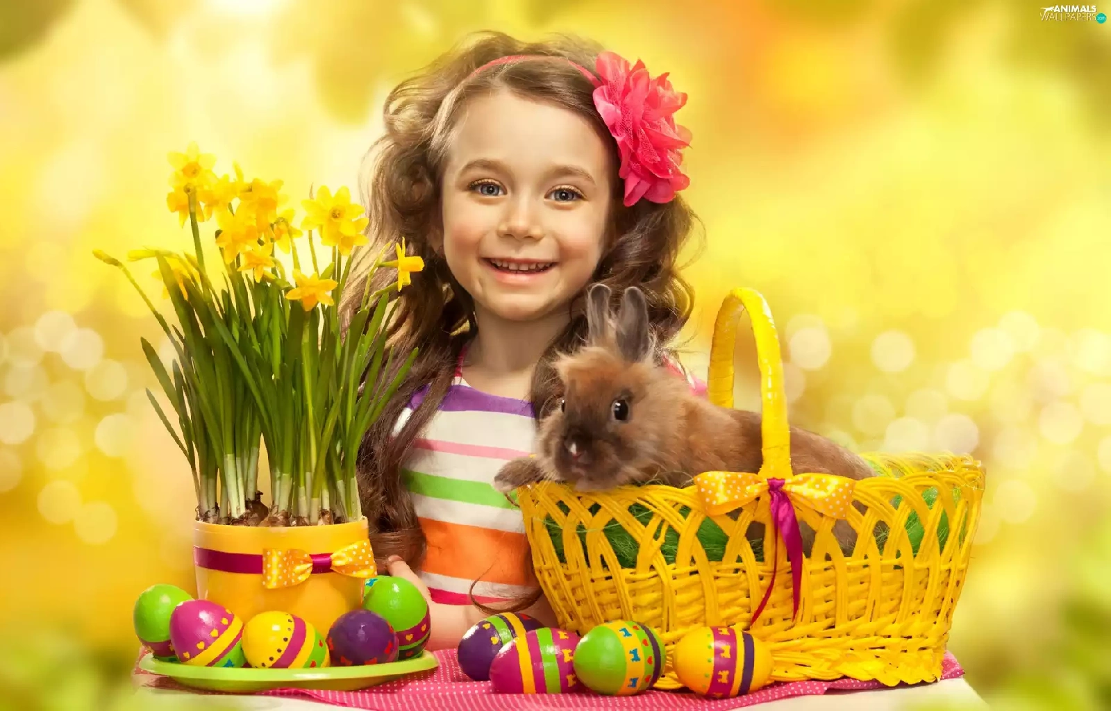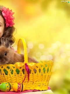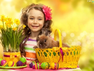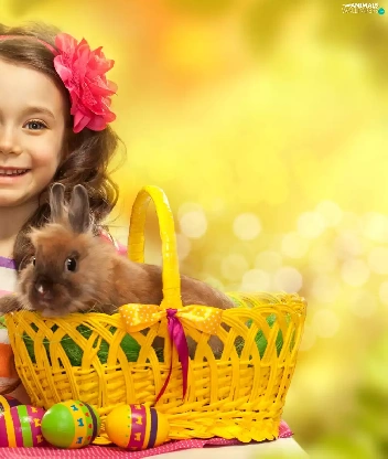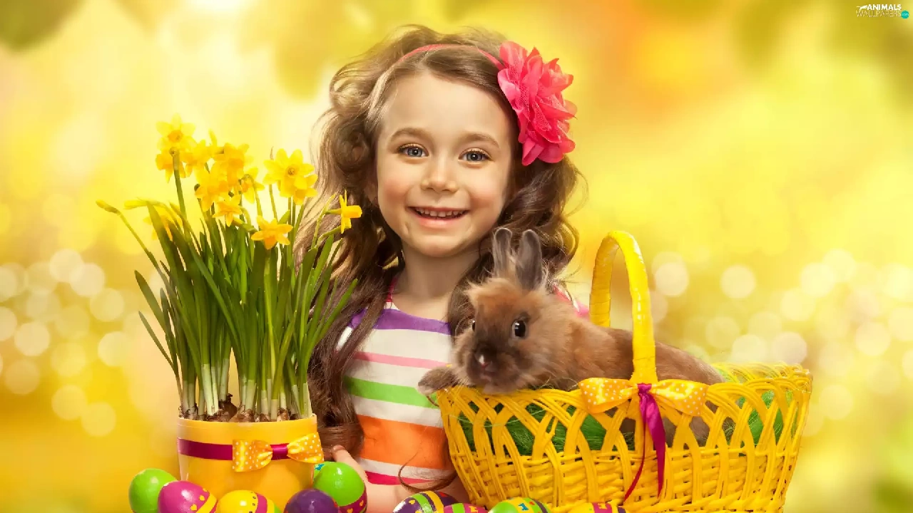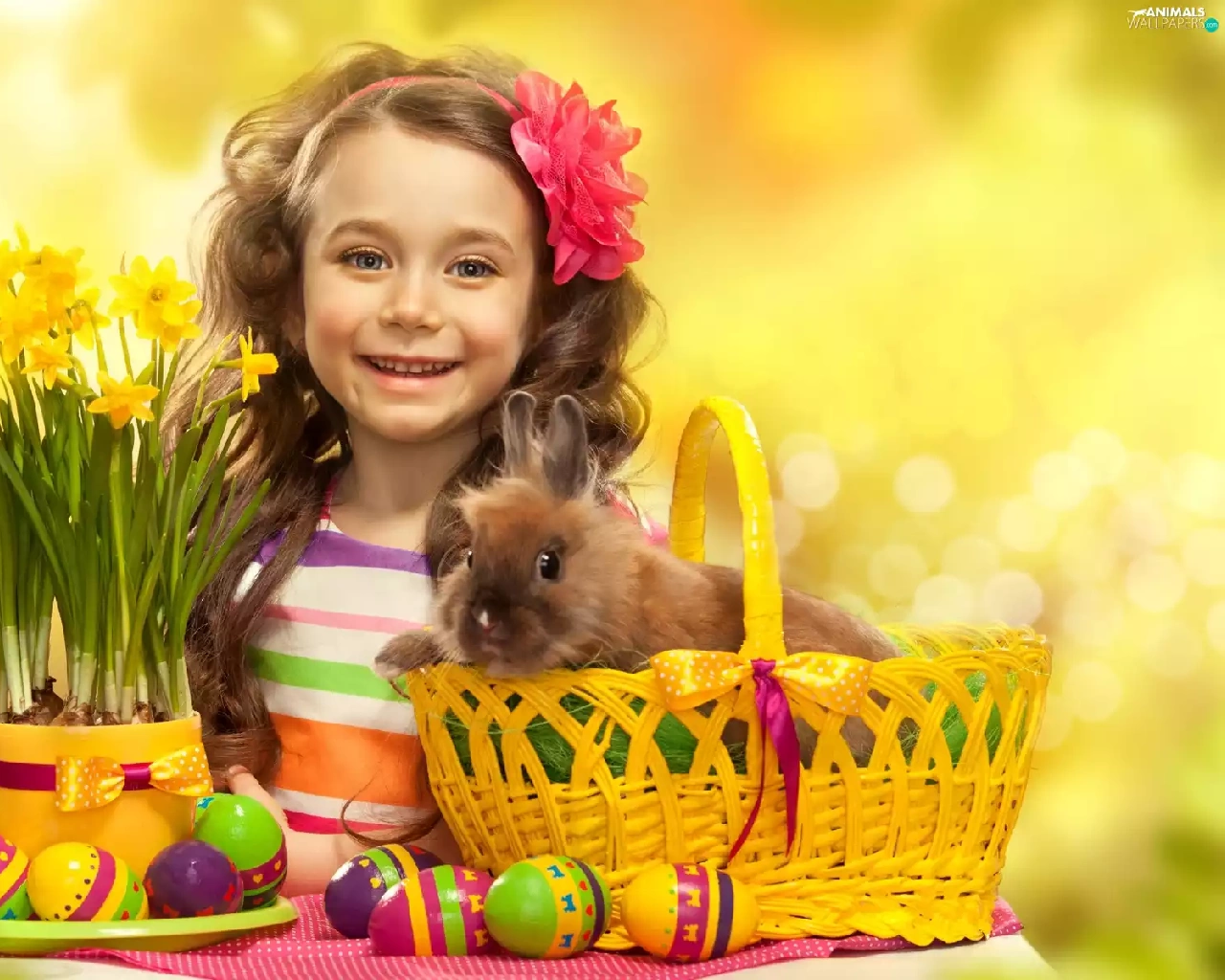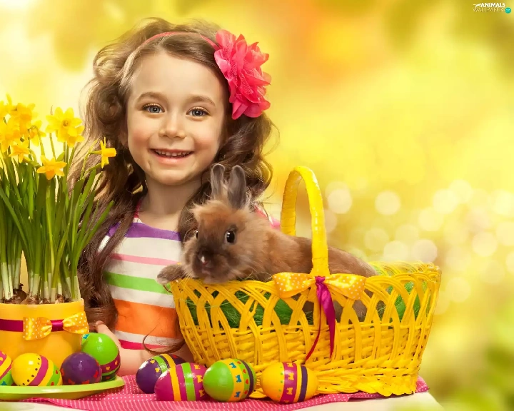 girl, Easter, Rabbit, Daffodils, basket, eggs