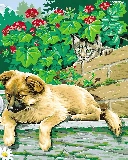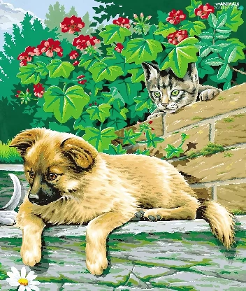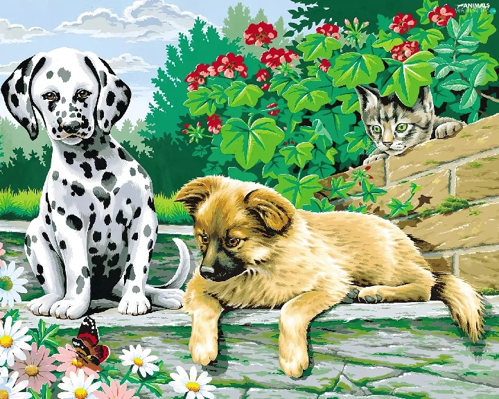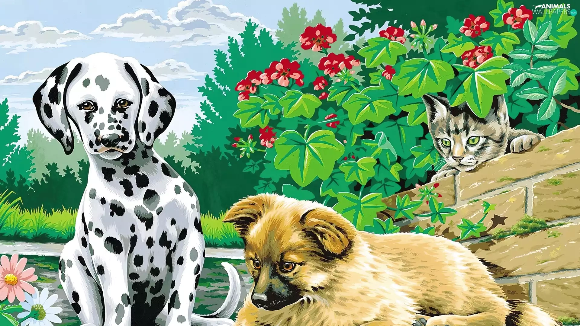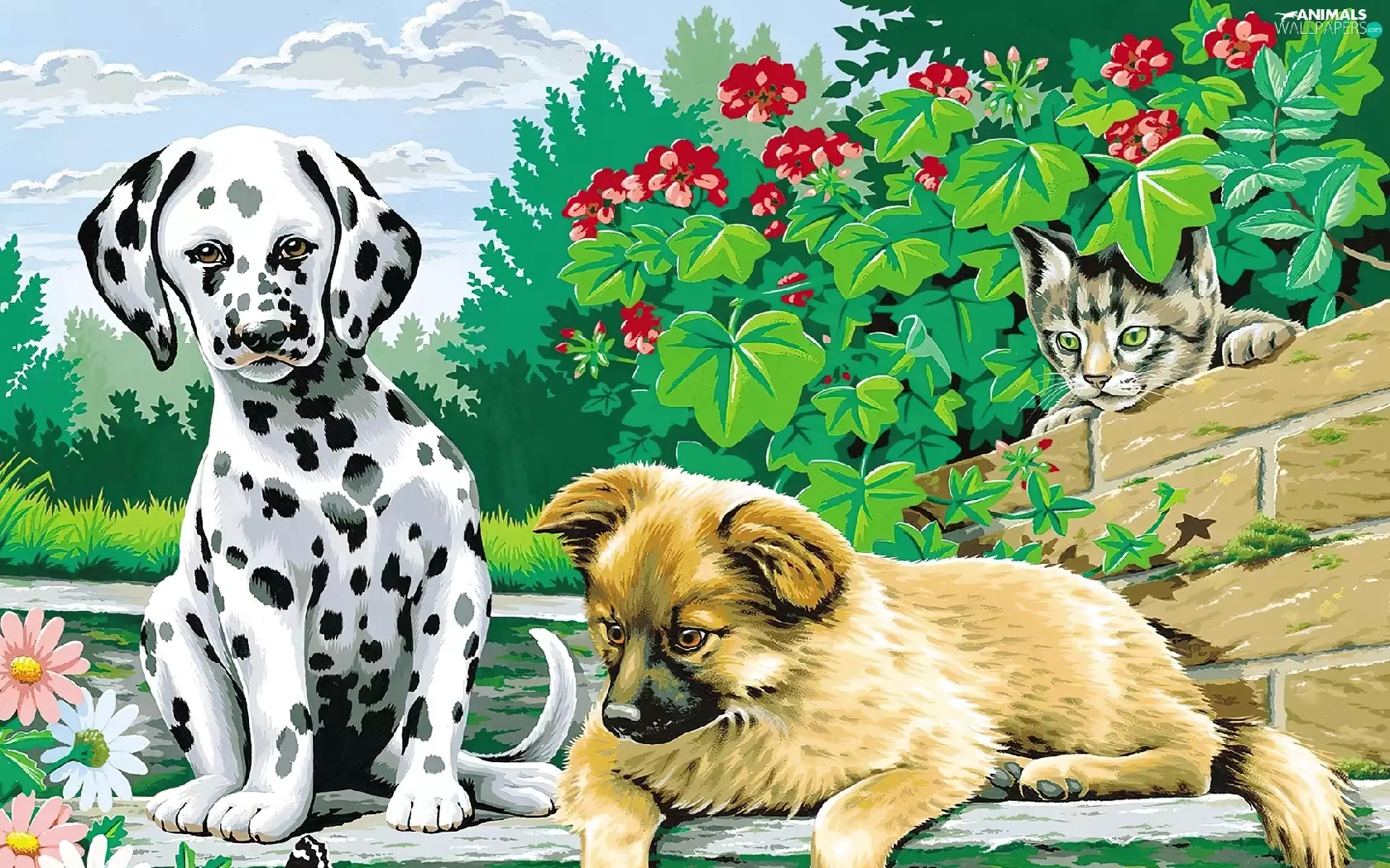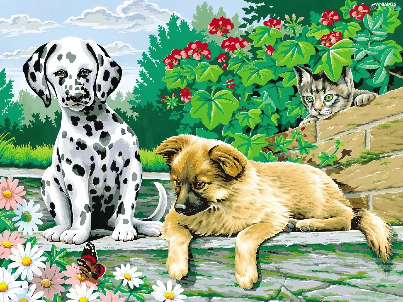 cat, Flowers, Dogs, Dalmatian, Two cars
