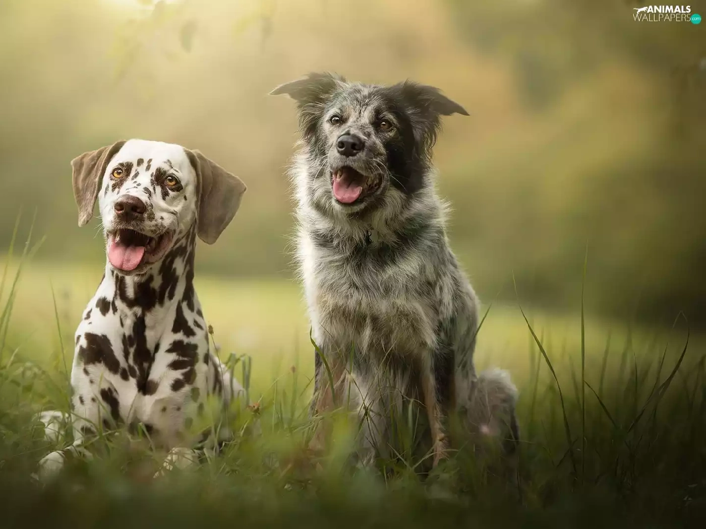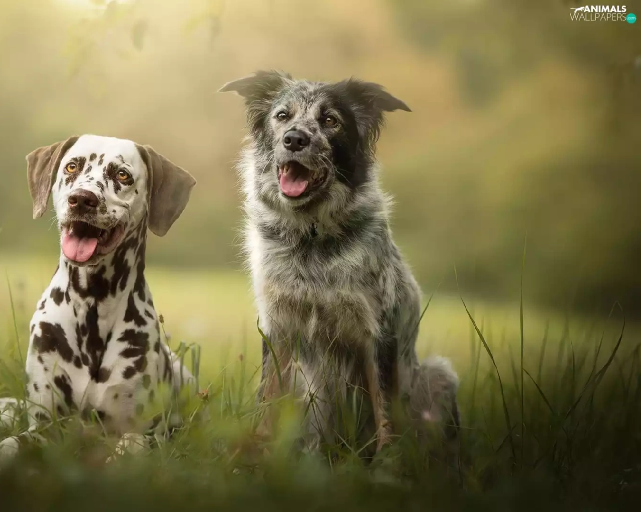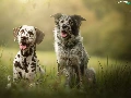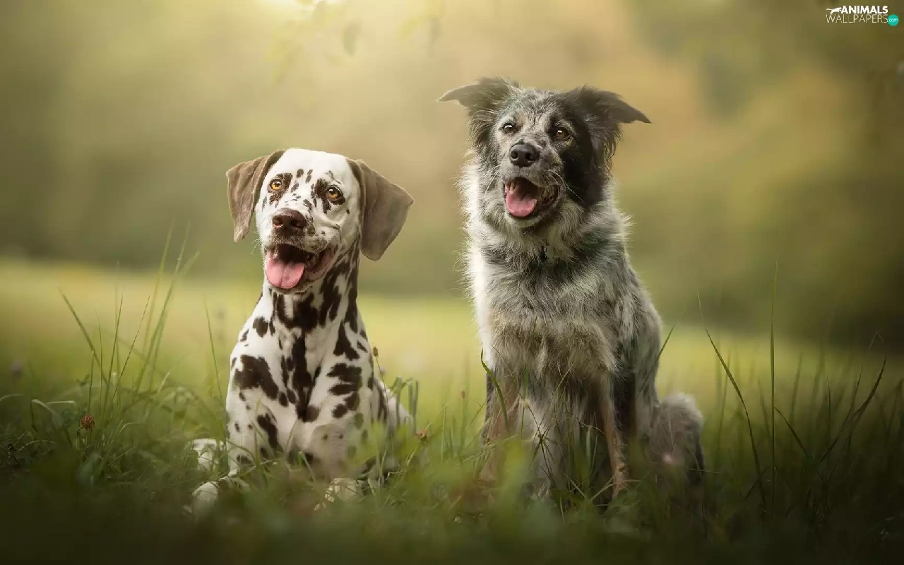 Meadow, grass, Dogs, Dalmatian, Two cars