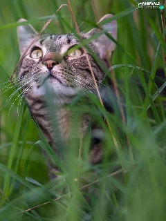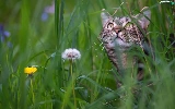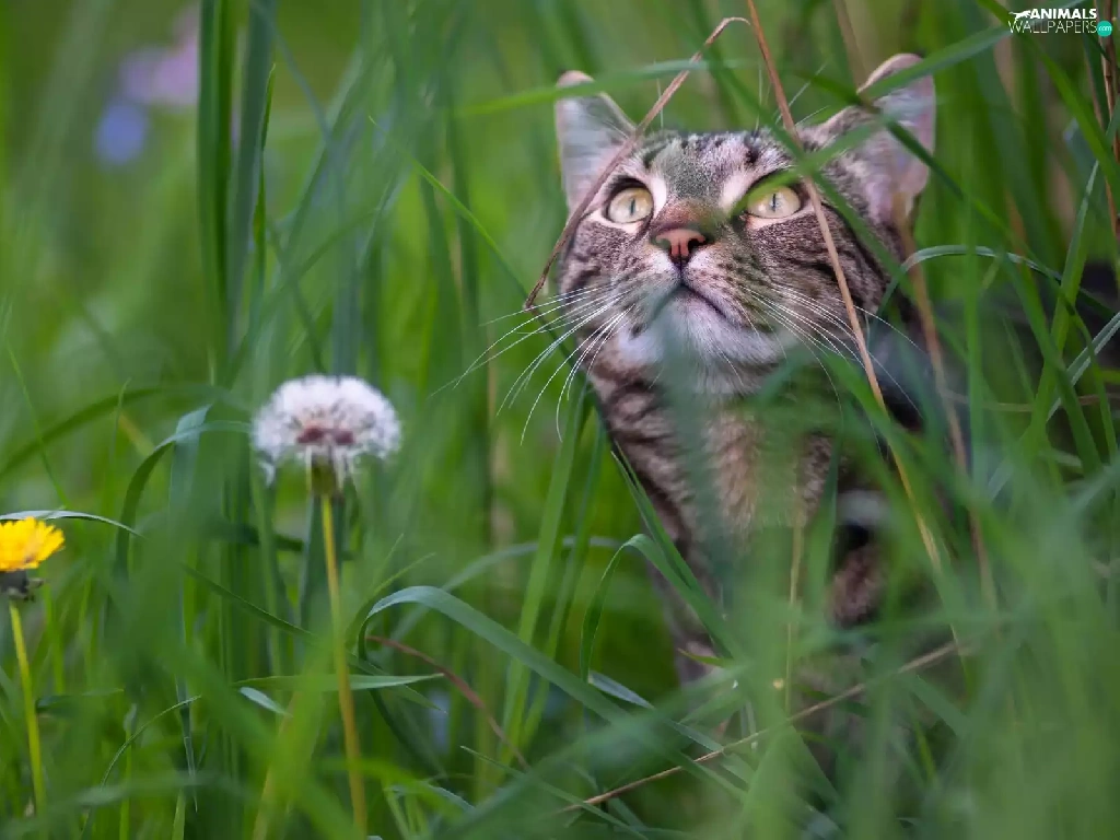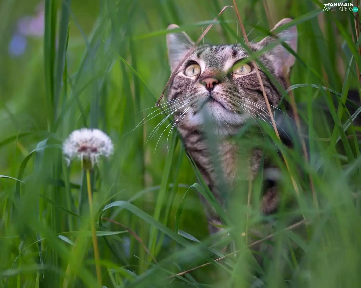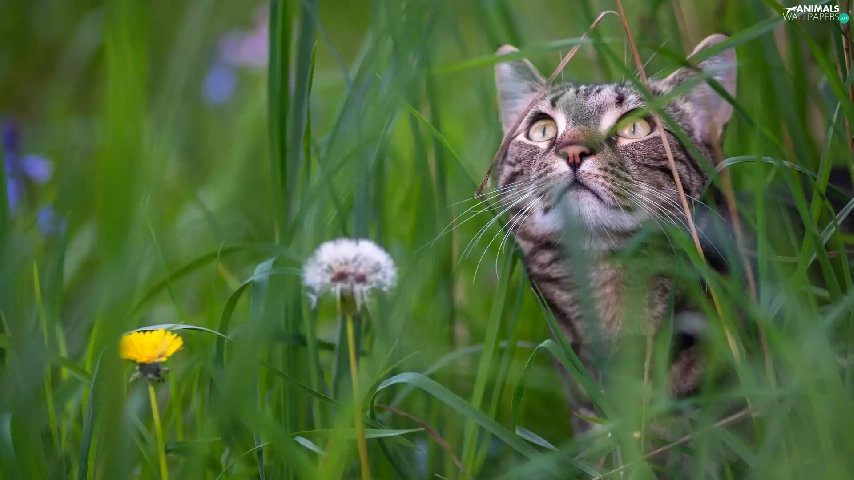 Meadow, dandelions, muzzle, grass, cat