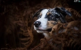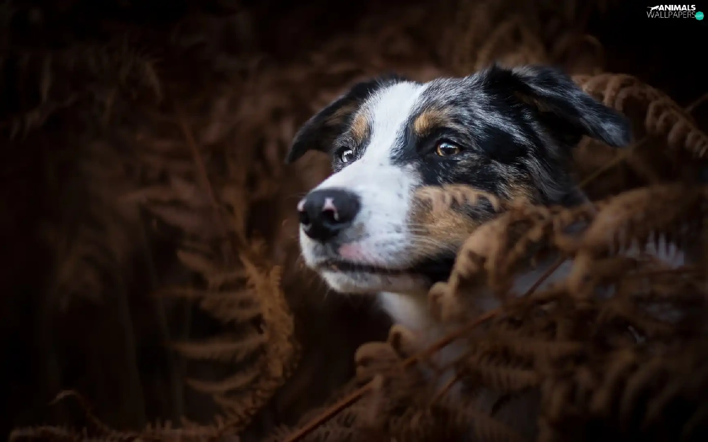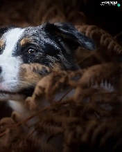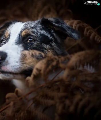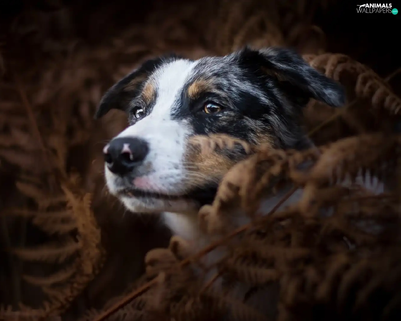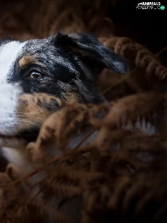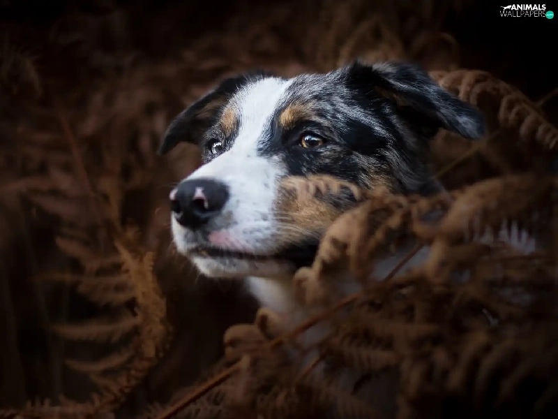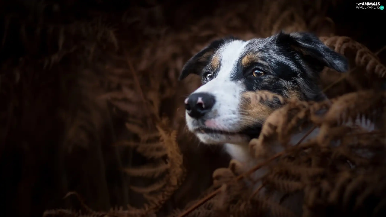 dog, fern, Dark Background, Australian Shepherd