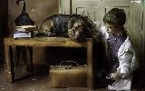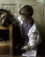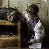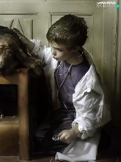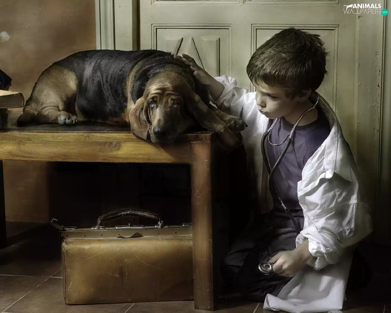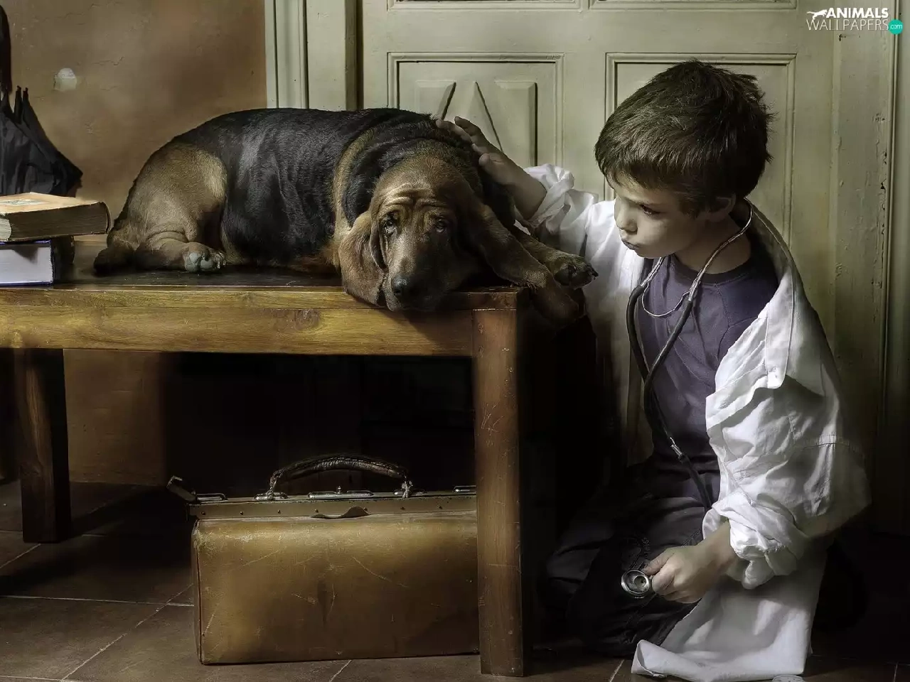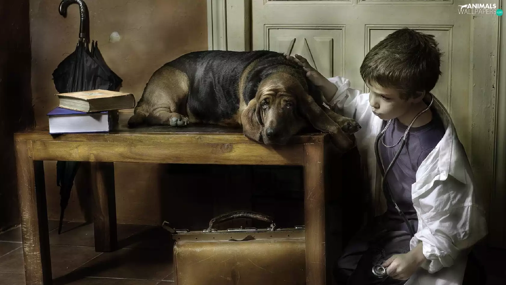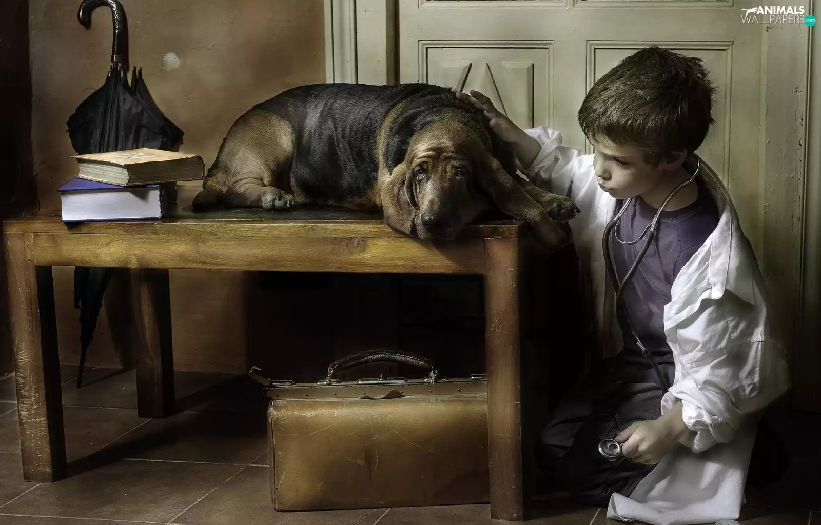 Table, dog, Umbrella, doctor, boy, Books, bag
