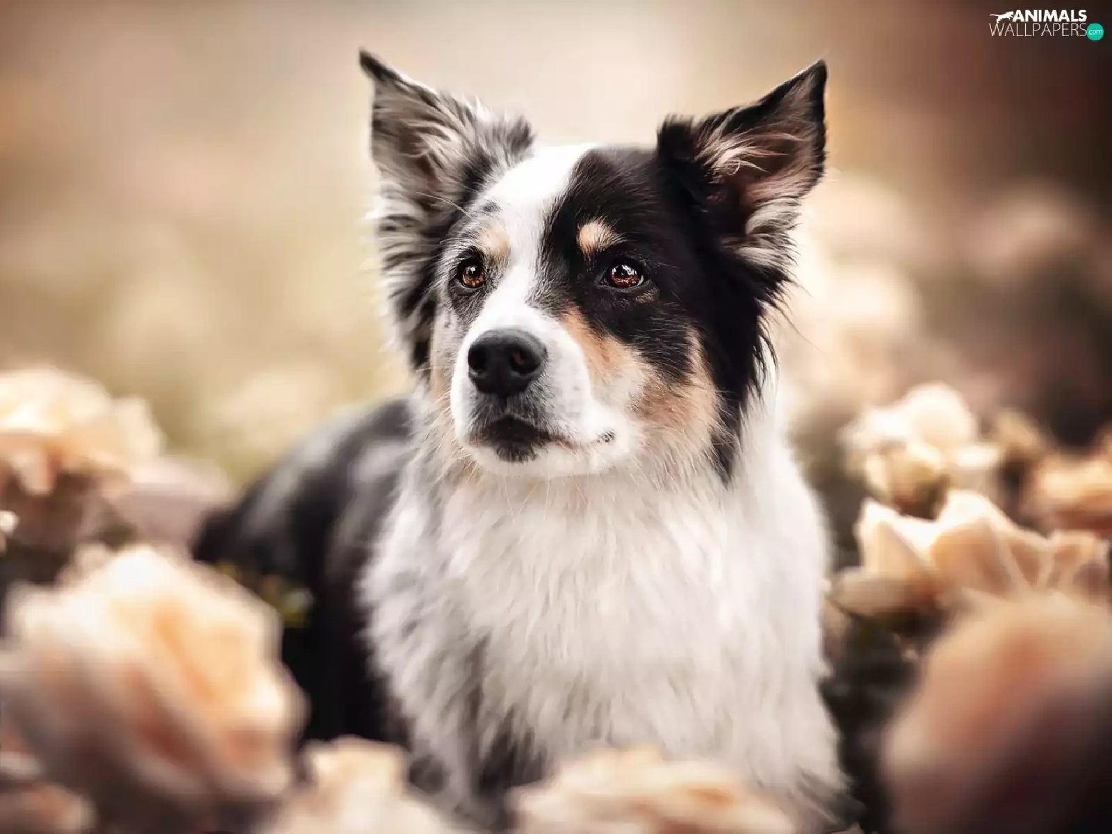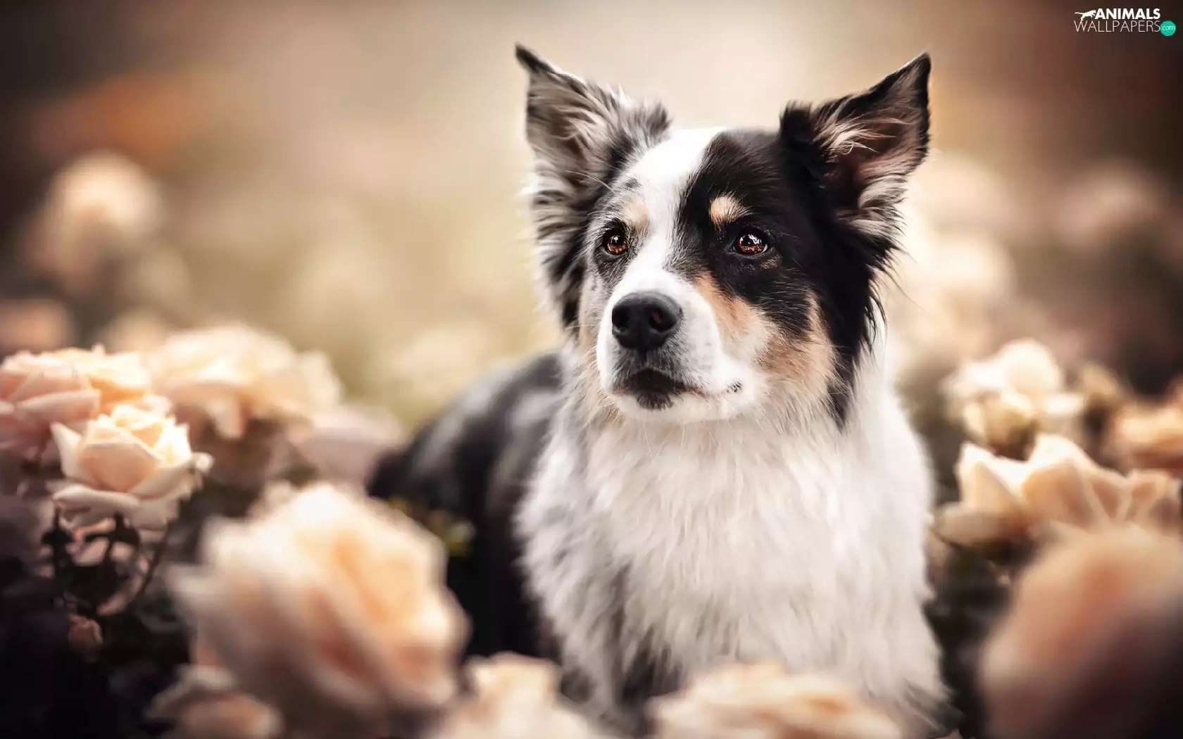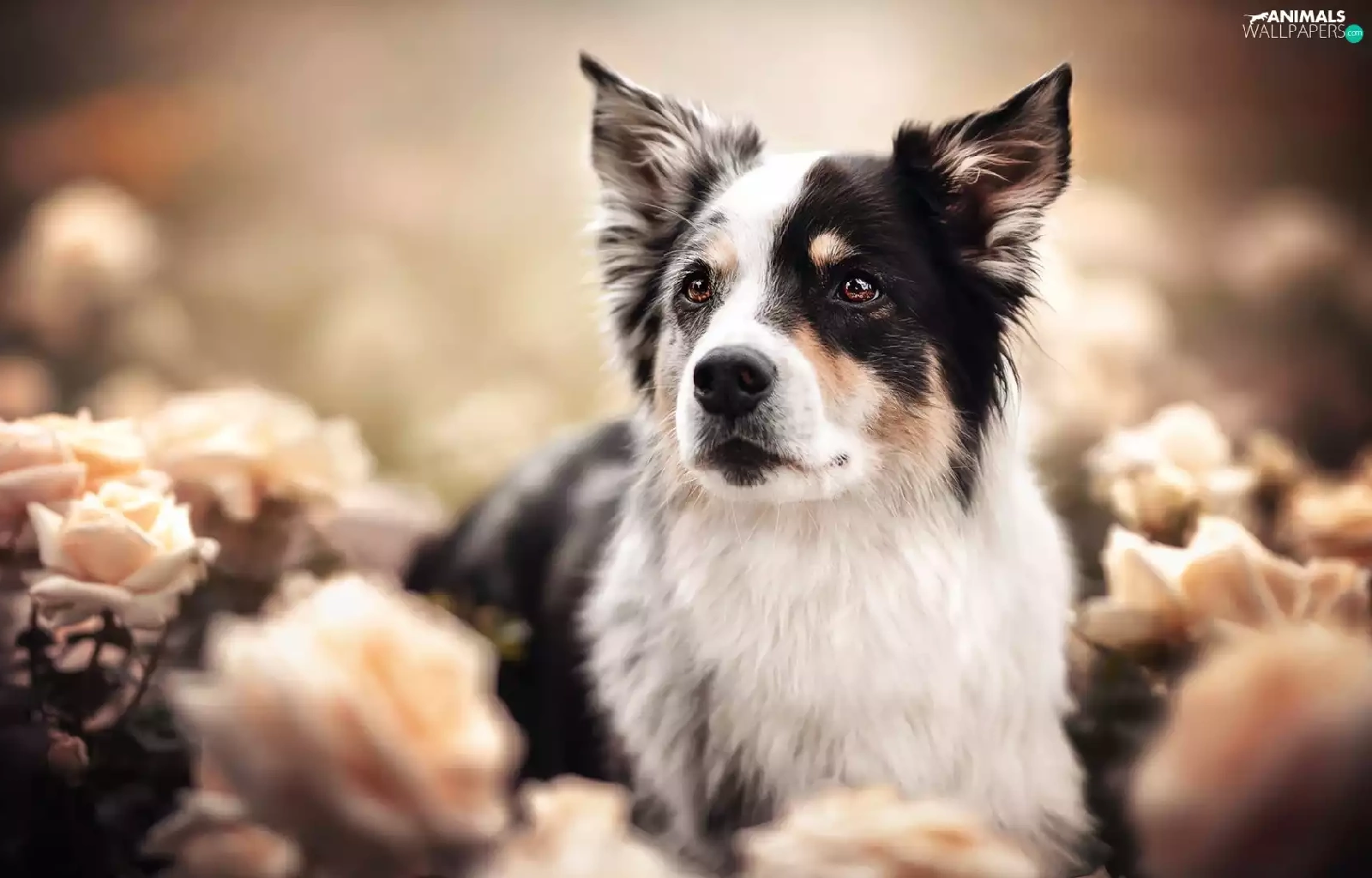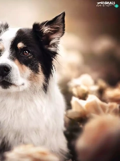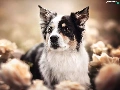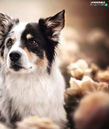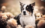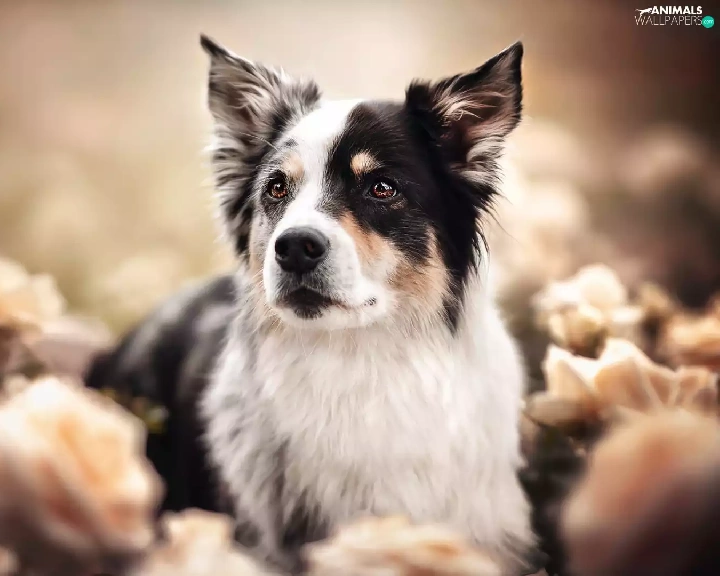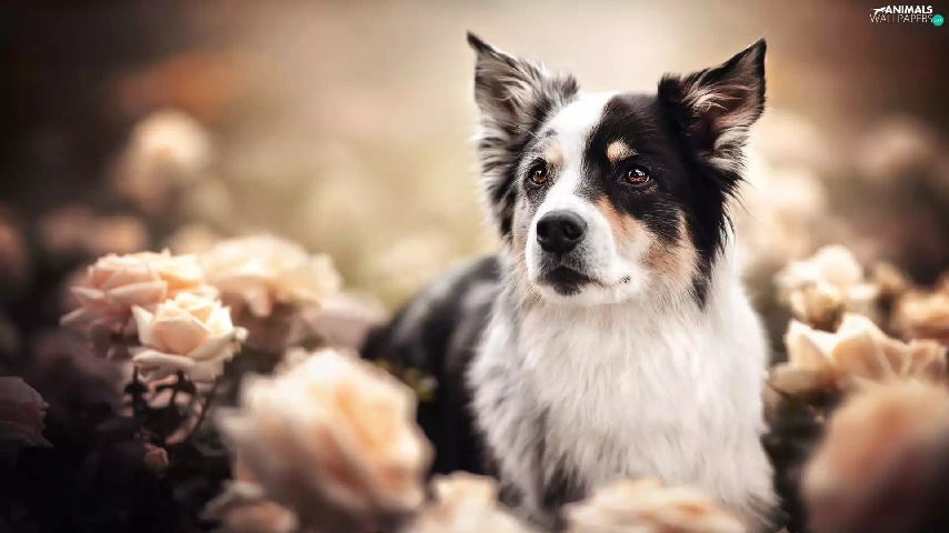roses, blur, black and white, Australian Shepherd, dog
