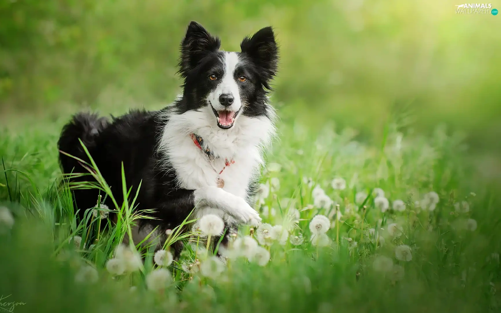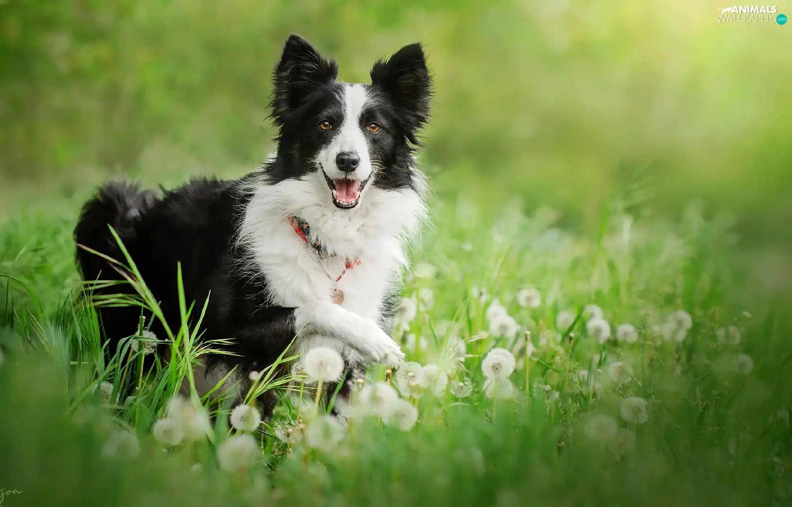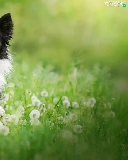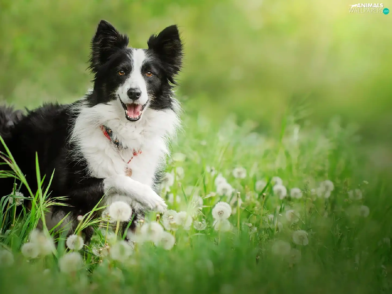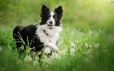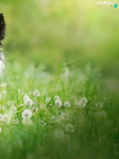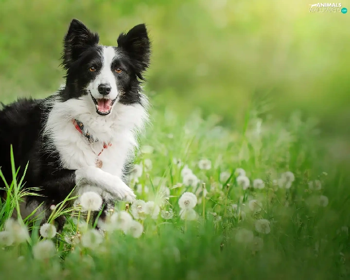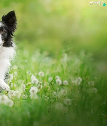 grass, dandelions, black and white, Border Collie, dog