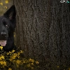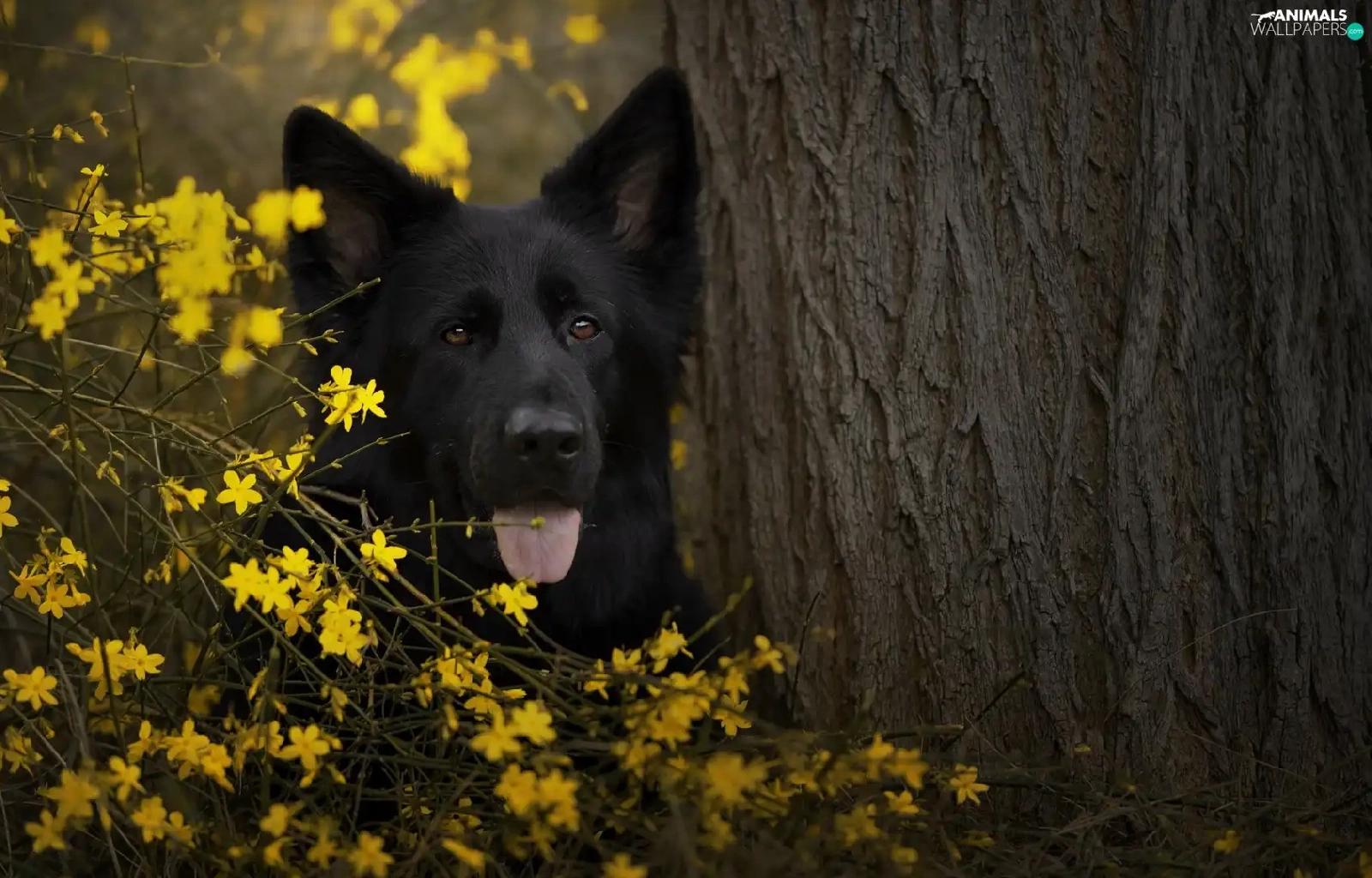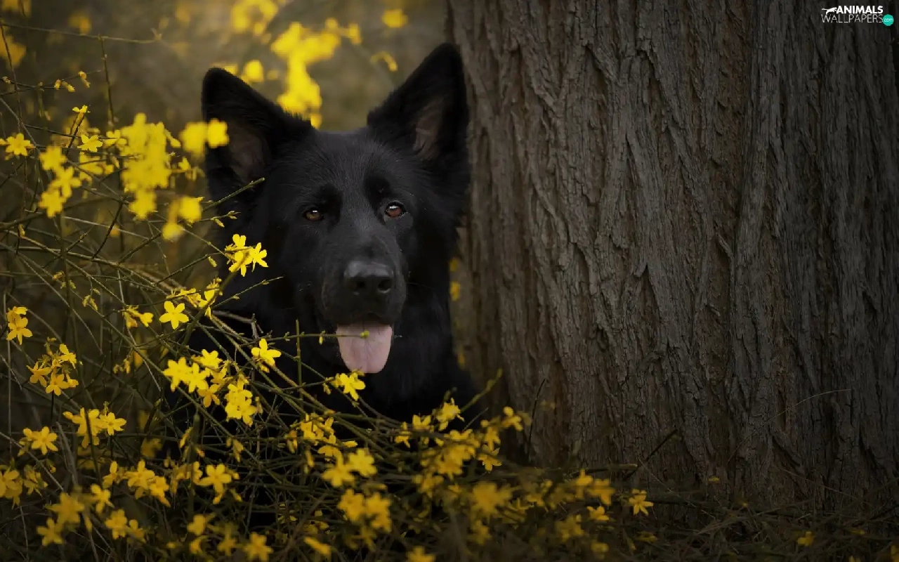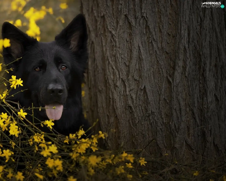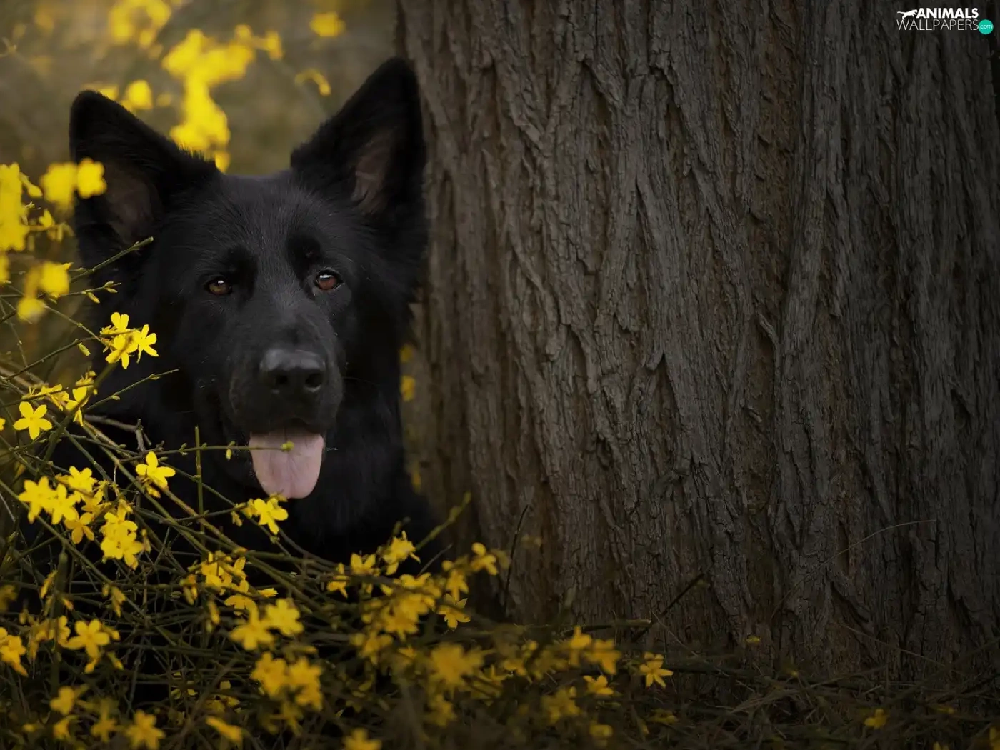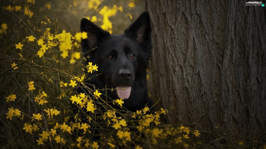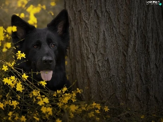 trees, Flowers, Black German Shepherd Dog, muzzle, dog