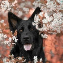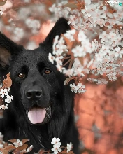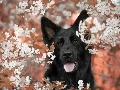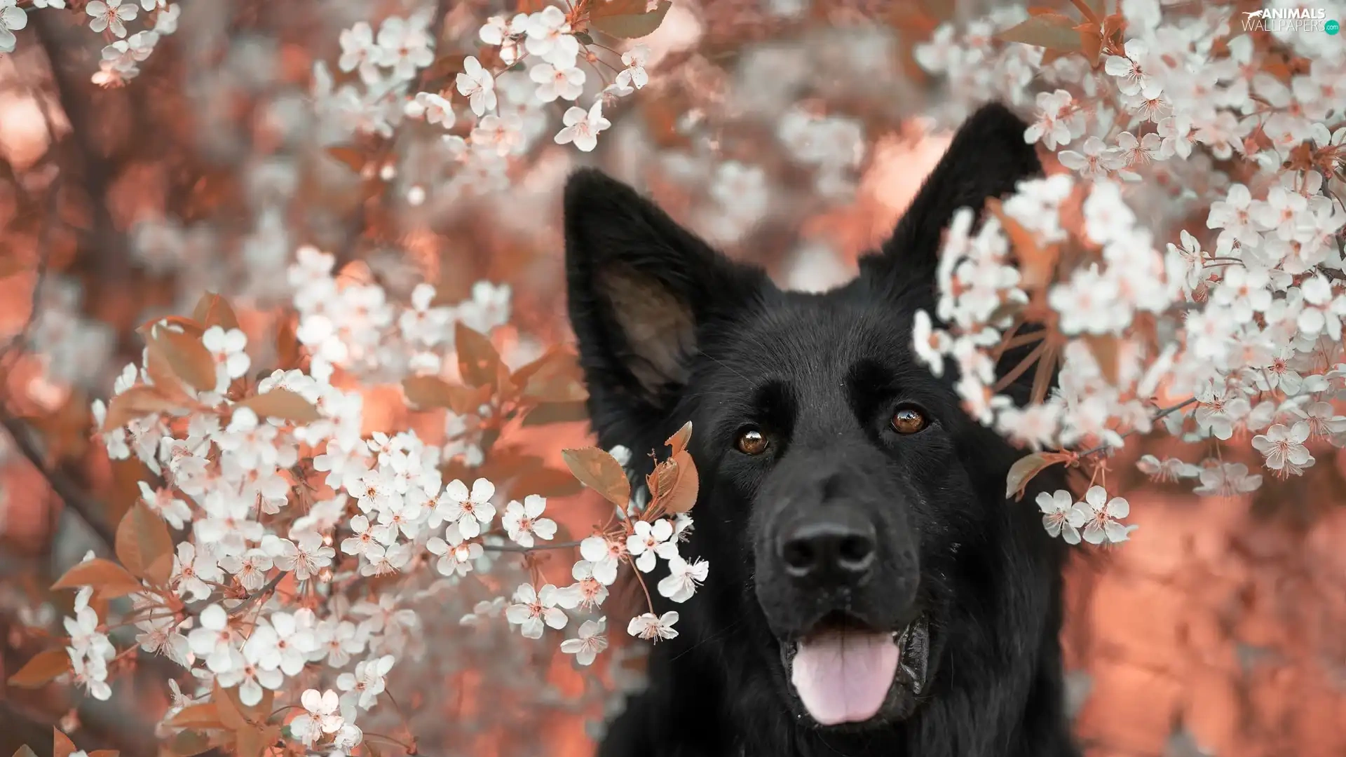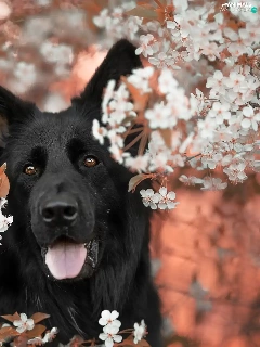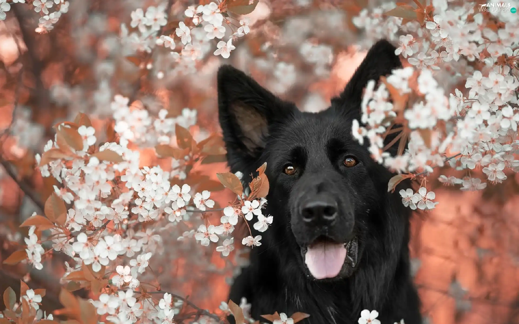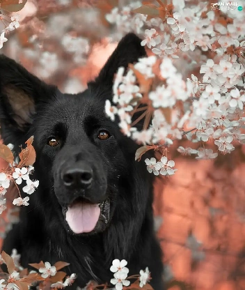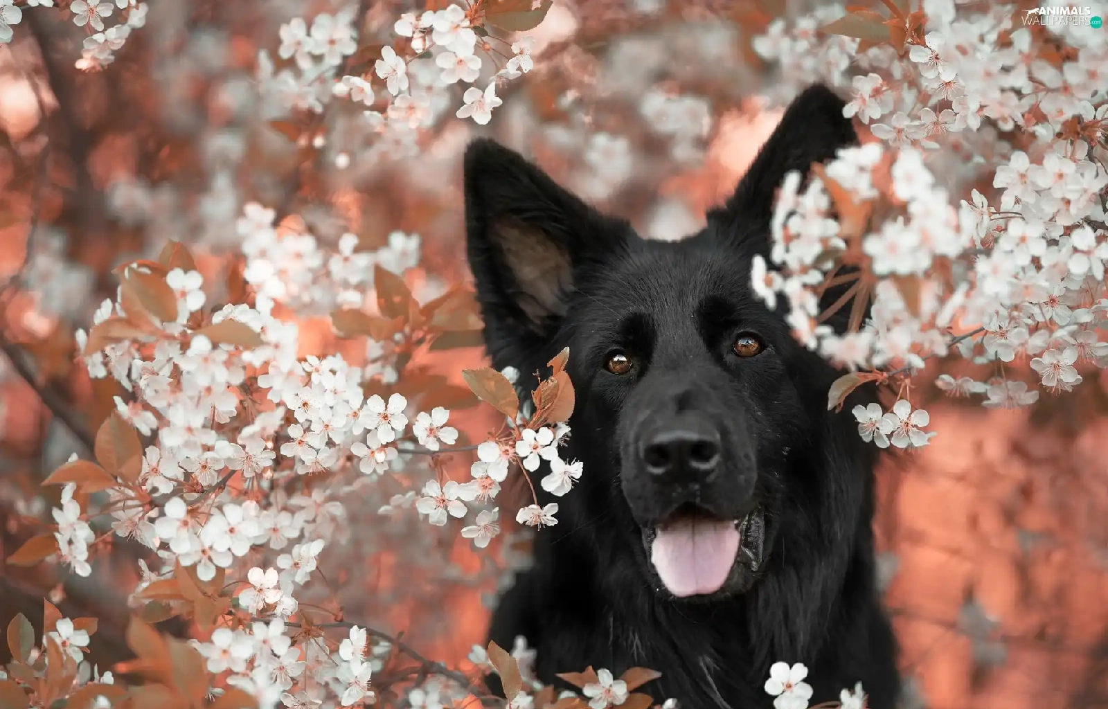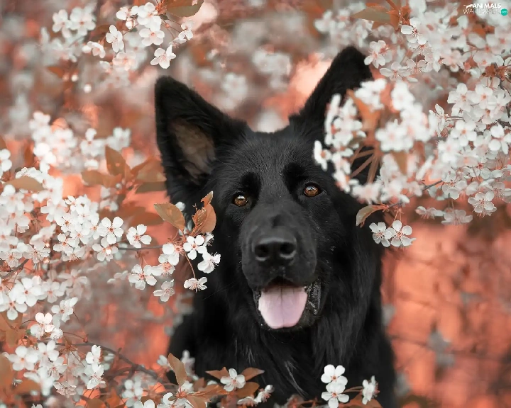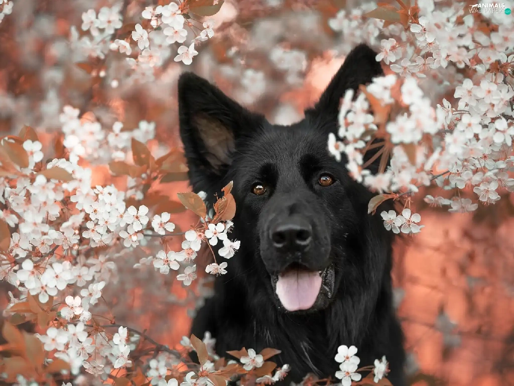 Flowers, Twigs, Black German Shepherd Dog, White, dog