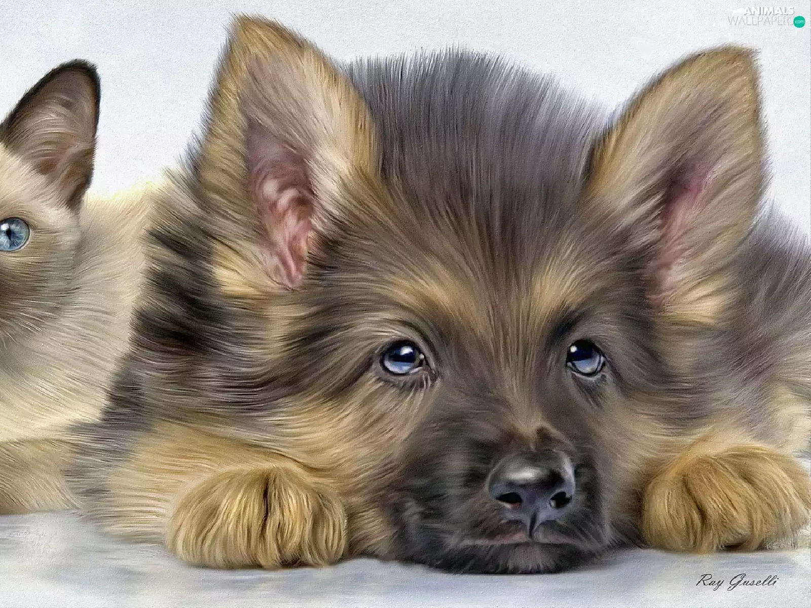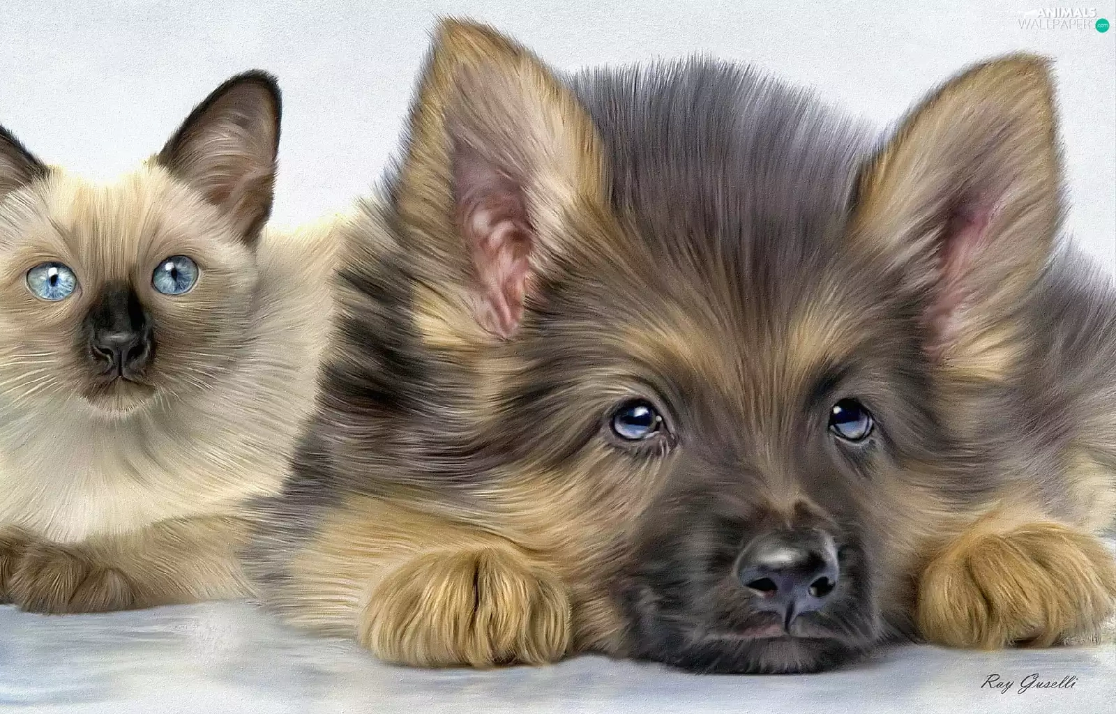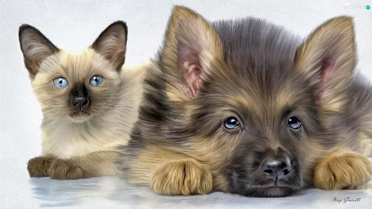 German Shepherd, graphics, dog, Puppy, Siamese Cat