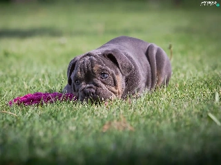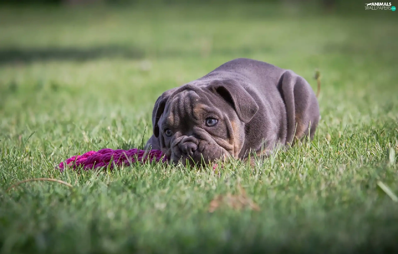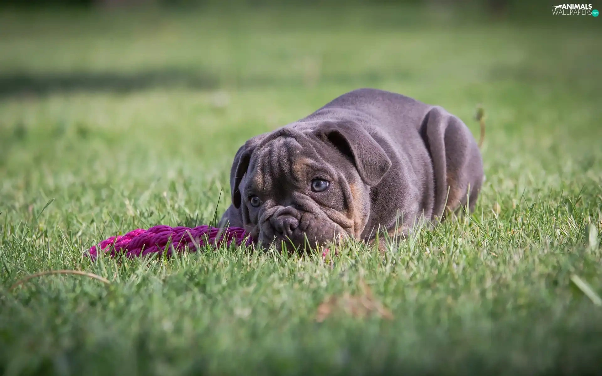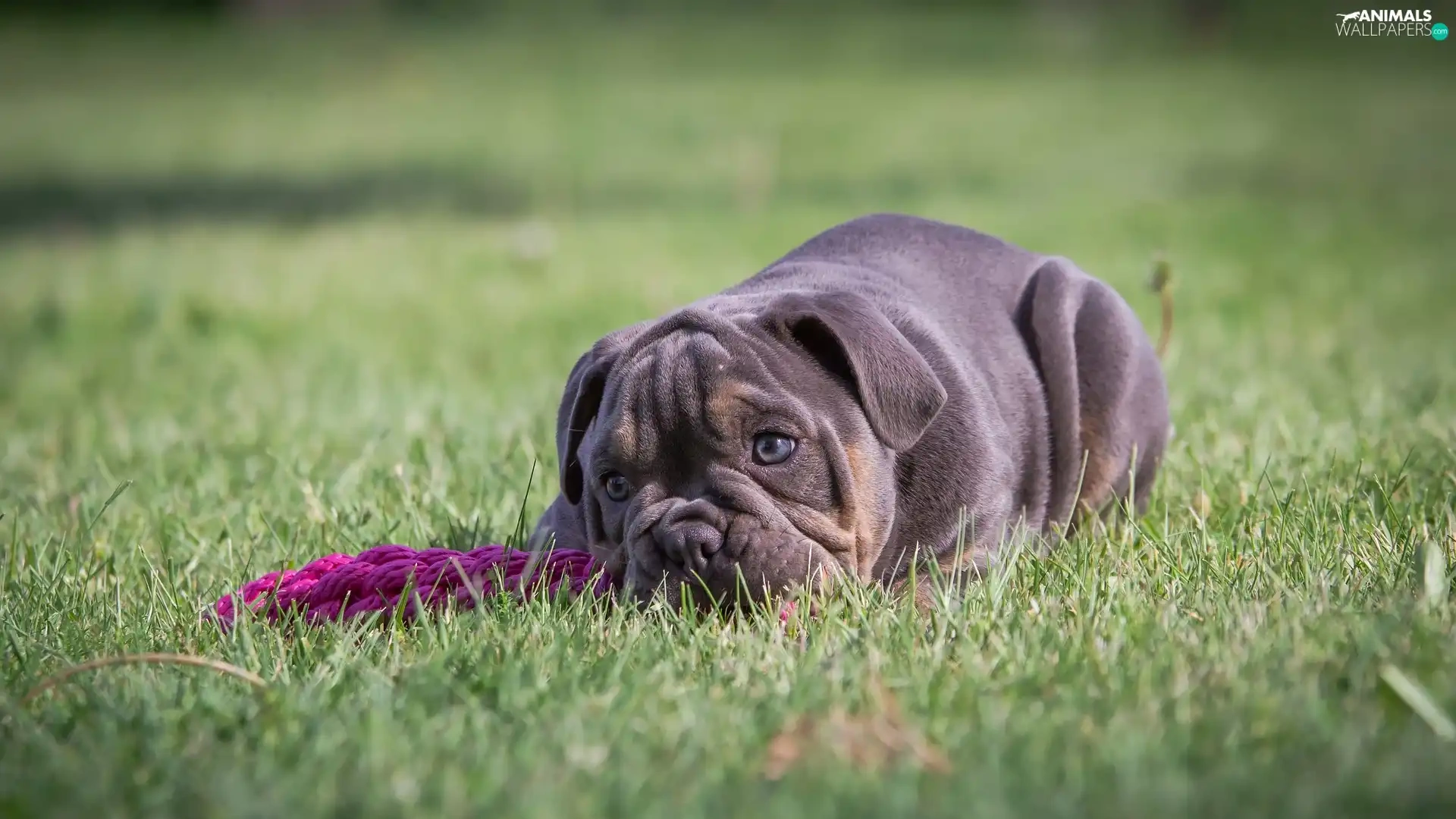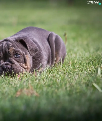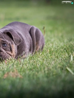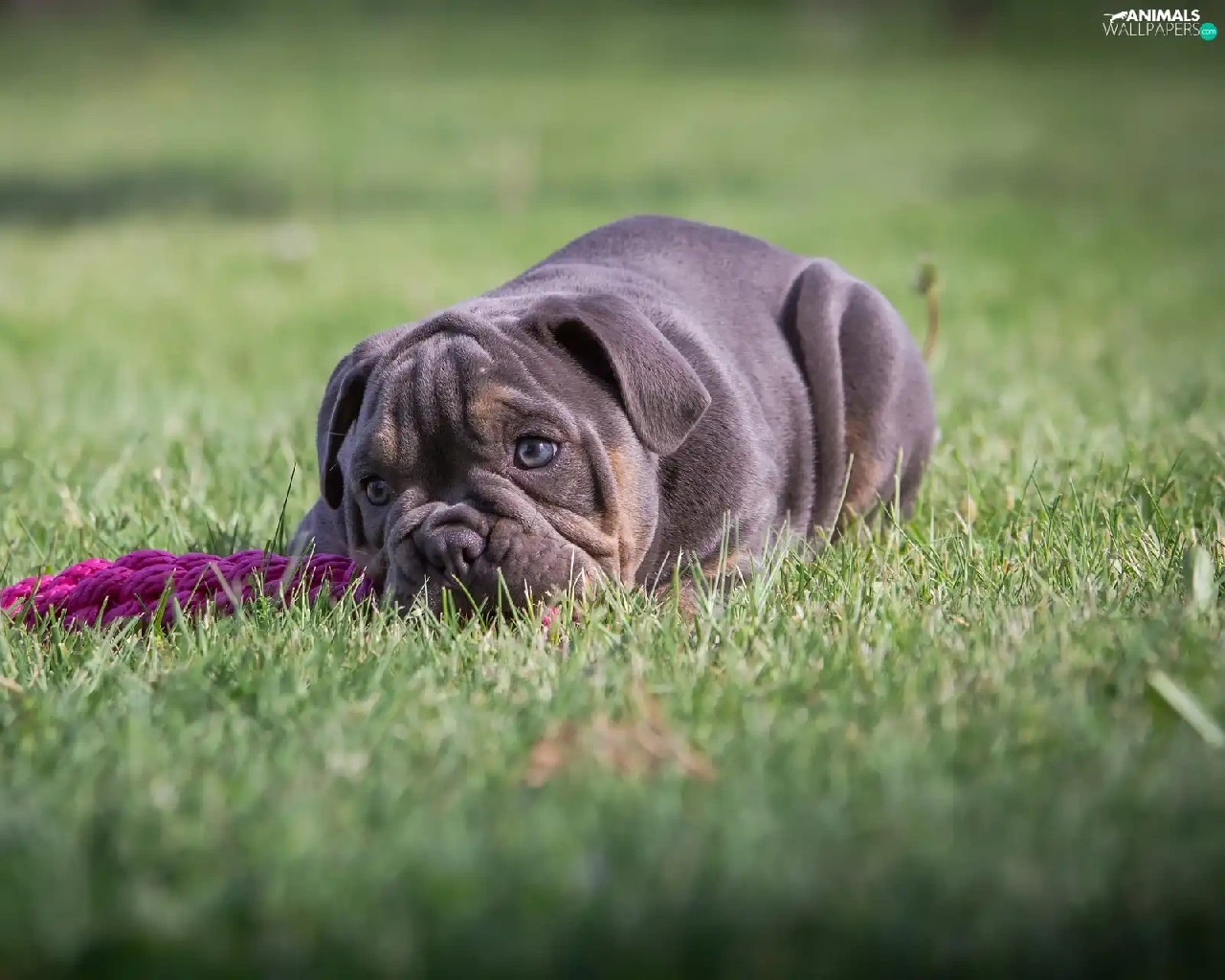English Bulldog, grass, dog, Puppy, lying
