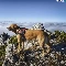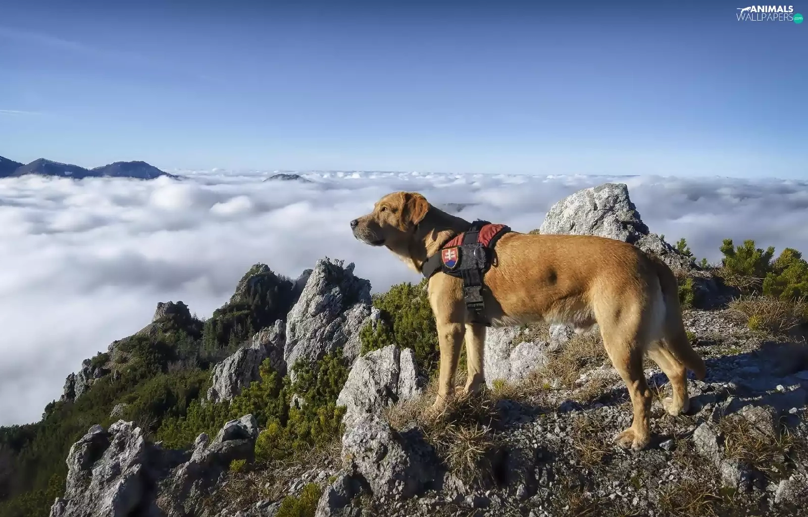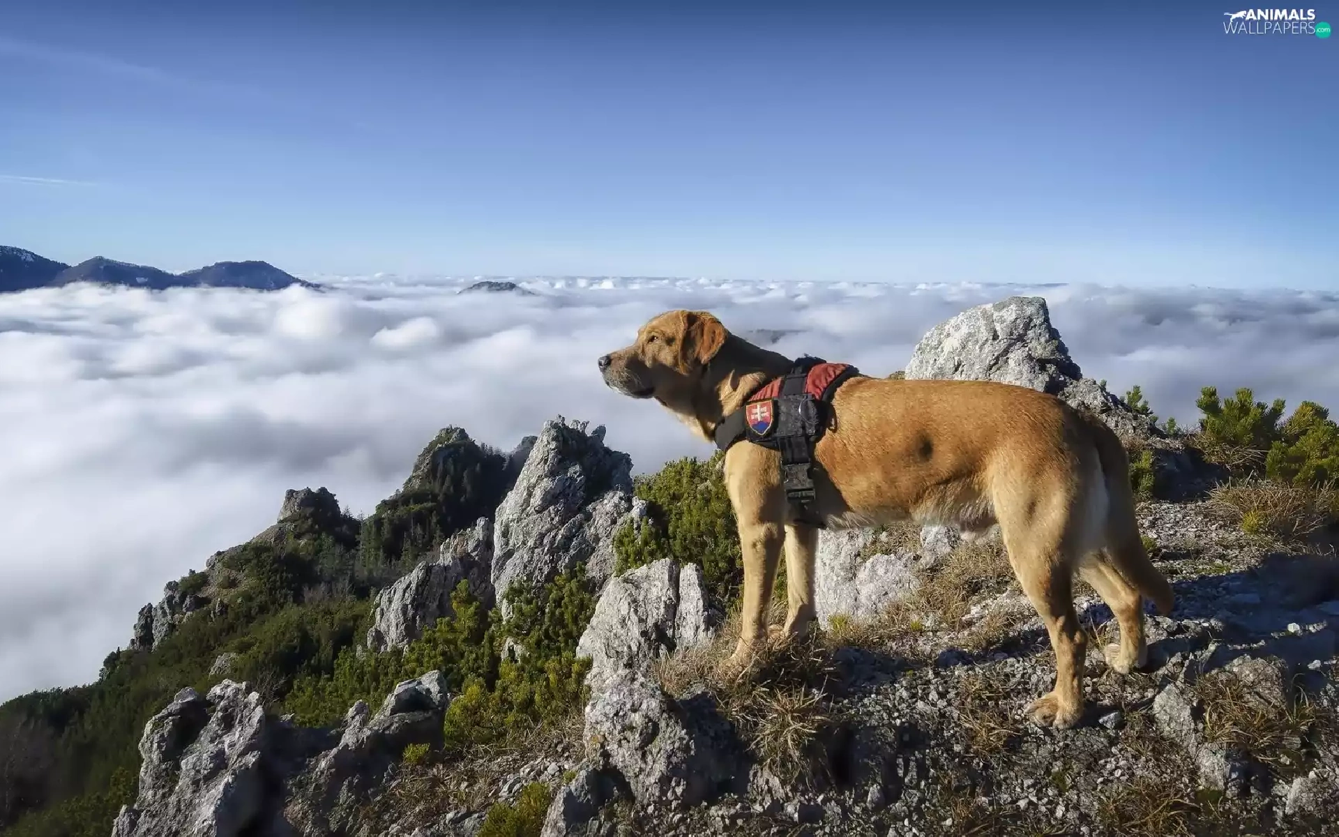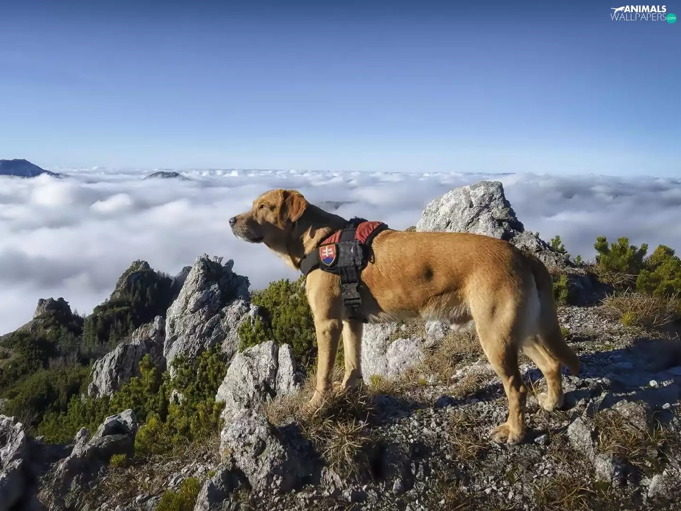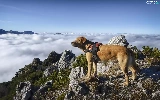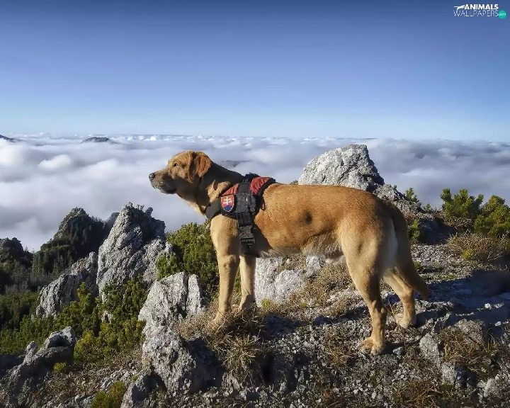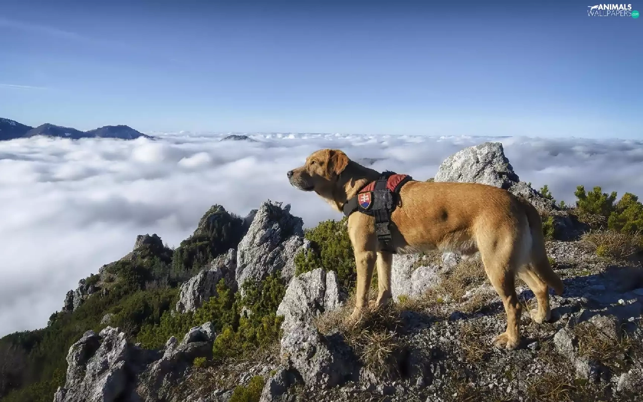 Mountains, rocks, clouds, dog