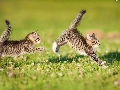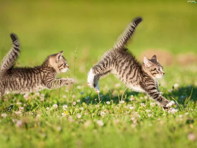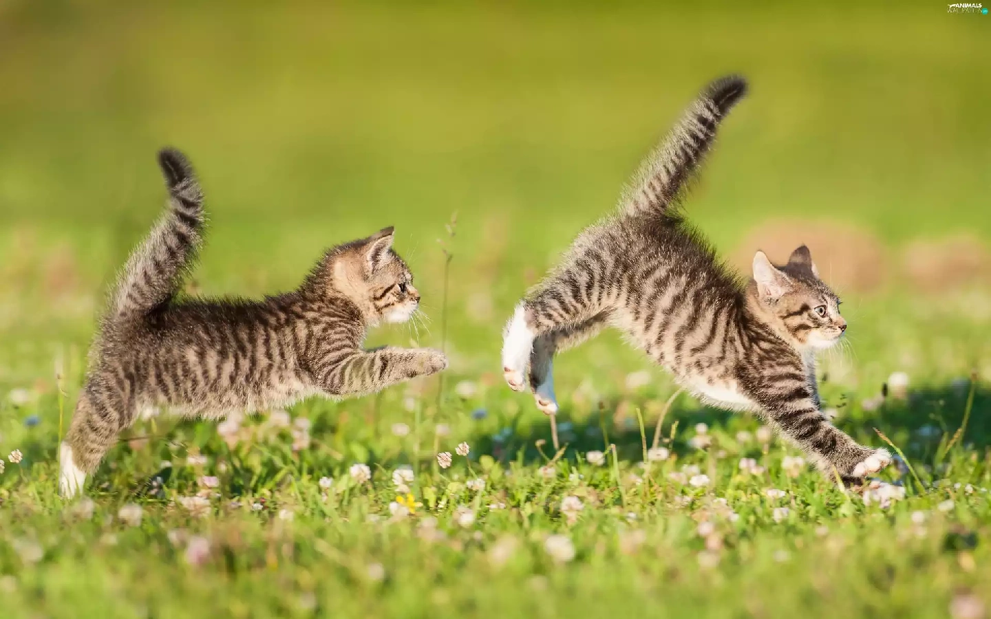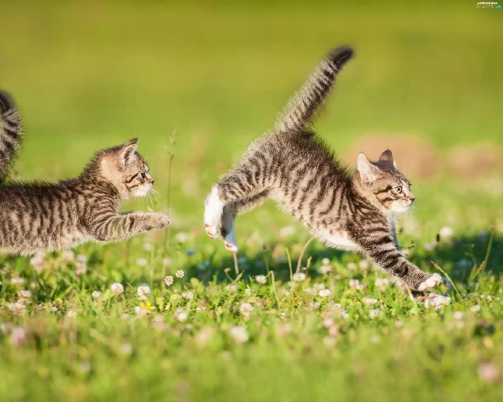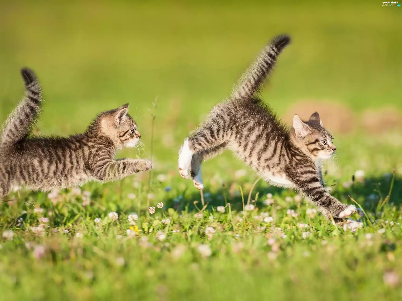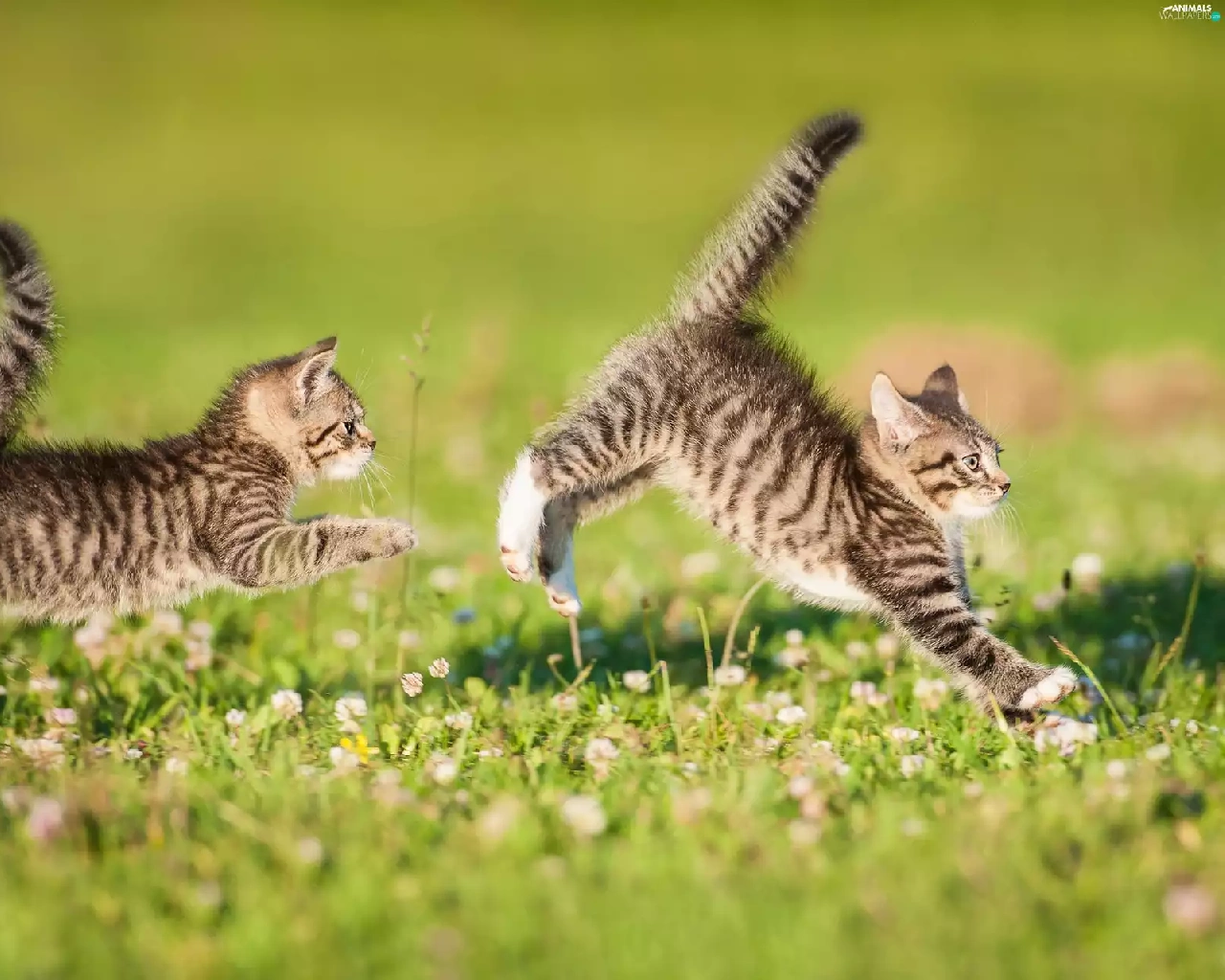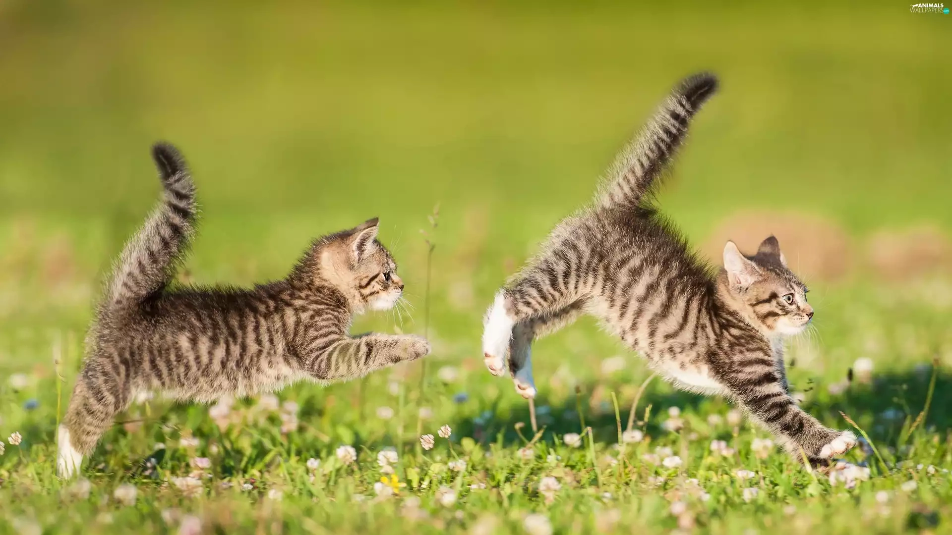 puss, Two cars, play, Meadow, twins, little doggies