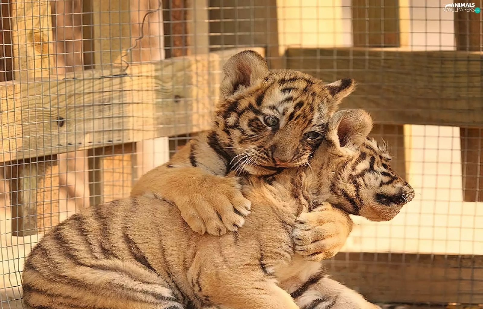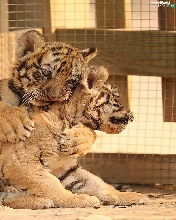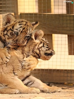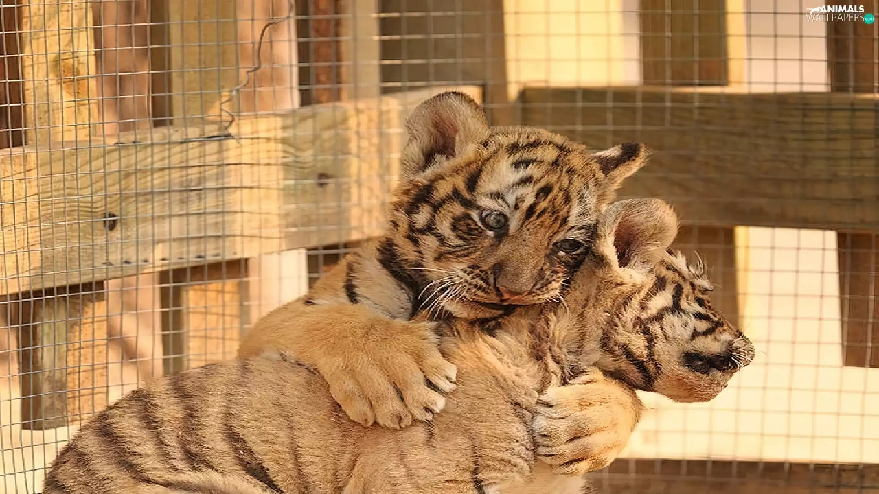Tigers, Cage, little doggies, cuddled, Two cars