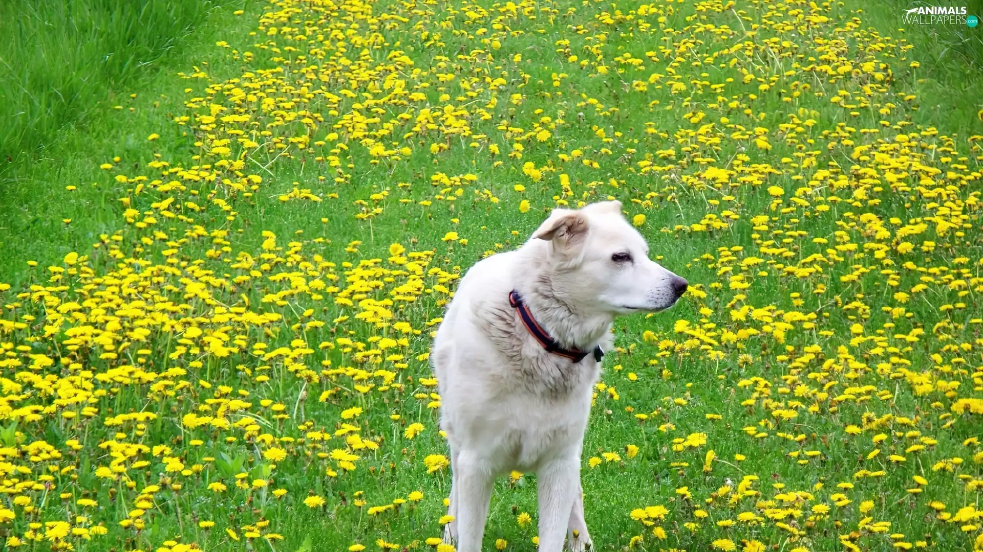 White, Meadow, dandelions, doggy