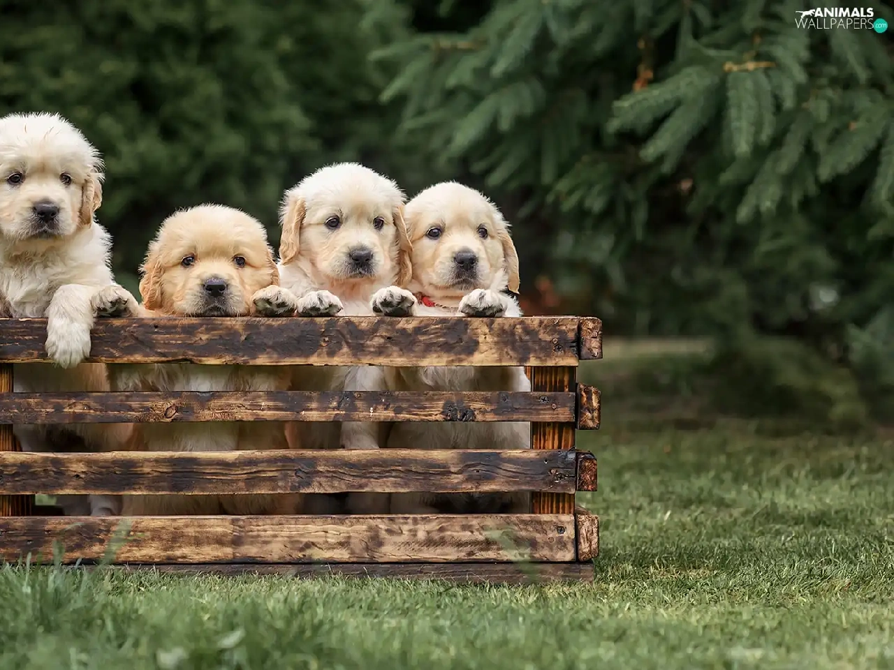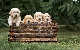 Golden Retrievery, box, Dogs, puppies, four