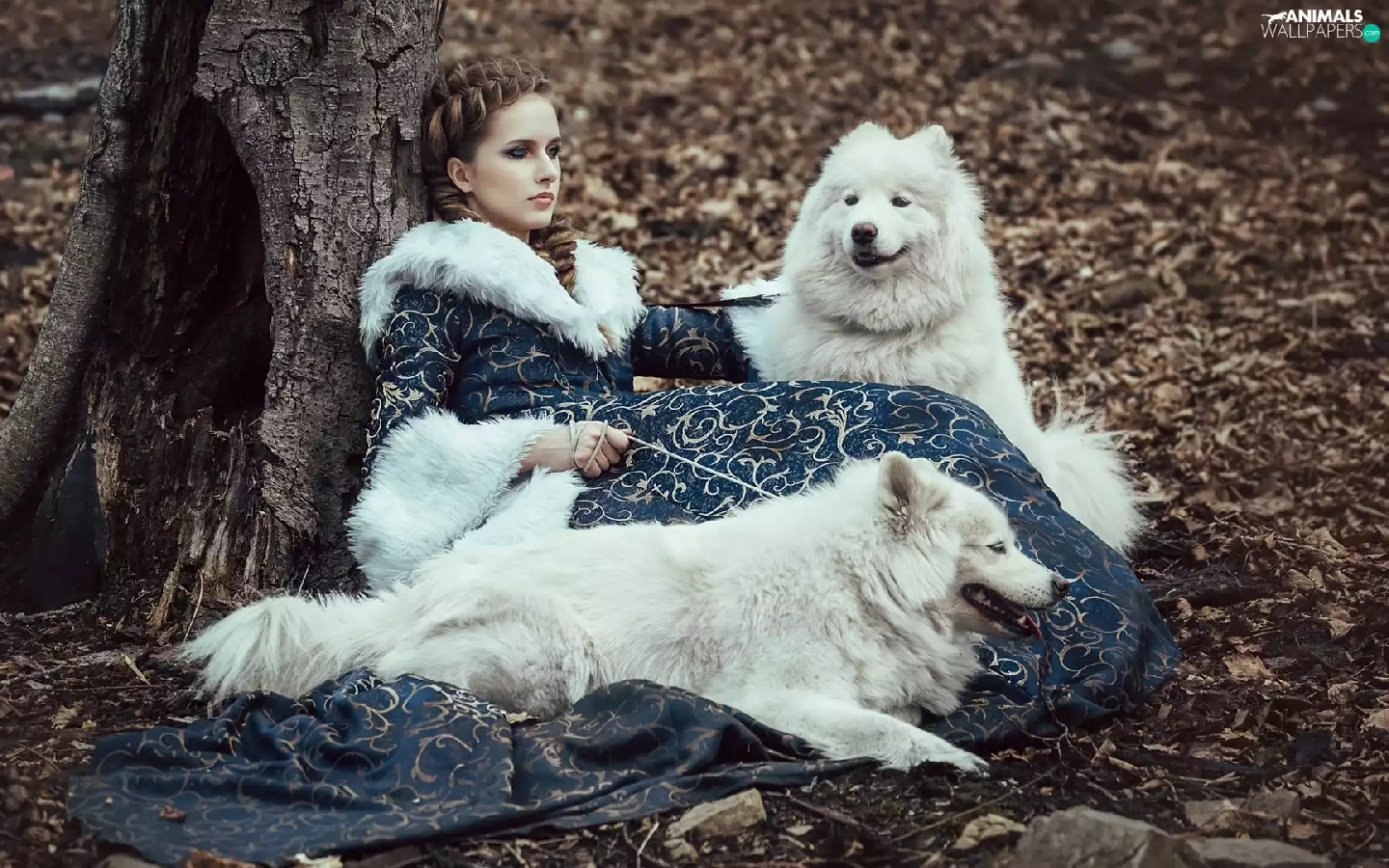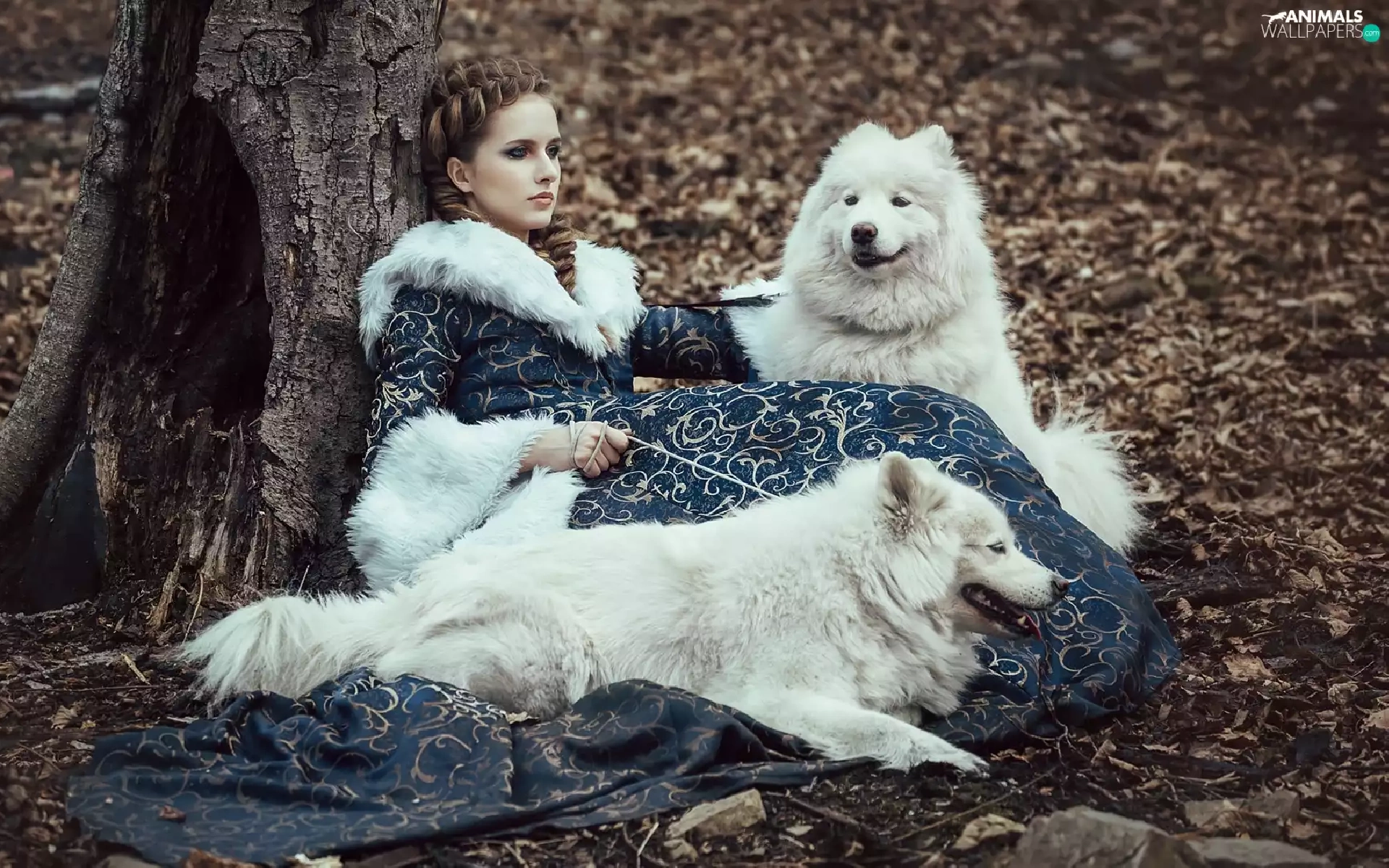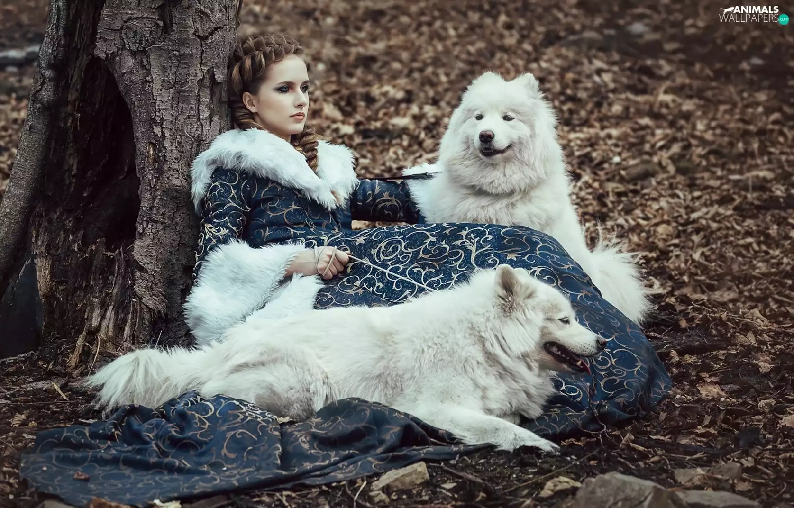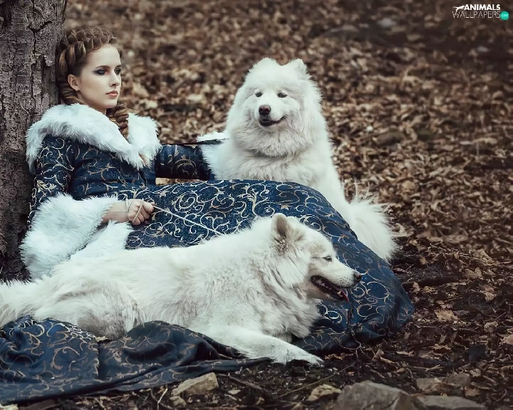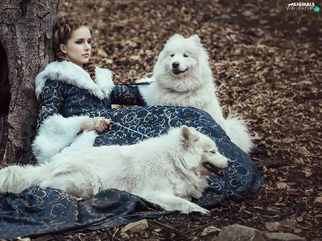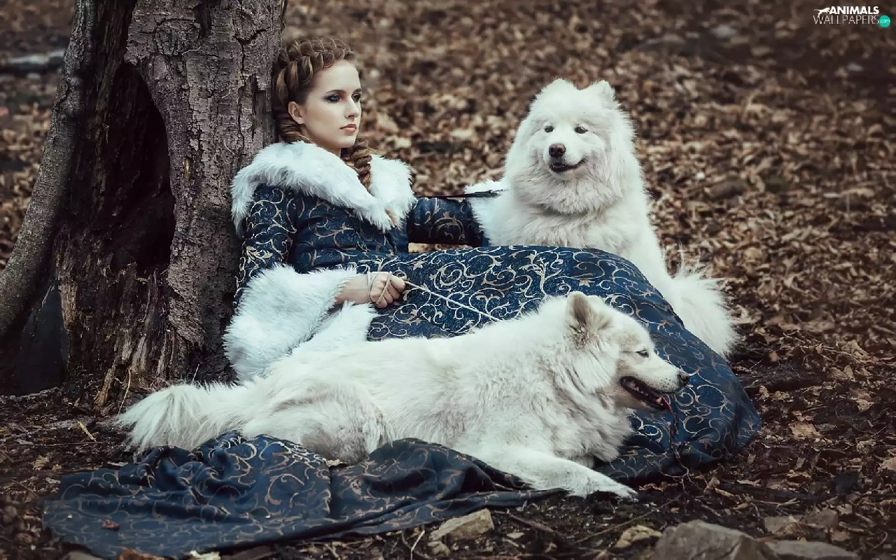 Women, Dogs, Samojedy, Two cars
