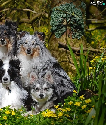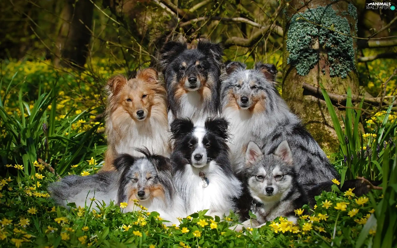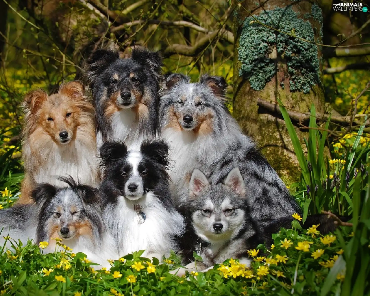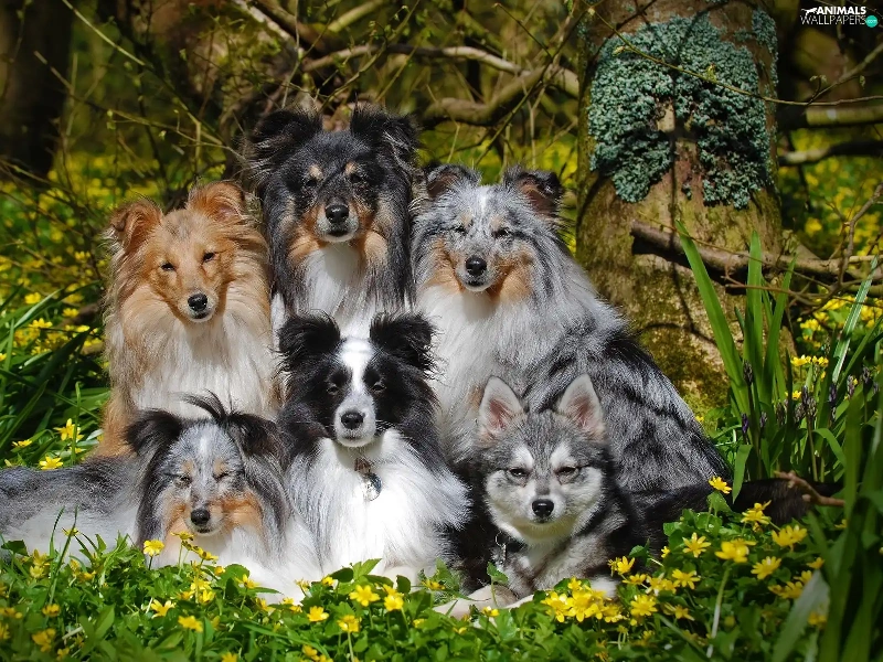 Shetland Sheepdogs, Flowers, dogs, mongrel, six