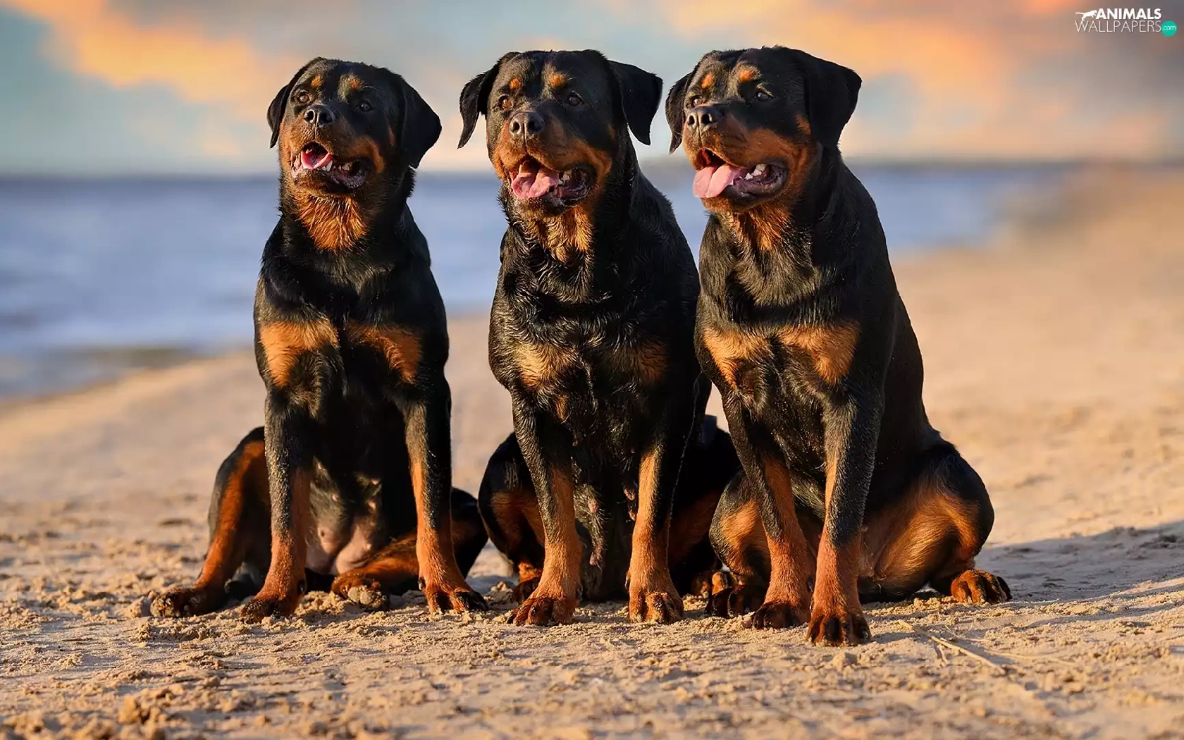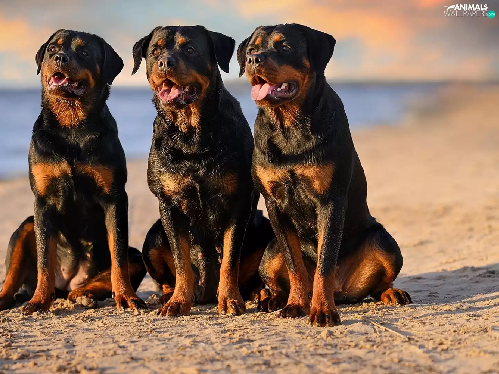 Three, Rottweilers, Beaches, Dogs