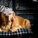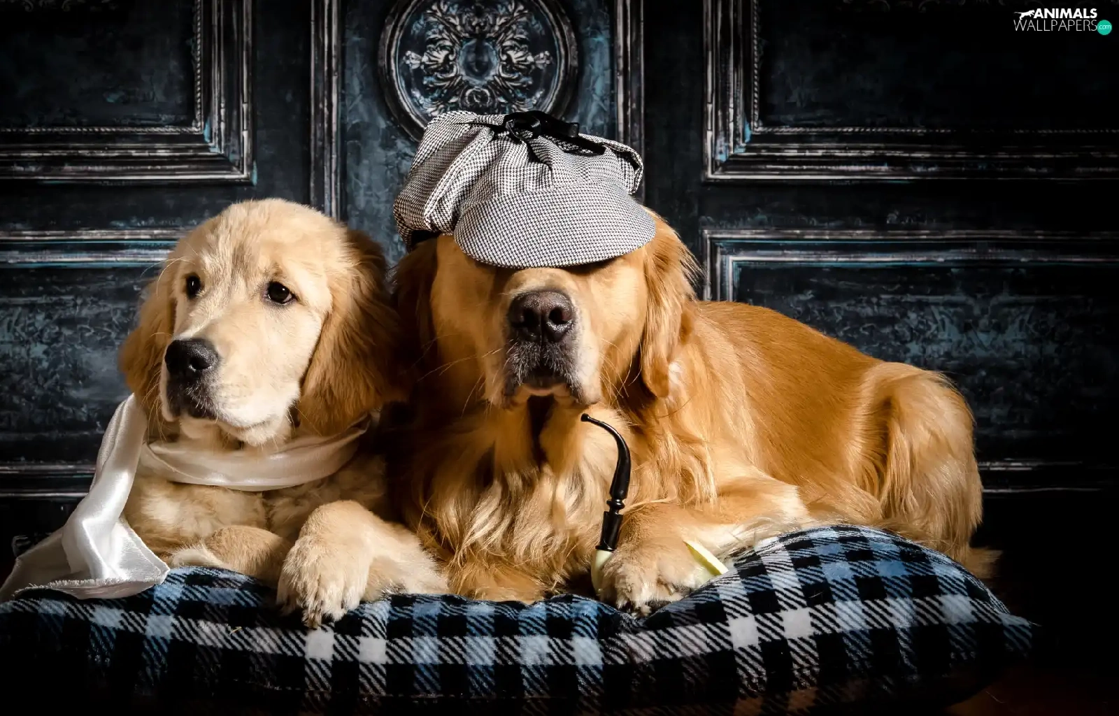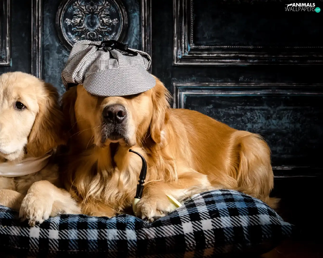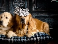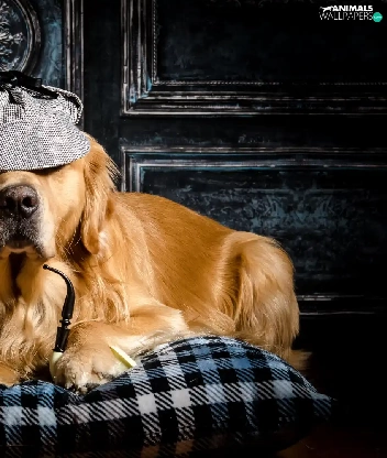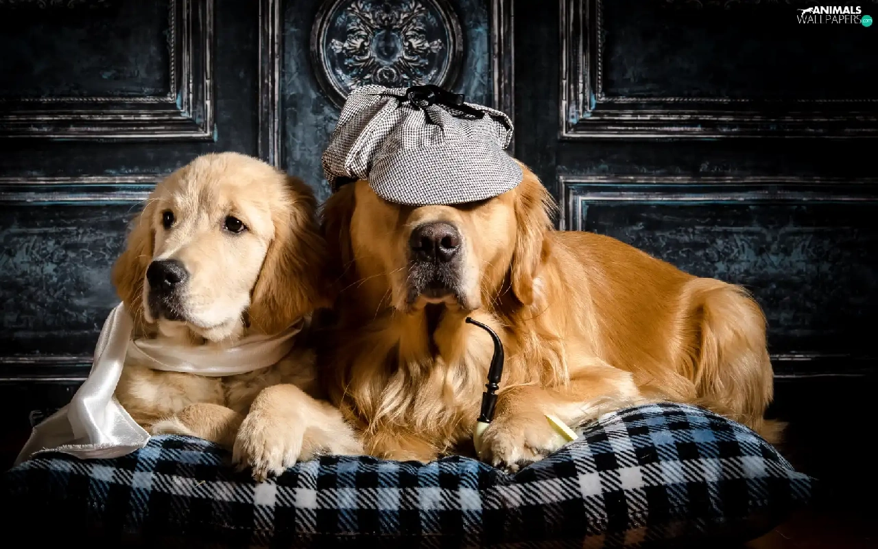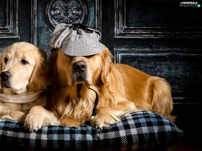 Golden Retriever, Two cars, shawl, Pillow, Hat, Dogs