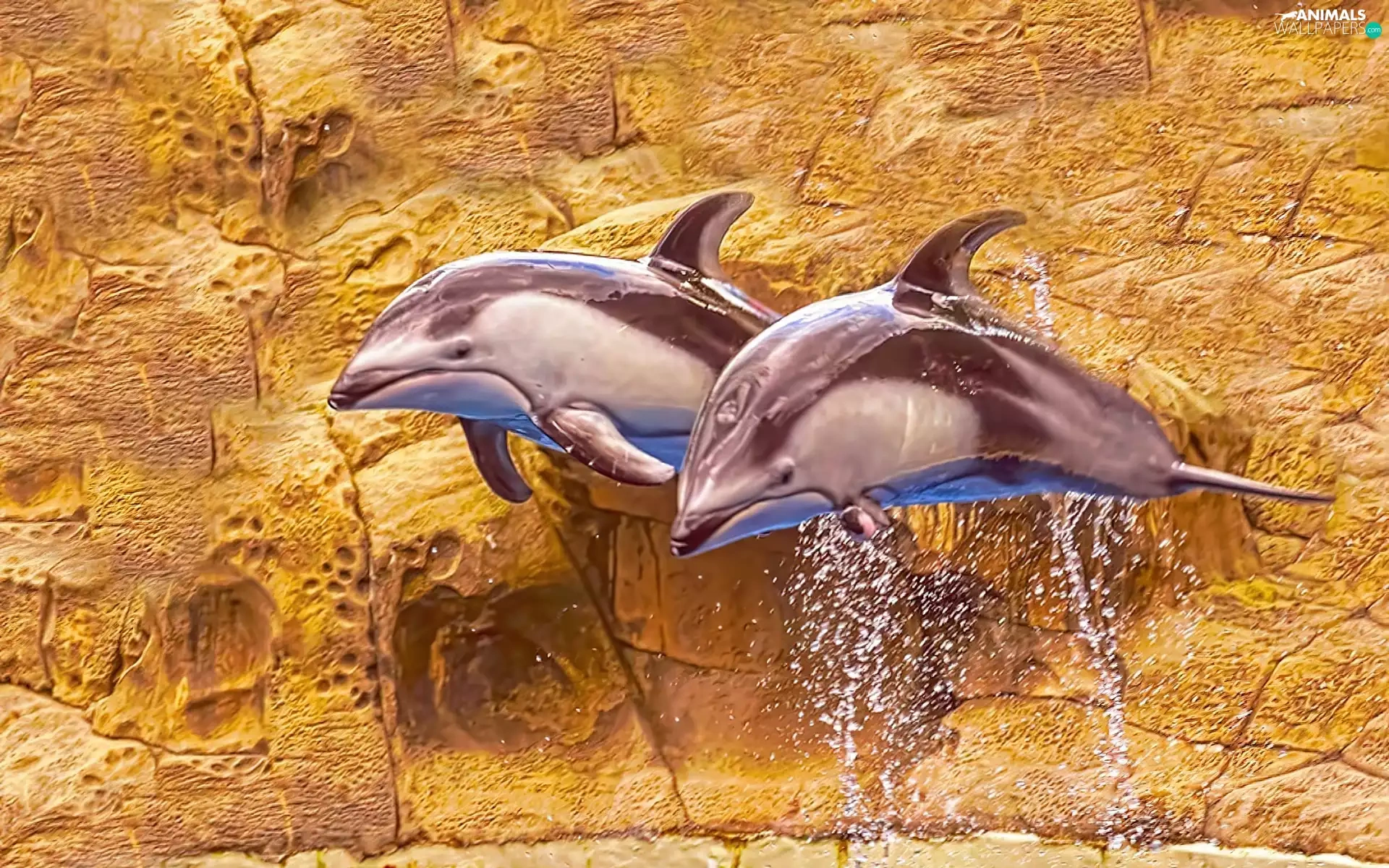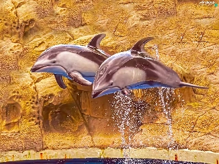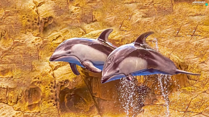 rocks, Two cars, dolphins