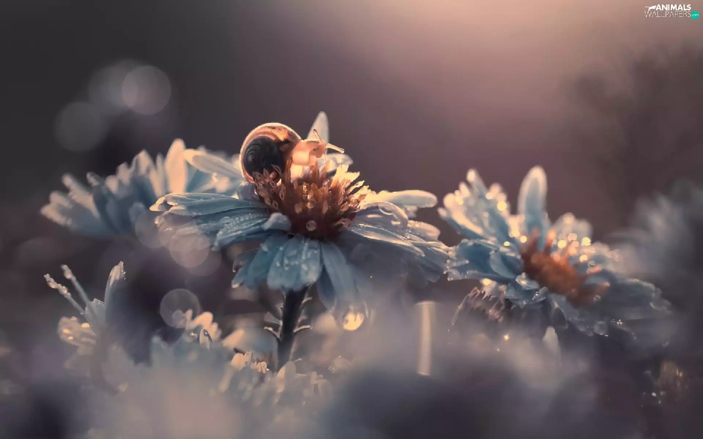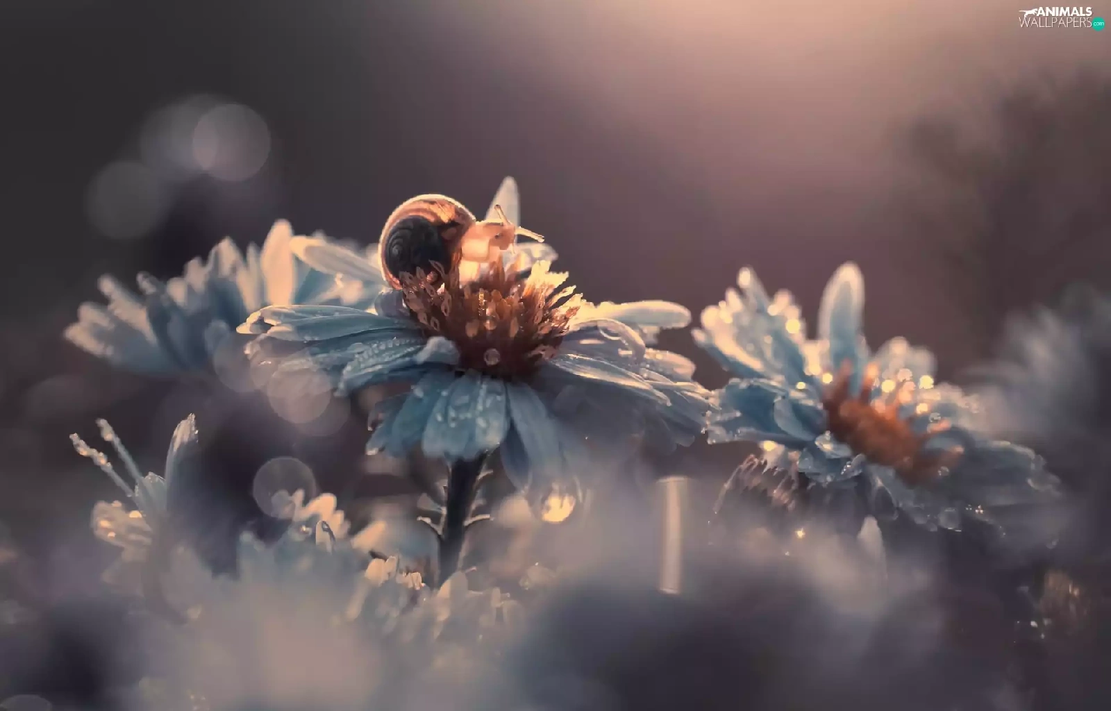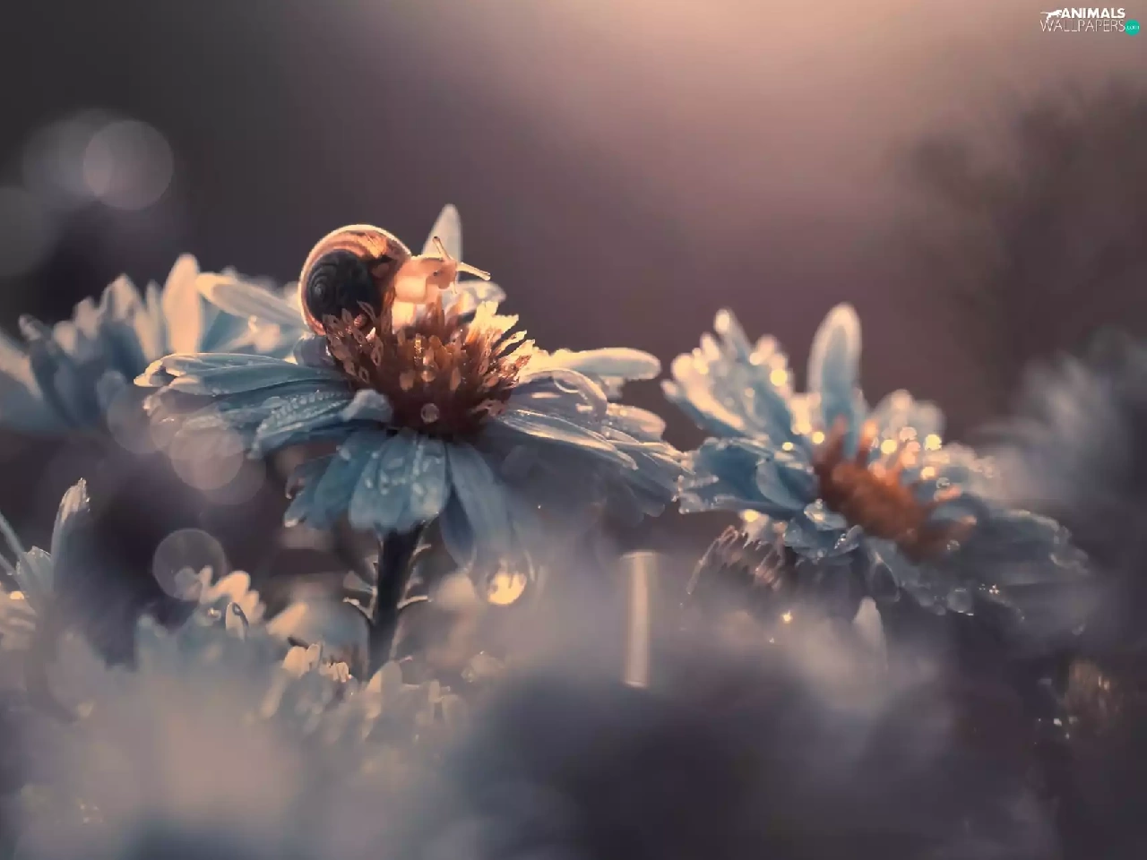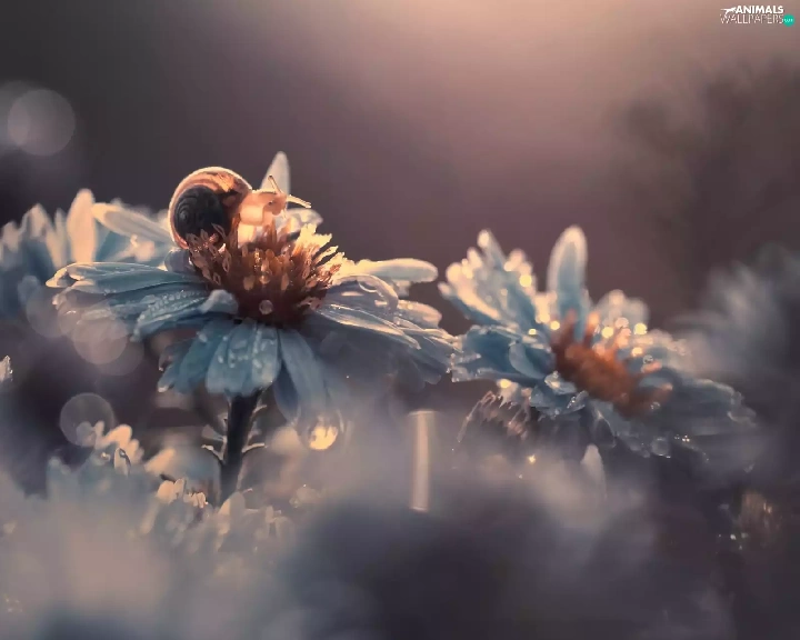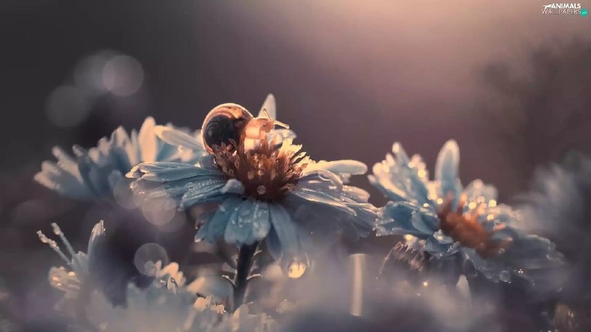 Flowers, dew, snail, drops