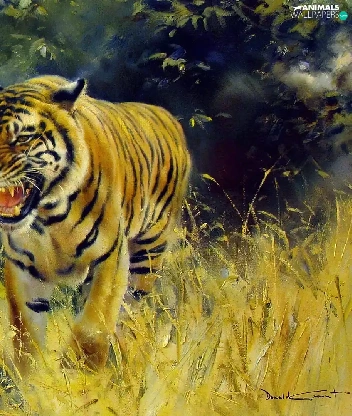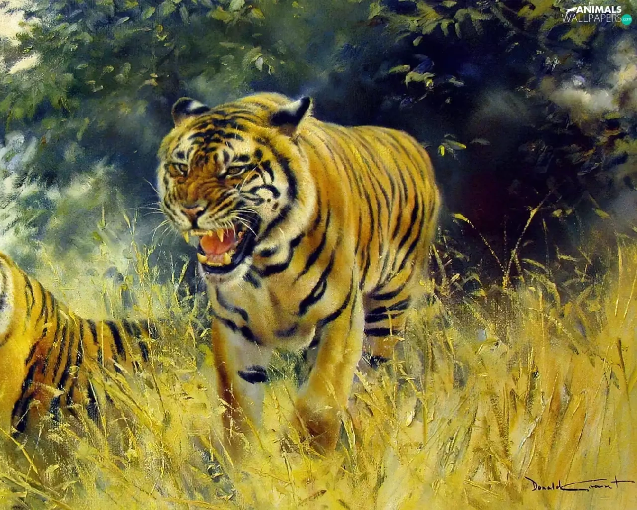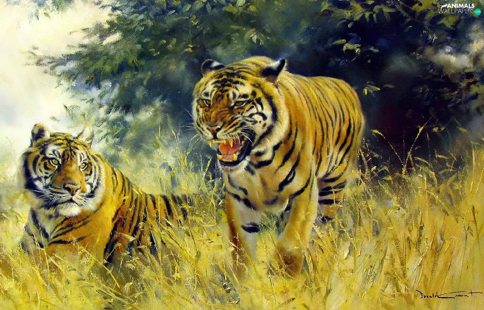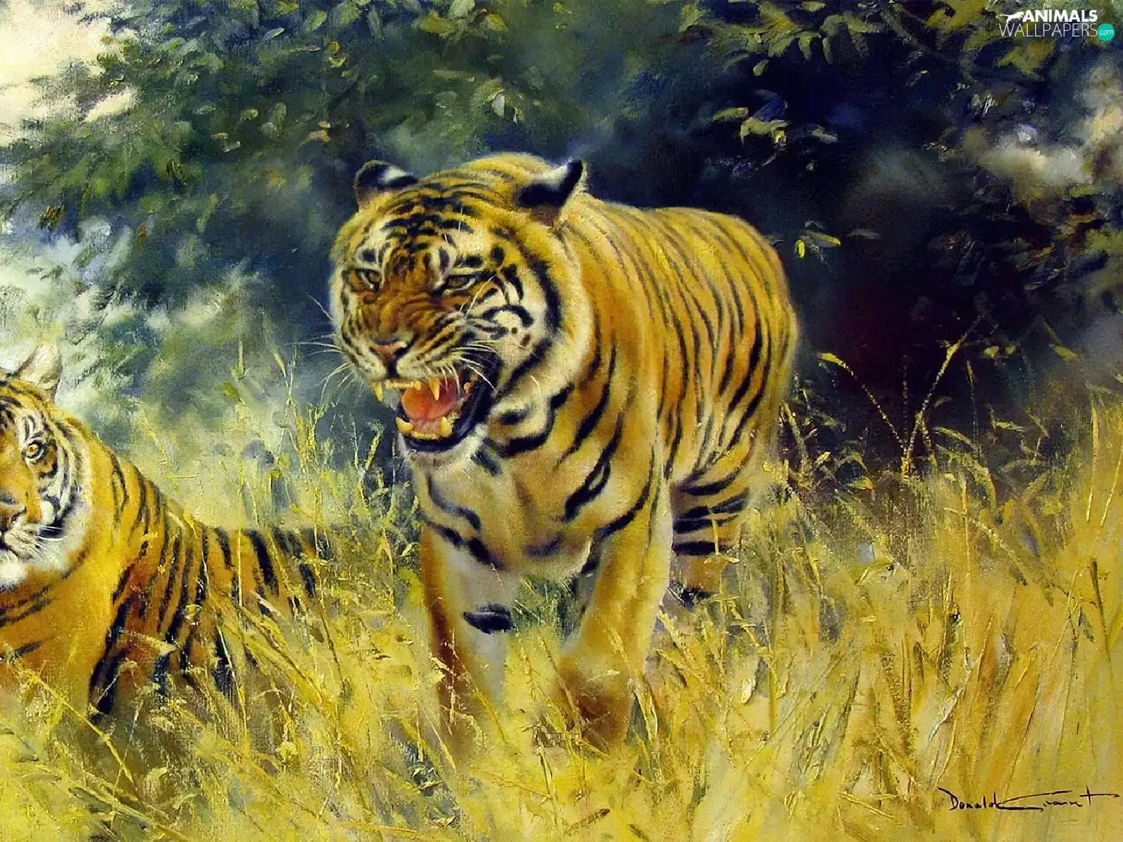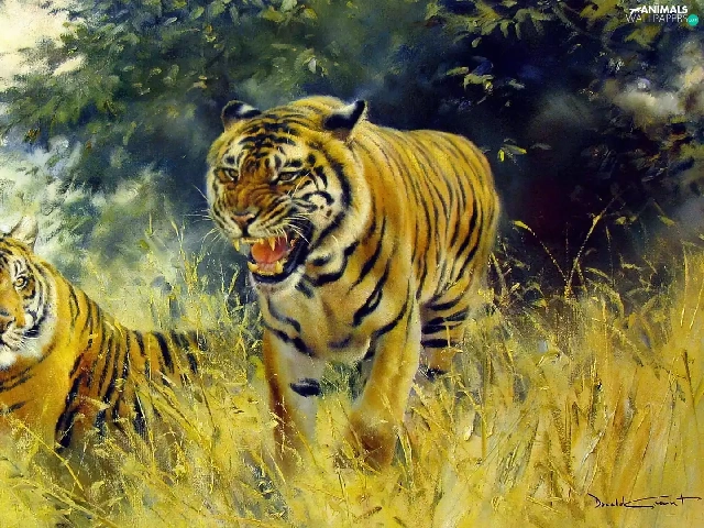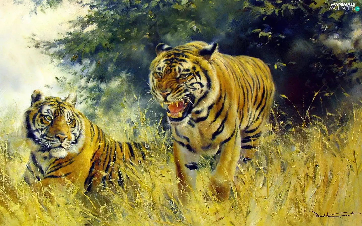 dry, grass, image, trees, copy, tigress, Two cars, viewes