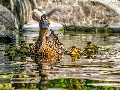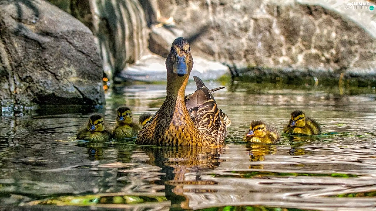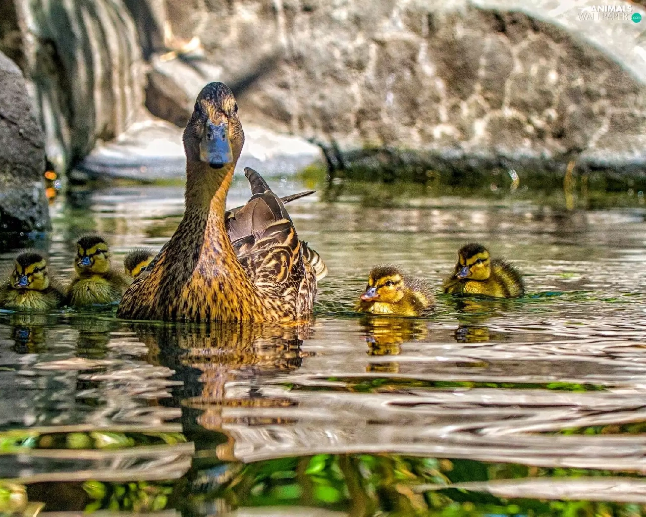 duck, water, reflection, Ducklings