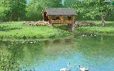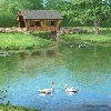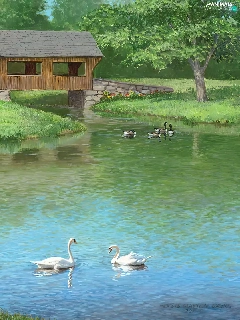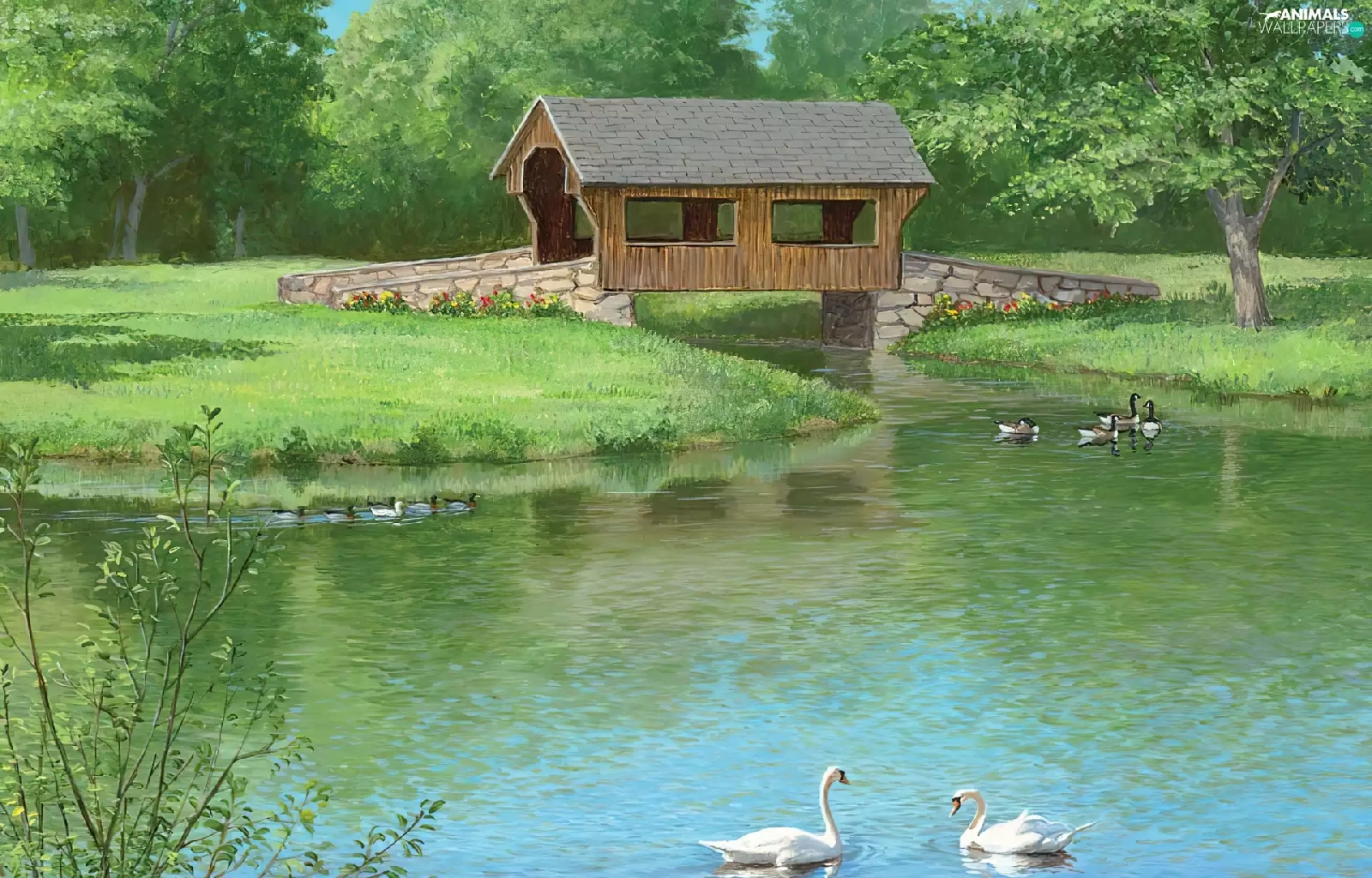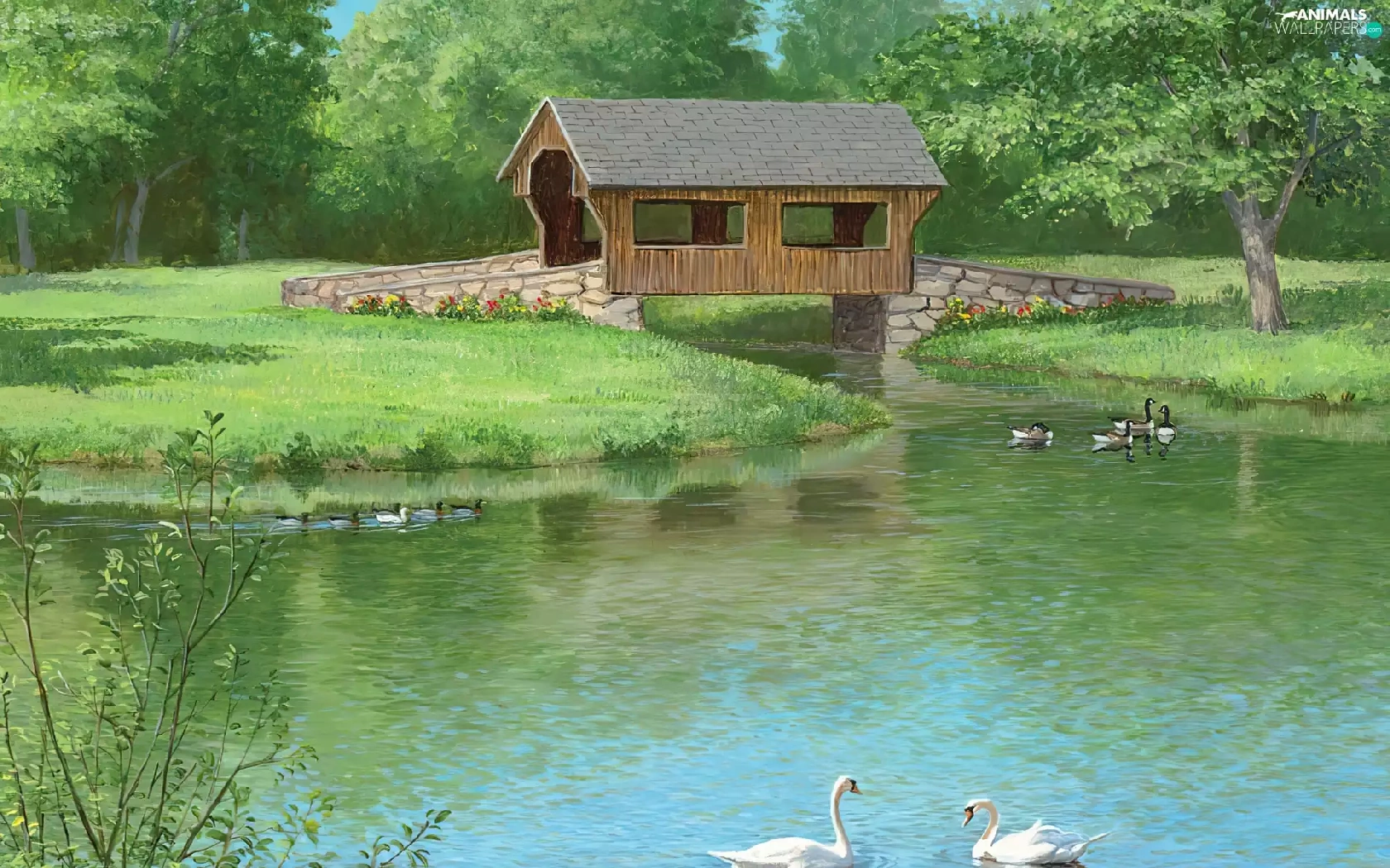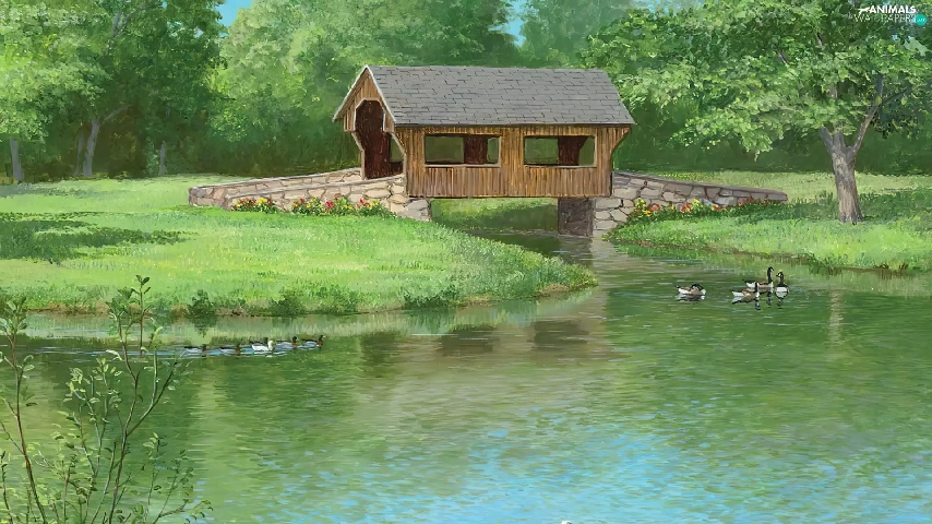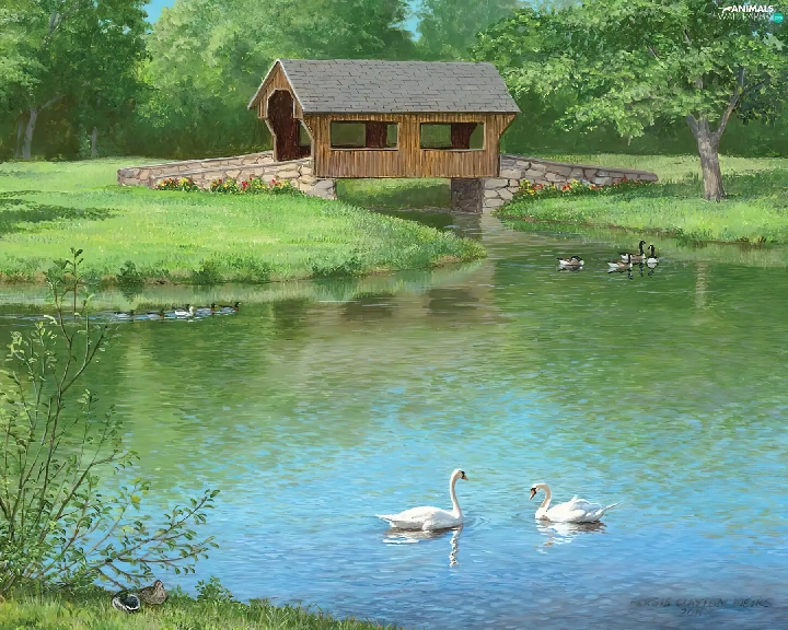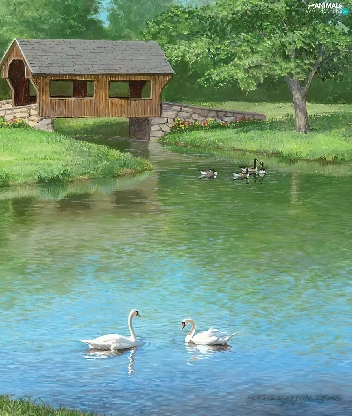 Swan, ducks, bridge, Indoor, lake