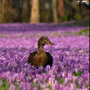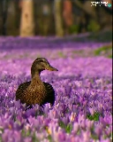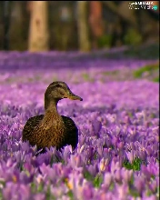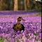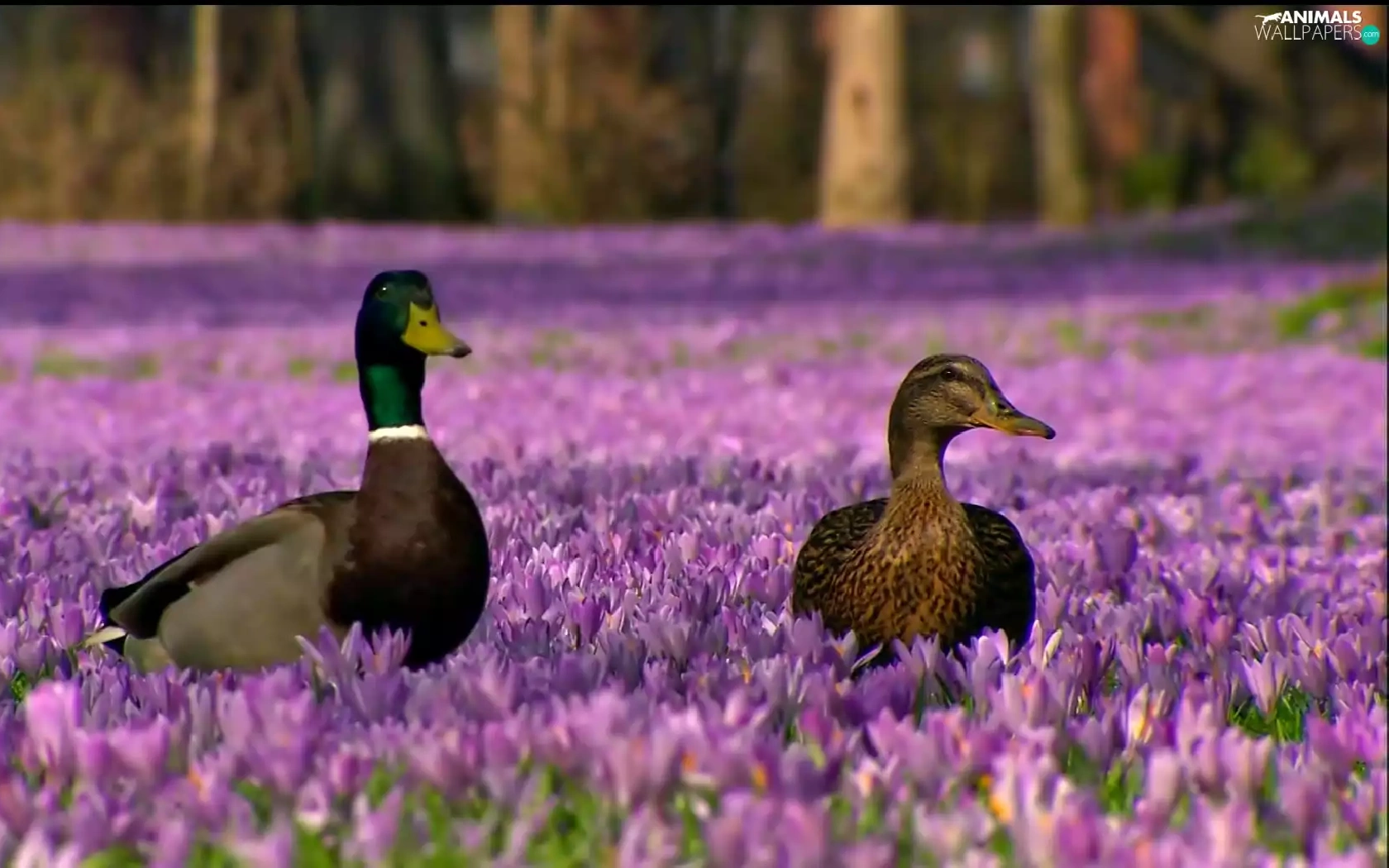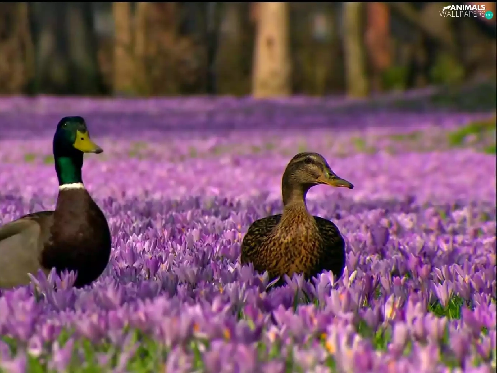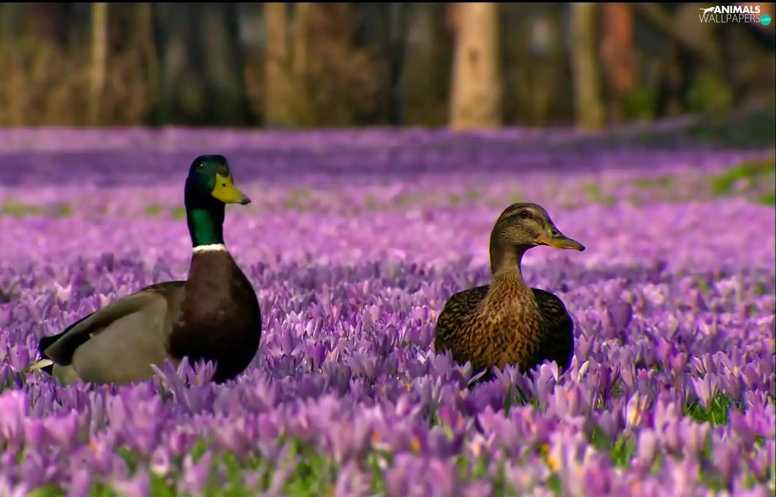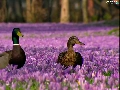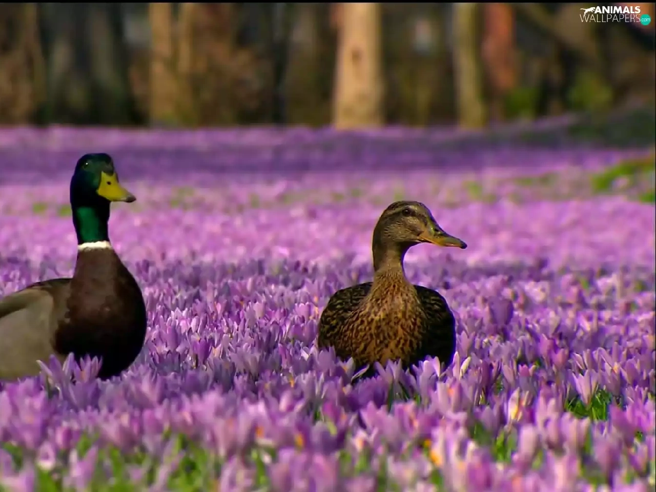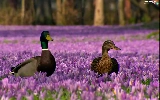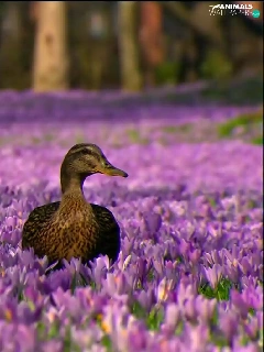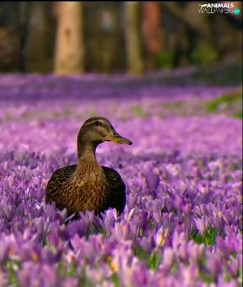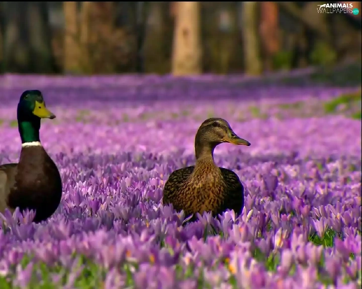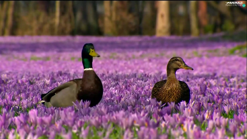 Two, ducks, Flowers, crocuses, purple