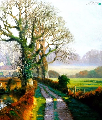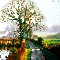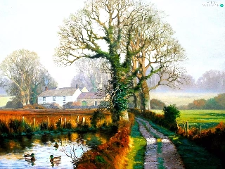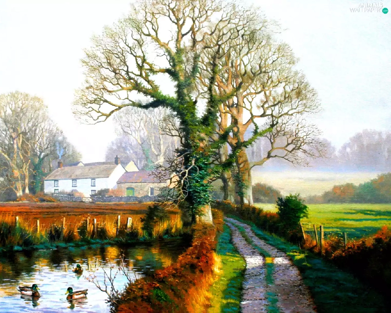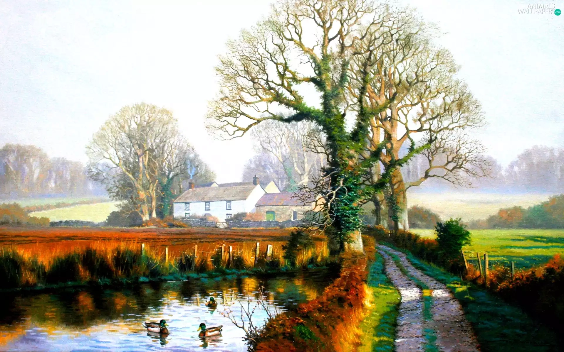 viewes, village, Pond - car, trees, Way, Houses, ducks