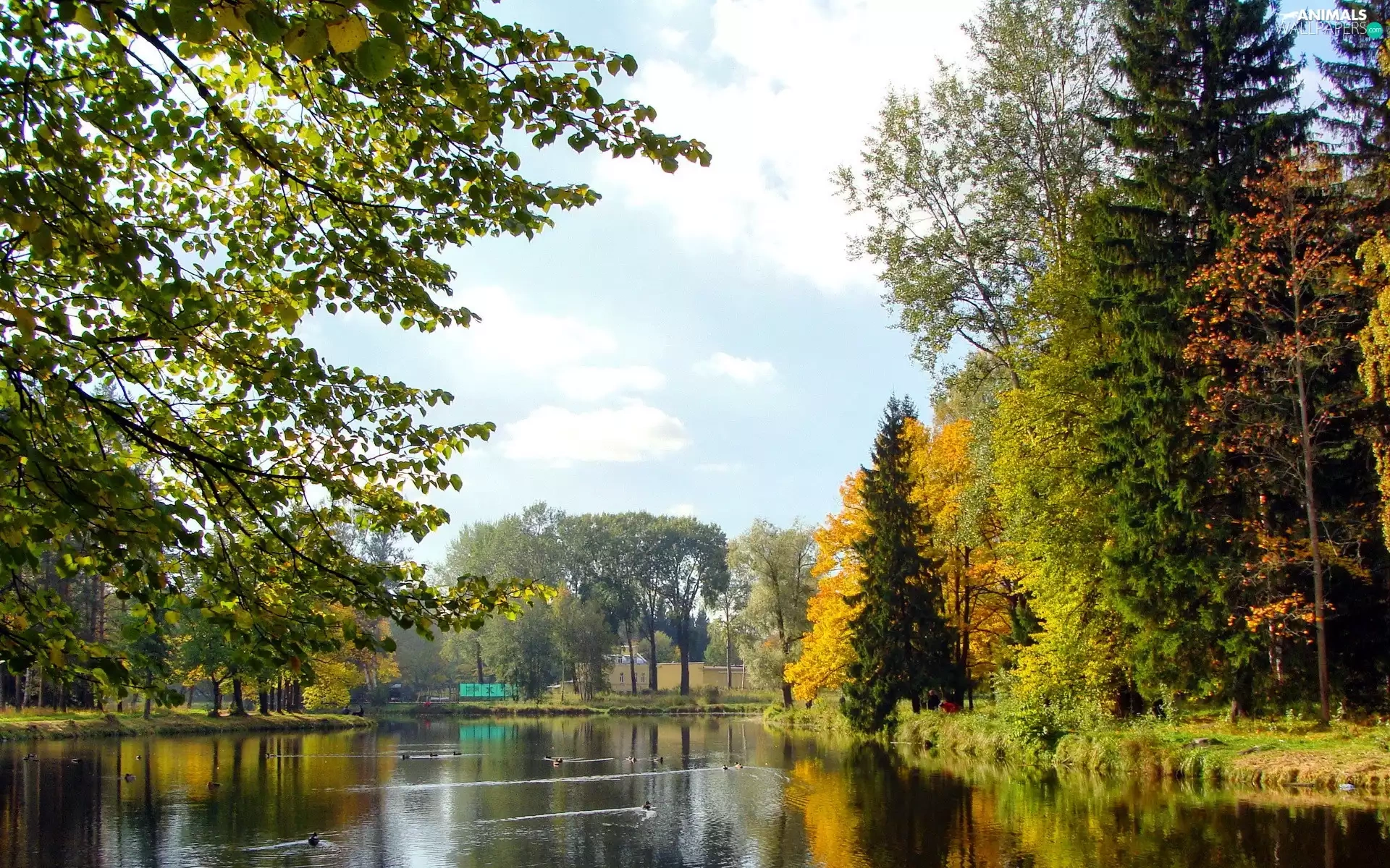 River, Park, autumn, ducks