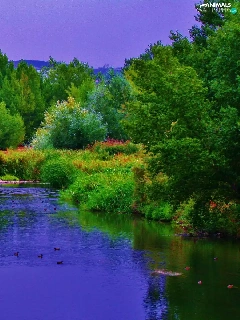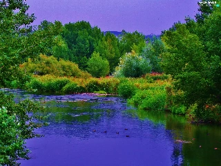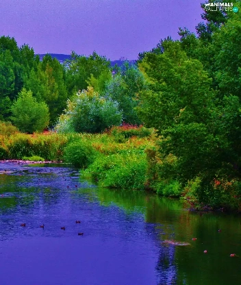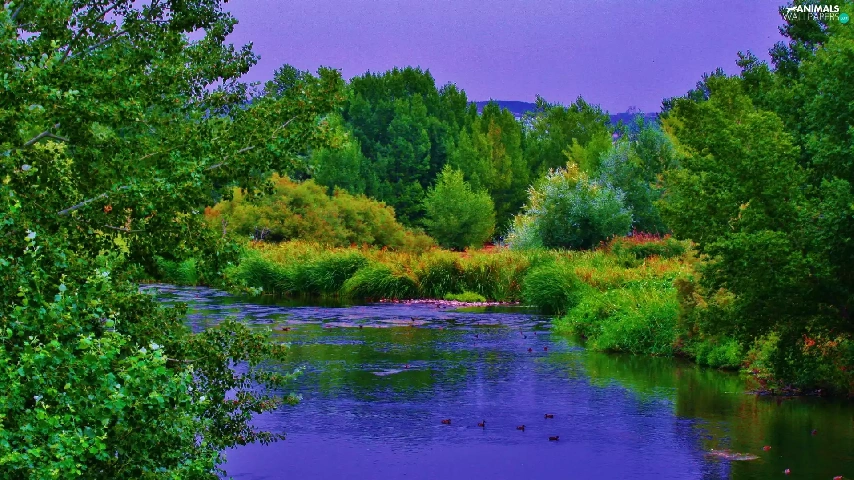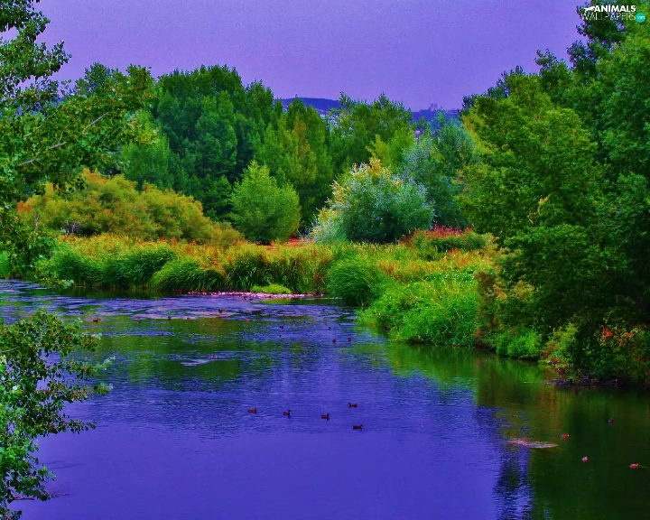 River, forest, Mountains, ducks