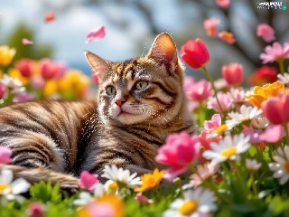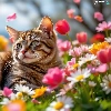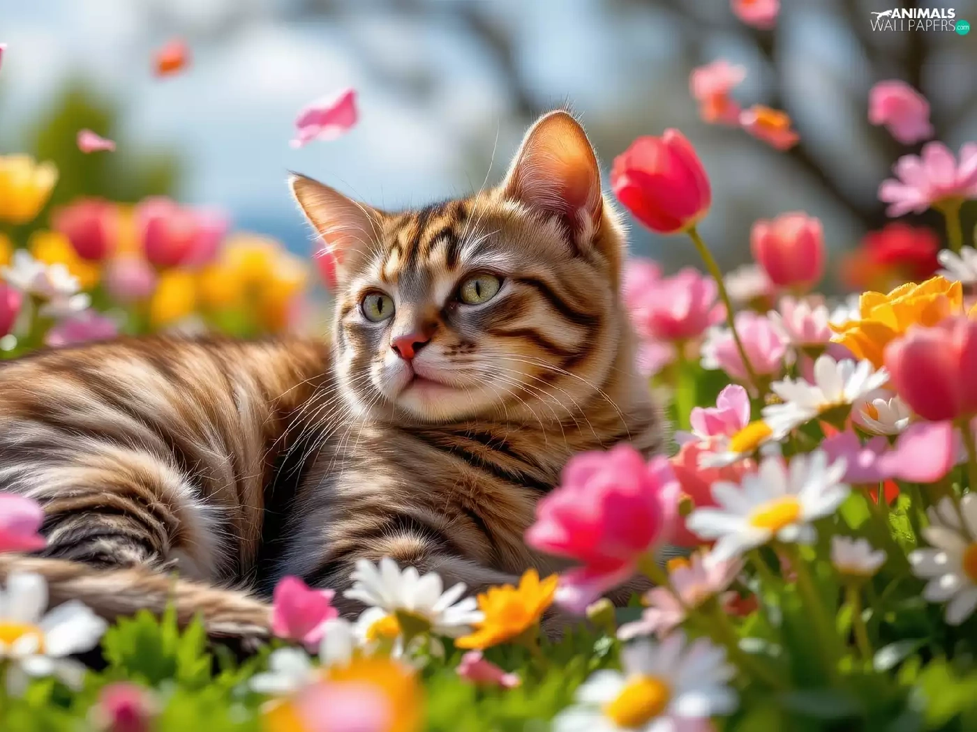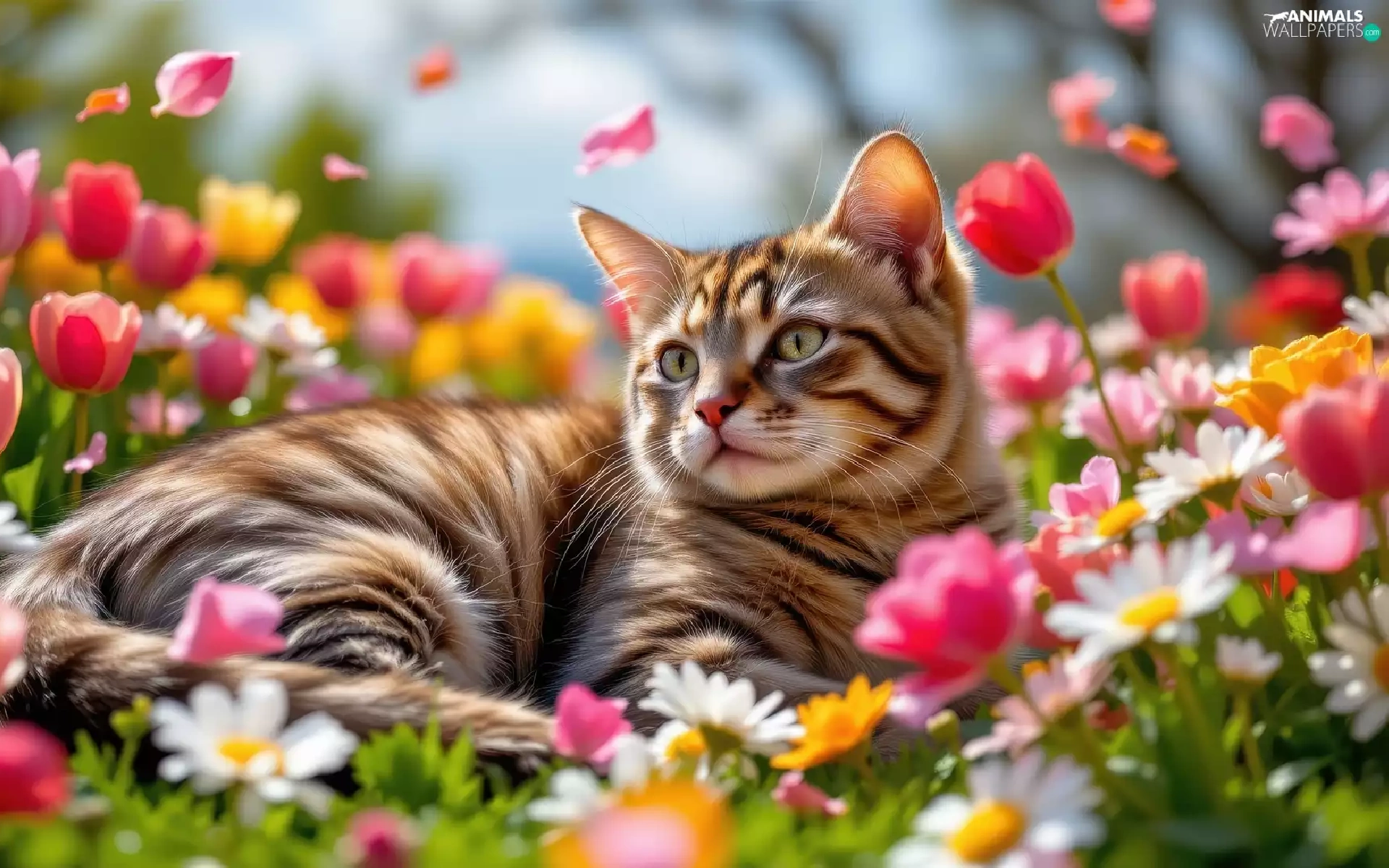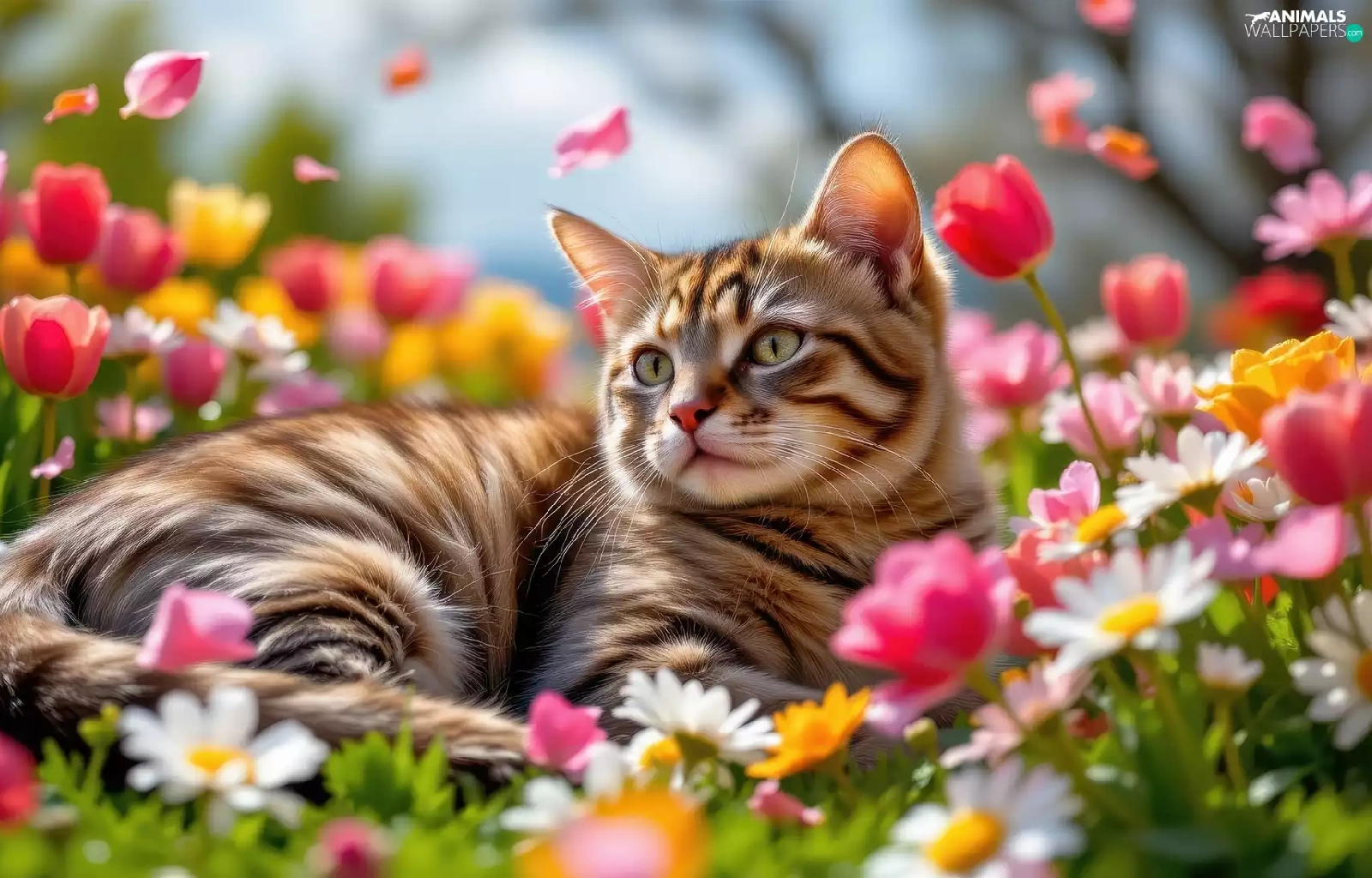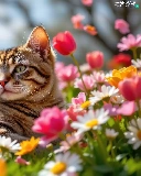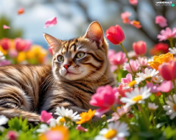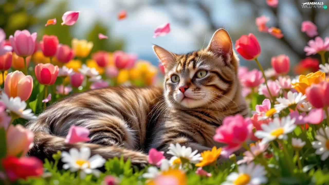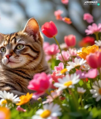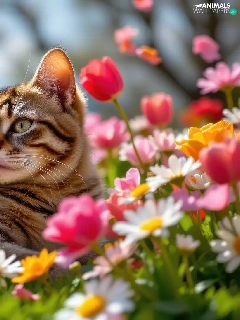 cat, Flowers, Tulips, dun